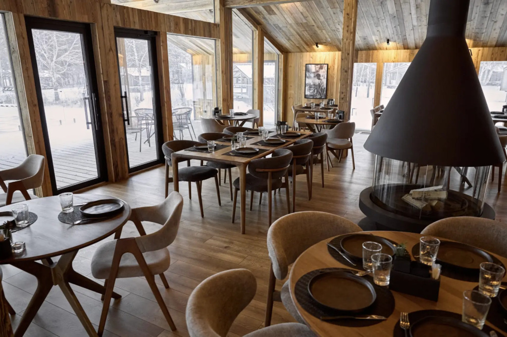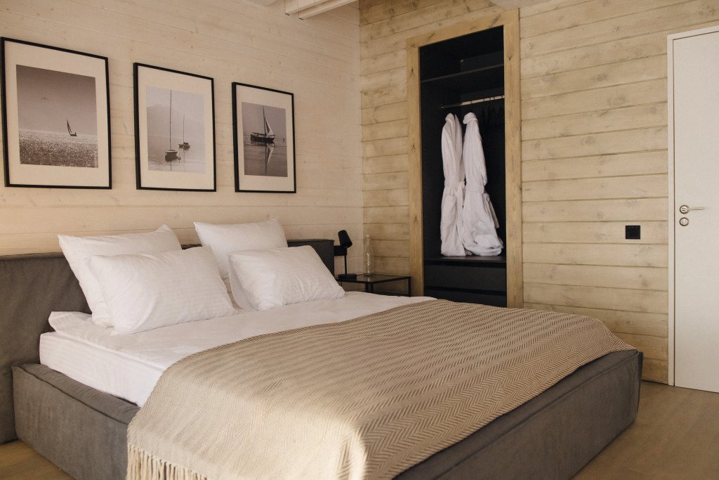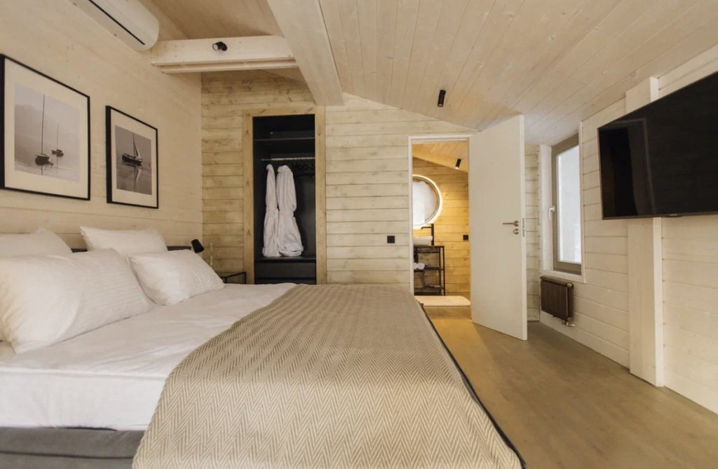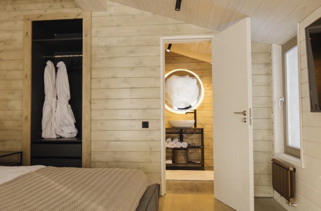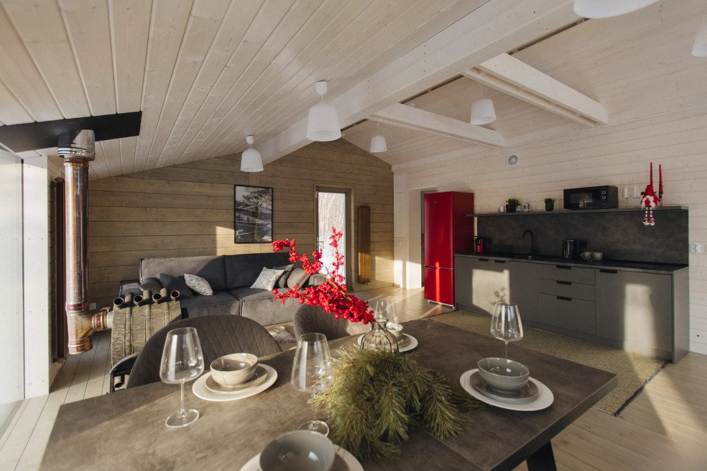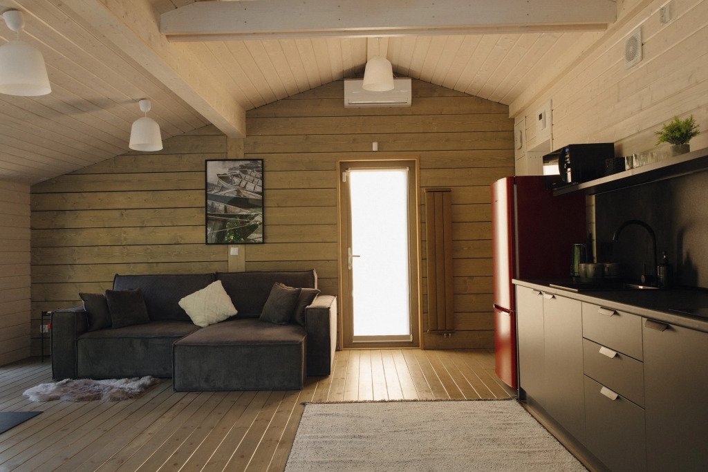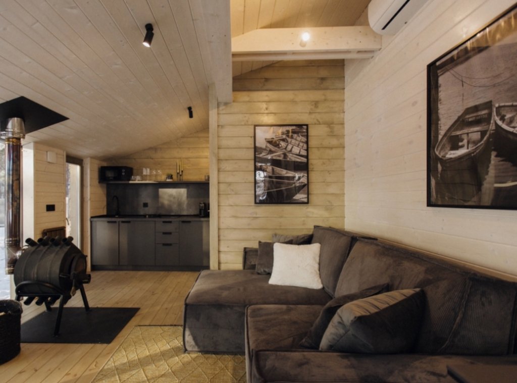 Отель представляет собой комплекс домов. Интерьеры домиков выполнены в стиле шале, с каминами, террасами и панорамными окнами, с использованием натуральных материалов. Каждый дом укомплектован мебелью, кухней, современной бытовой техникой, кондиционерами, текстилем, посудой и необходимым для проживания.