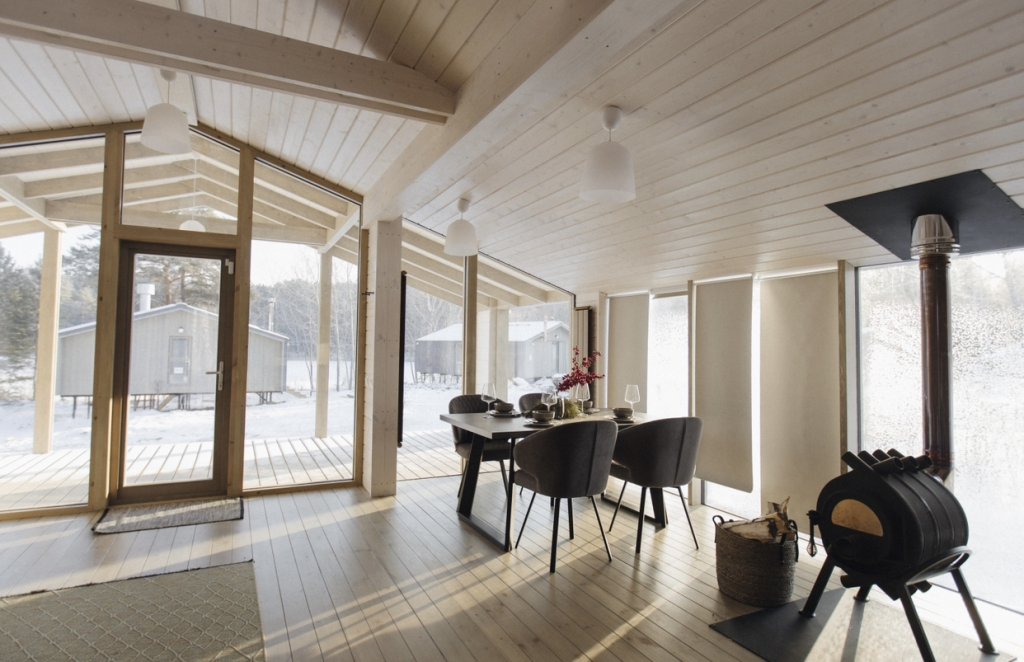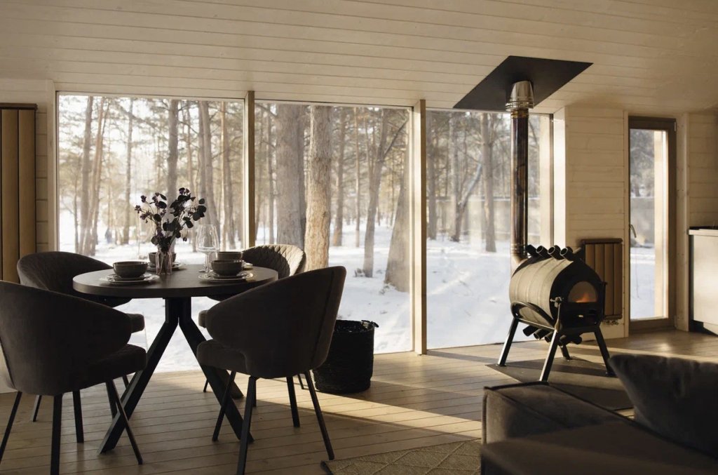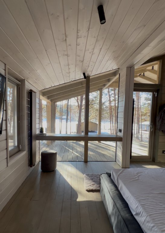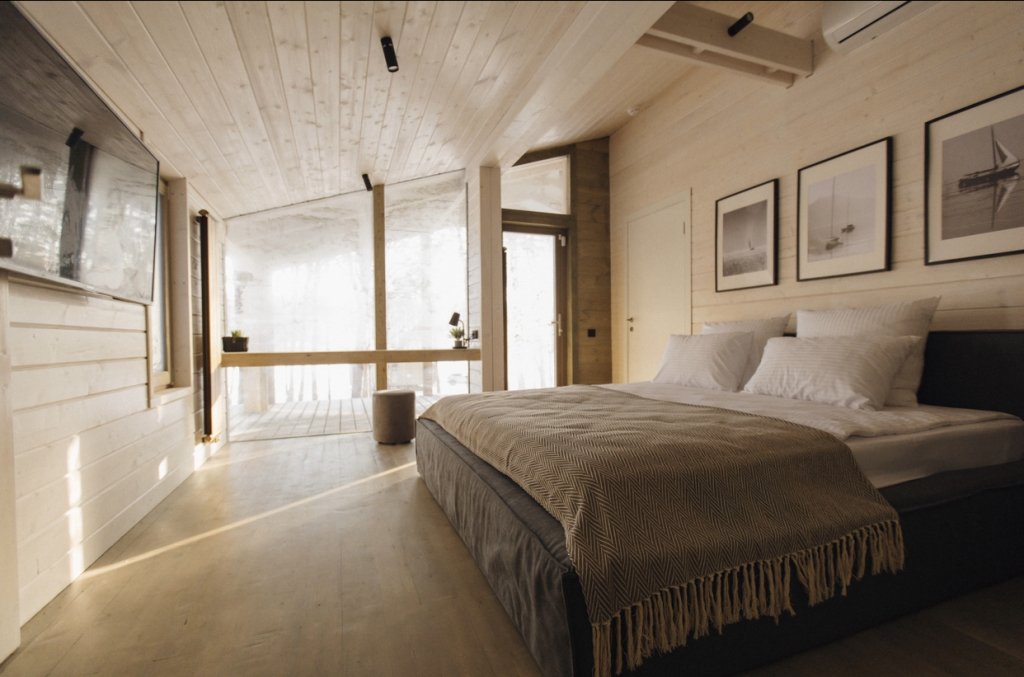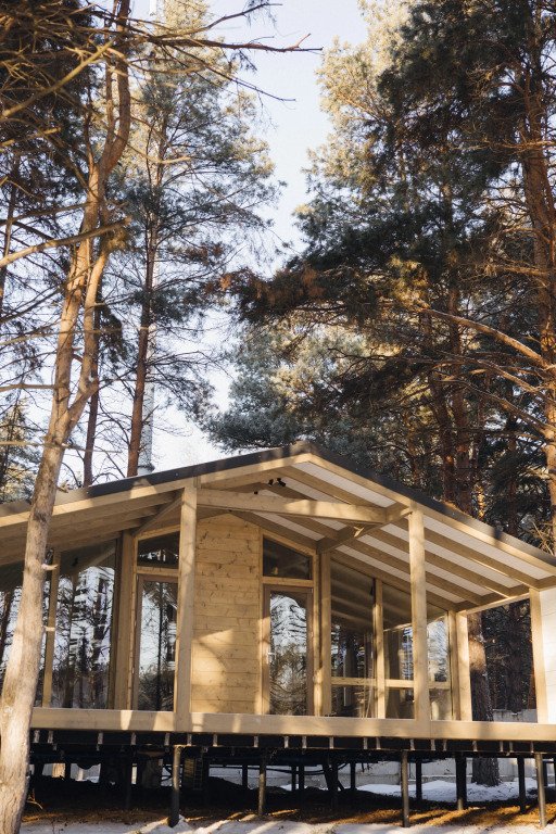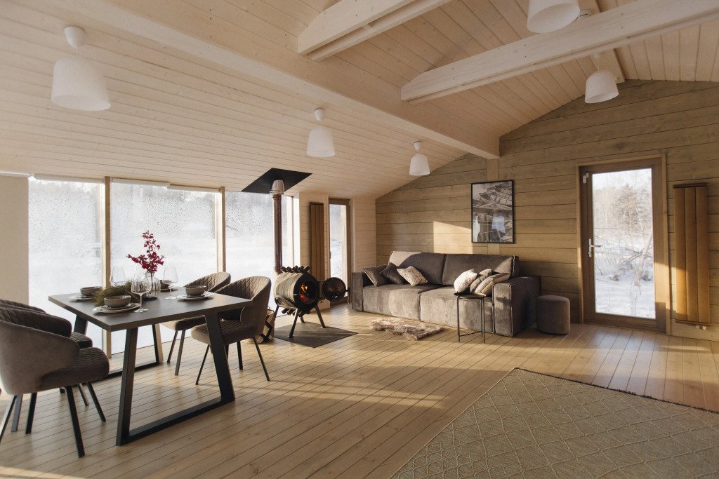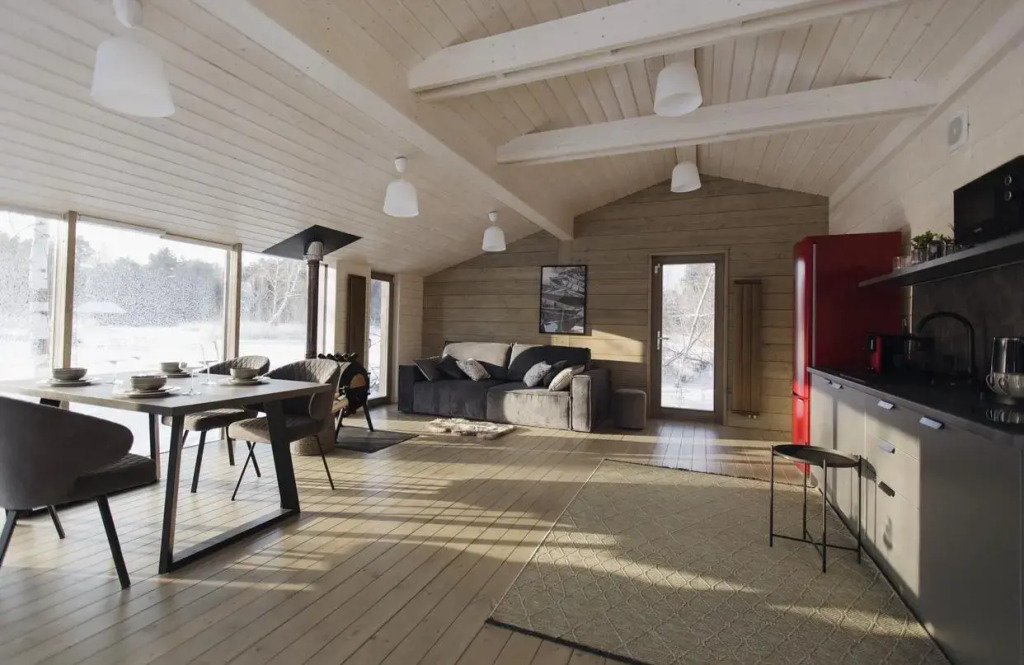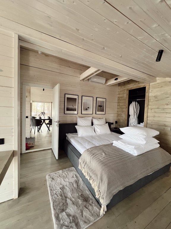 Отель представляет собой комплекс домов. Интерьеры домиков выполнены в стиле шале, с каминами, террасами и панорамными окнами, с использованием натуральных материалов. Каждый дом укомплектован мебелью, кухней, современной бытовой техникой, кондиционерами, текстилем, посудой и необходимым для проживания.