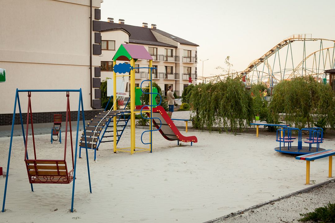 Безопасная и яркая детская площадка оснащена современными игровыми элементами. Здесь дети весело и активно проводят время под присмотром родителей.