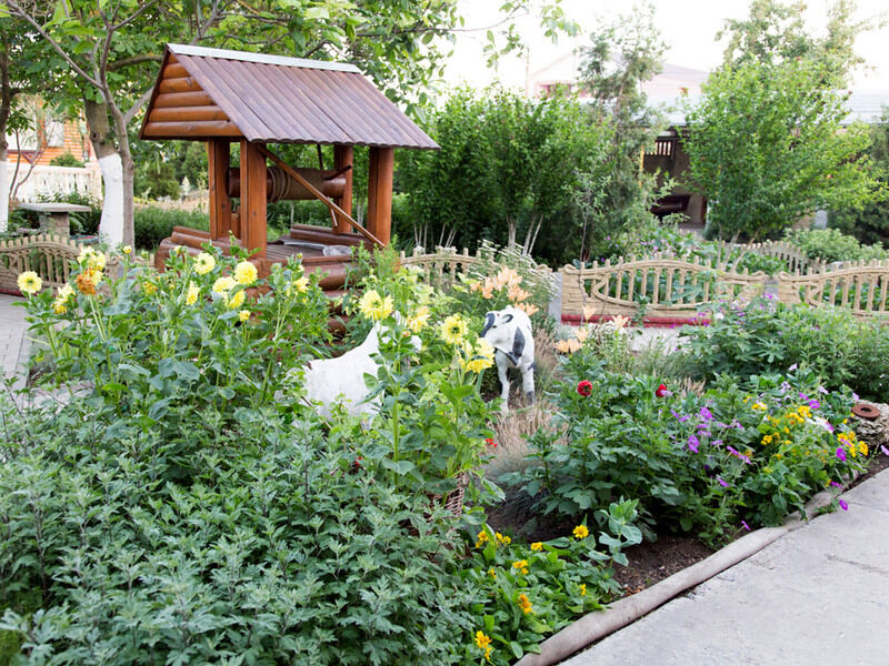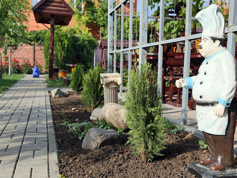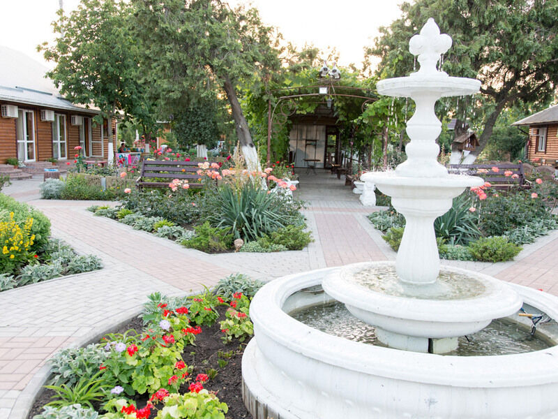 Территория утопает в зелени, это цветущие экзотические растения, различные рокарии, клумбы, миксбордеры, розарии в сочетании с малыми архитектурными садовыми объектами, фонтанами, местами отдыха. Для отдыхающих обеспечены места для селфи и фотосессий.