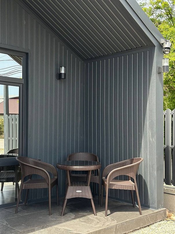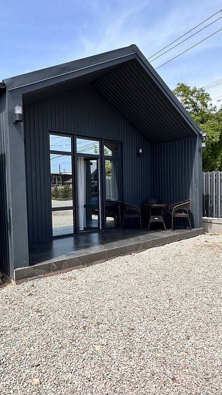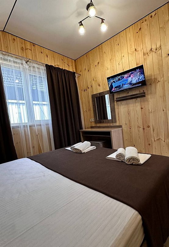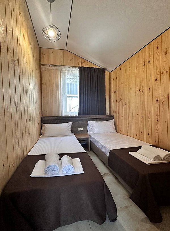 Четырехместный домик площадью сорок квадратных метров с видом во двор. Подходит для размещения пяти человек (четыре основных места и одно дополнительное).