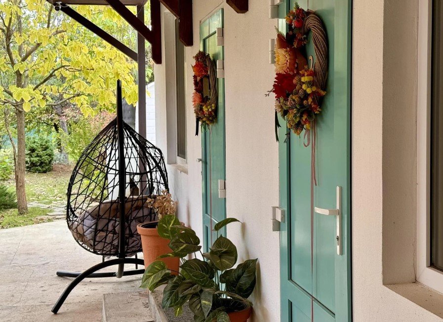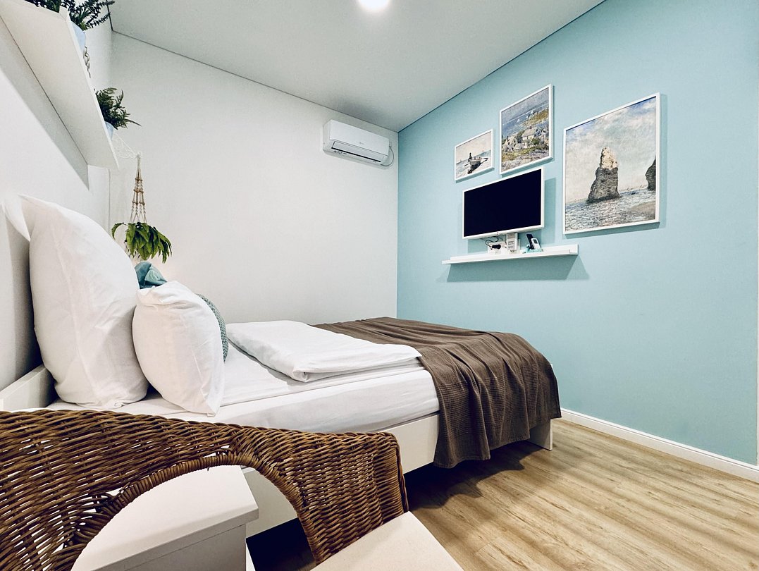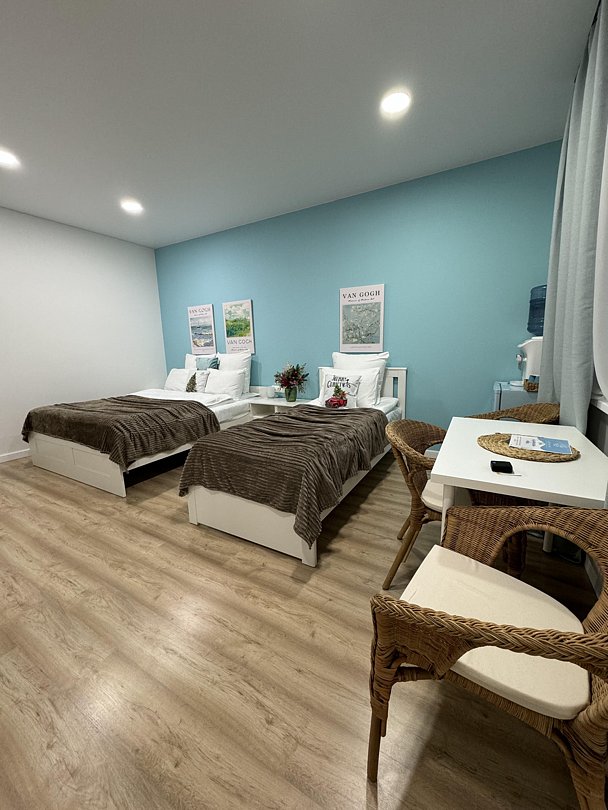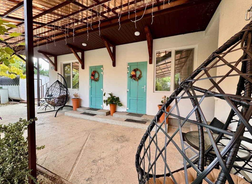 В каждом номере комфортабельная кровать king-size с ортопедическим матрасом и комфортабельными подушками. В распоряжении гостей есть удобная рабочая зона со столом и креслом. Гостевой дом подойдет как для длительного пребывания, так и для романтического отдыха или поездки с друзьями. Расстояние до песчаного пляжа 750 м. Есть свой парк с реликтовыми деревьями.