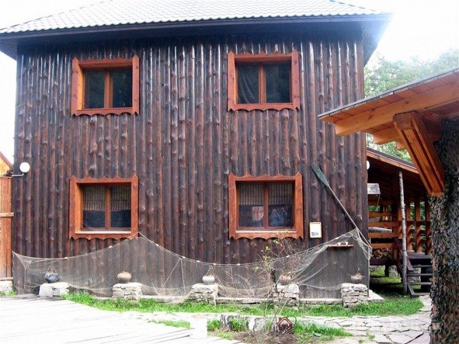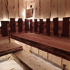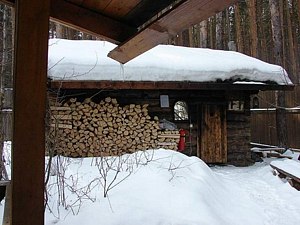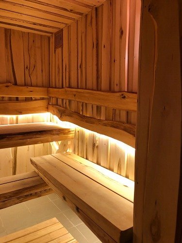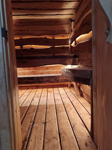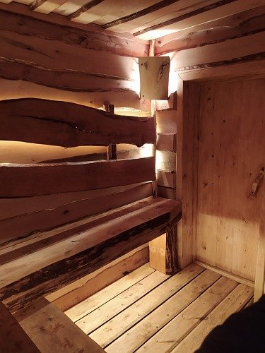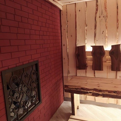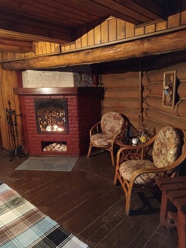 Инфраструктура: купель, зона отдыха, простыни, душБревенчатая избушка, где совмещены парная и моечная. Помещение обогревается от открытого огня, трубы нет.