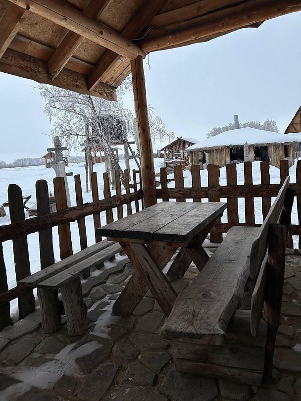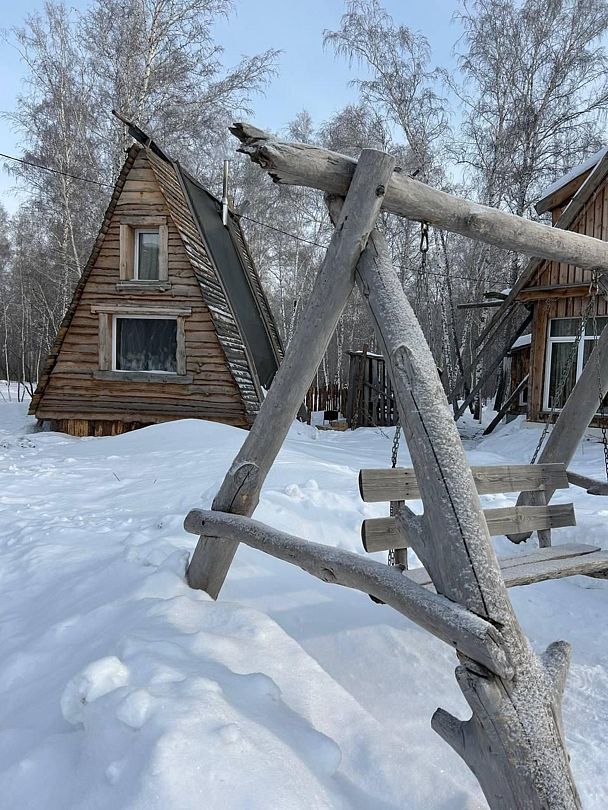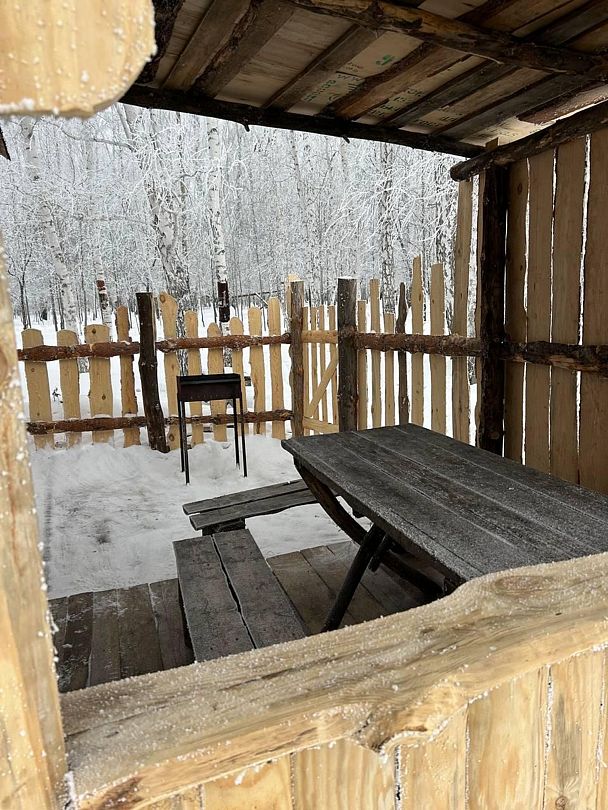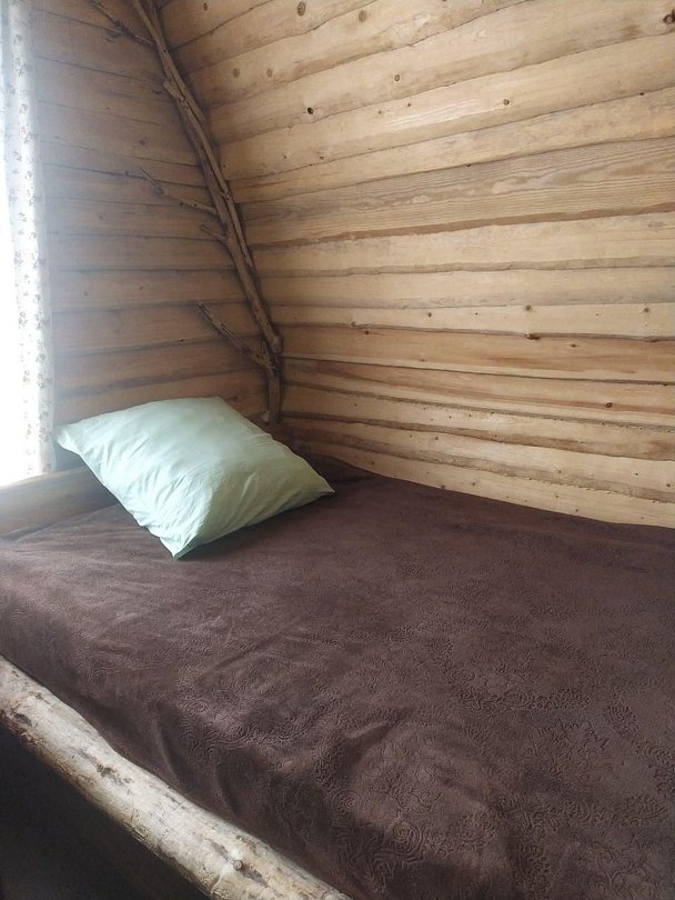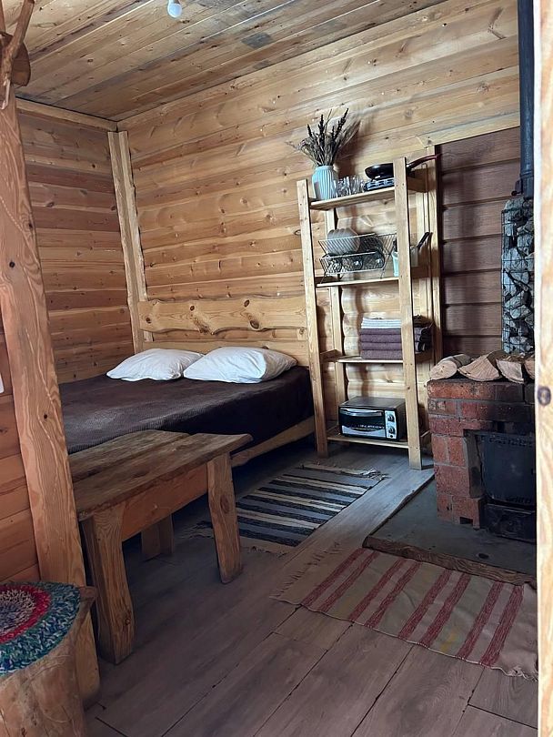 В домике: печное отопление, теплый пол. Душ, туалет, постельное бельё, полотенца, посуда, холодильник, мини-печь.