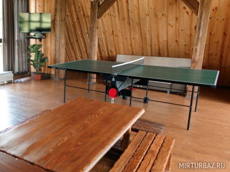 На втором этаже находится комната отдыха с удобными диванами, телевизором и столом для пинг-понга. Пользование столом для тенниса входит в аренду банного комплекса.