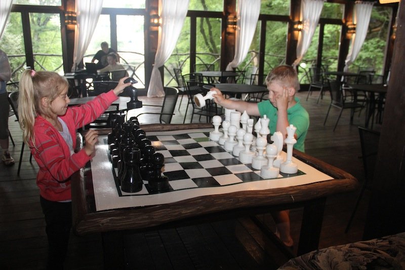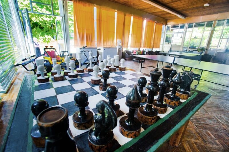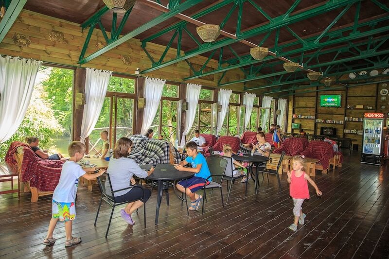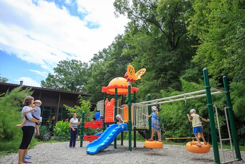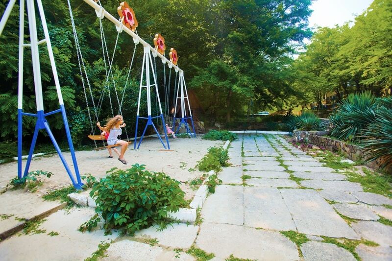 Дети в пансионат принимаются с 0 лет, до 12 лет им предоставляются скидки. На территории пансионата есть современная детская площадка с качелями.