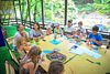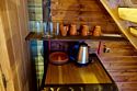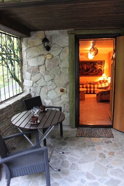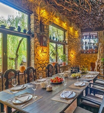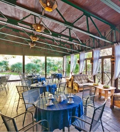 Для отдыхающих, которые размещаются в номерах класса стандарт и стандарт плюс предлагается питание в просторном верхнем зале «Звездная трапеза» по системе Шведский стол. Для тех, кто размещается в классе гостевые семейные, экологические и студии - питание в «Гостиной у камина» по программе шведский стол, столы сервируют в нижнем зале или на открытой террасе. Каждый вечер живой огонь у очага и свечи. За дополнительную плату можно заказать прохладительные напитки, пиво, мороженое.