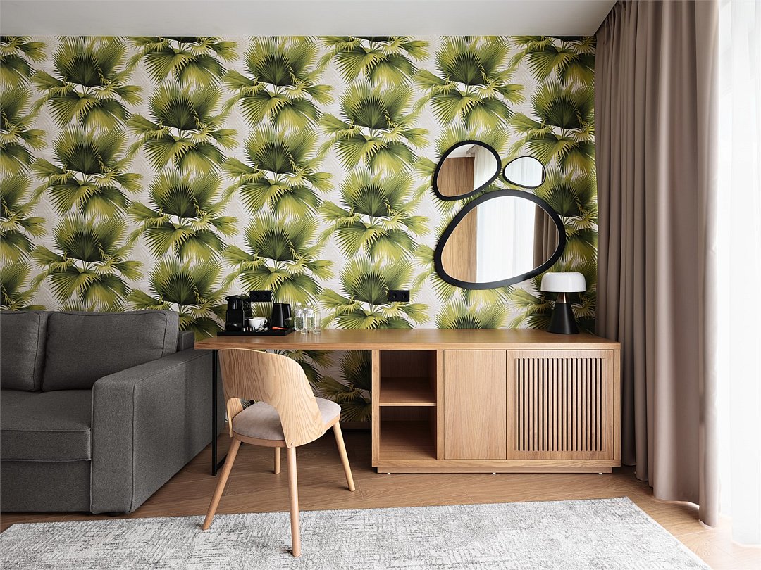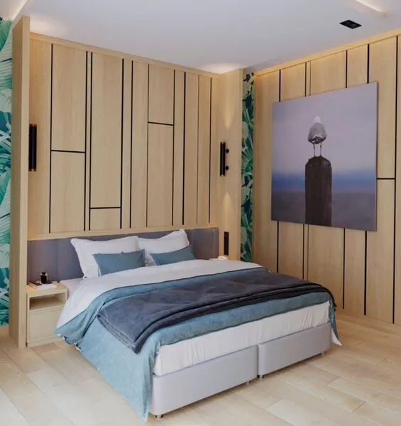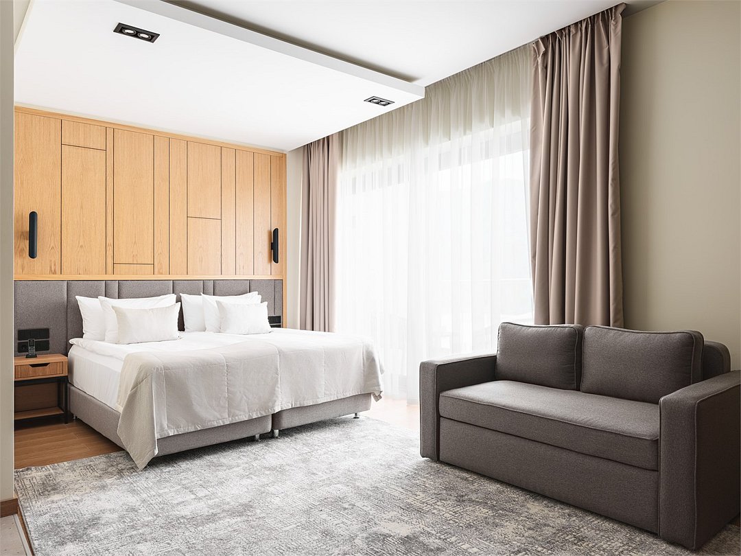 Номер повышенной комфортности с большой 2-спальной кроватью, двуспальным диваном и панорамным окном отлично подойдет для размещения, как индивидуальных гостей, так и семьи до 5 человек. Номер имеет зонирование, отделяющее спальную зону от зоны отдыха. Размещение пятого человека возможно на кресле-кровати.Услуги и удобства