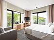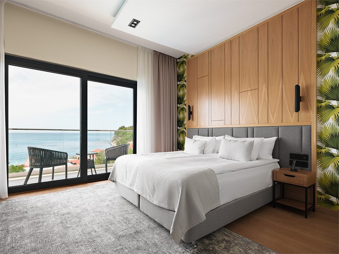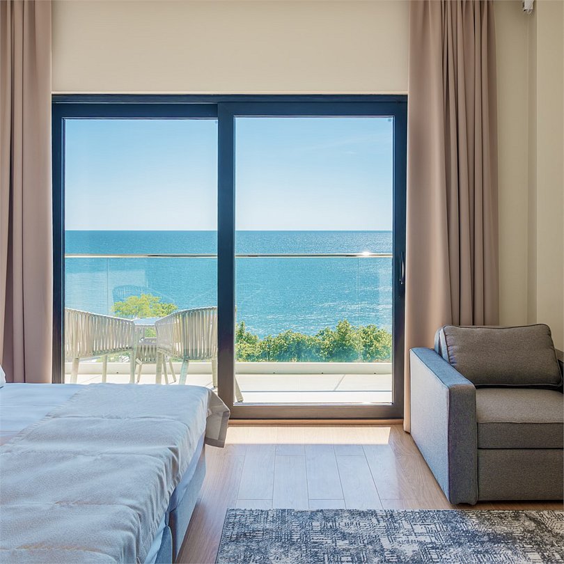 Номер повышенной комфортности с большой 2-спальной кроватью, двуспальным диваном и креслом-кроватью отлично подойдет для размещения, как индивидуальных гостей, так и семьи до 5 человек. Номер имеет балкон, панорамное остекление с видом на море. Номер имеет зонирование, отделяющее спальную зону от зоны отдыха.Услуги и удобства