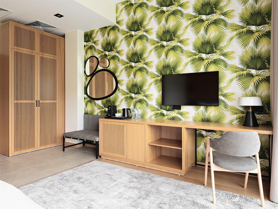 Отель располагает светлыми номерами с современным интерьером и удобными кроватями. Для комфортного проживания установлен кондиционер, есть телевизор и санузел с туалетно-косметическими средствами, а также предоставляется халат и одноразовые тапочки.