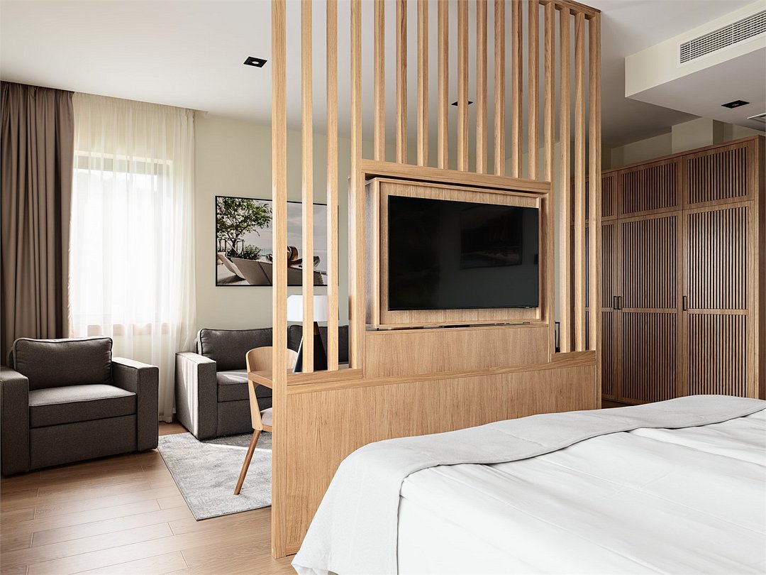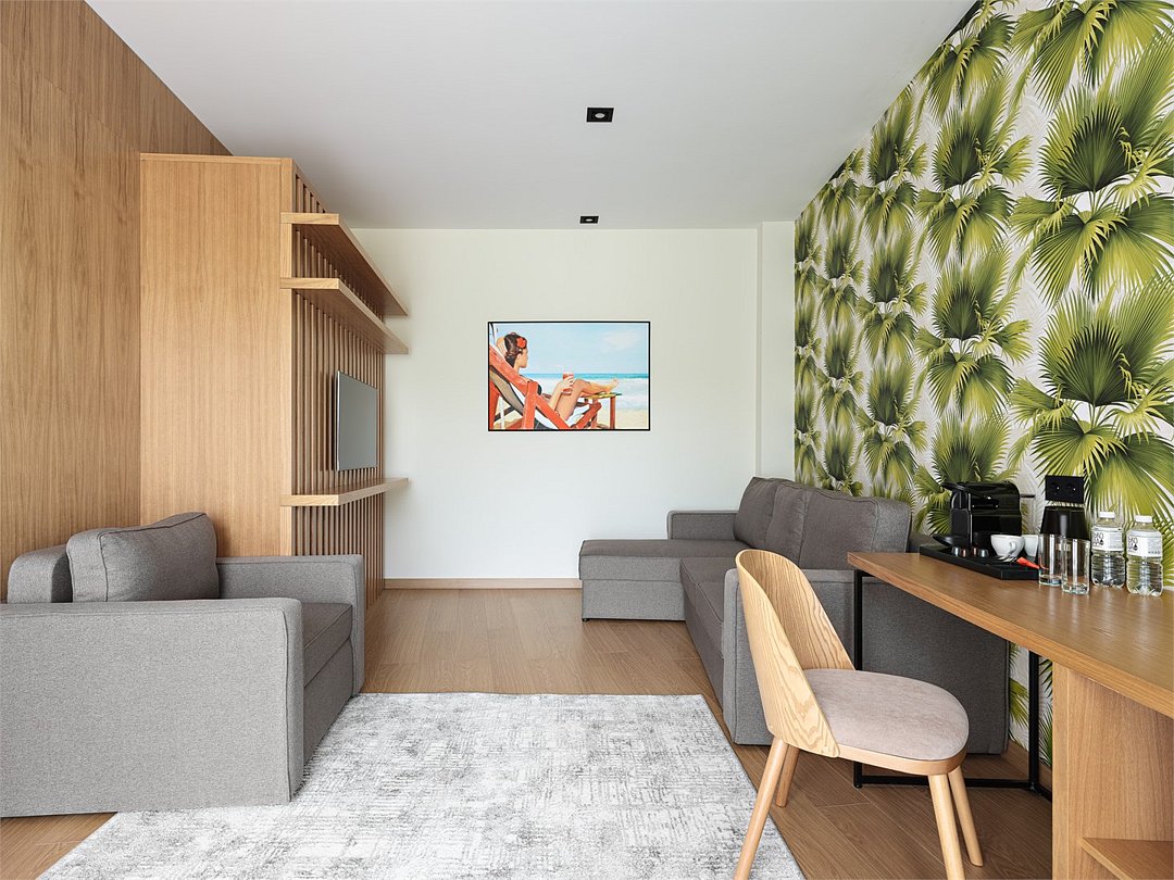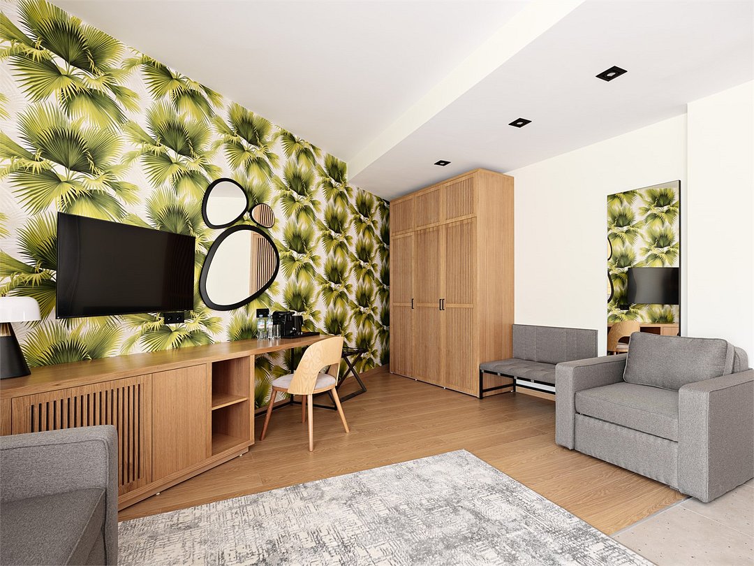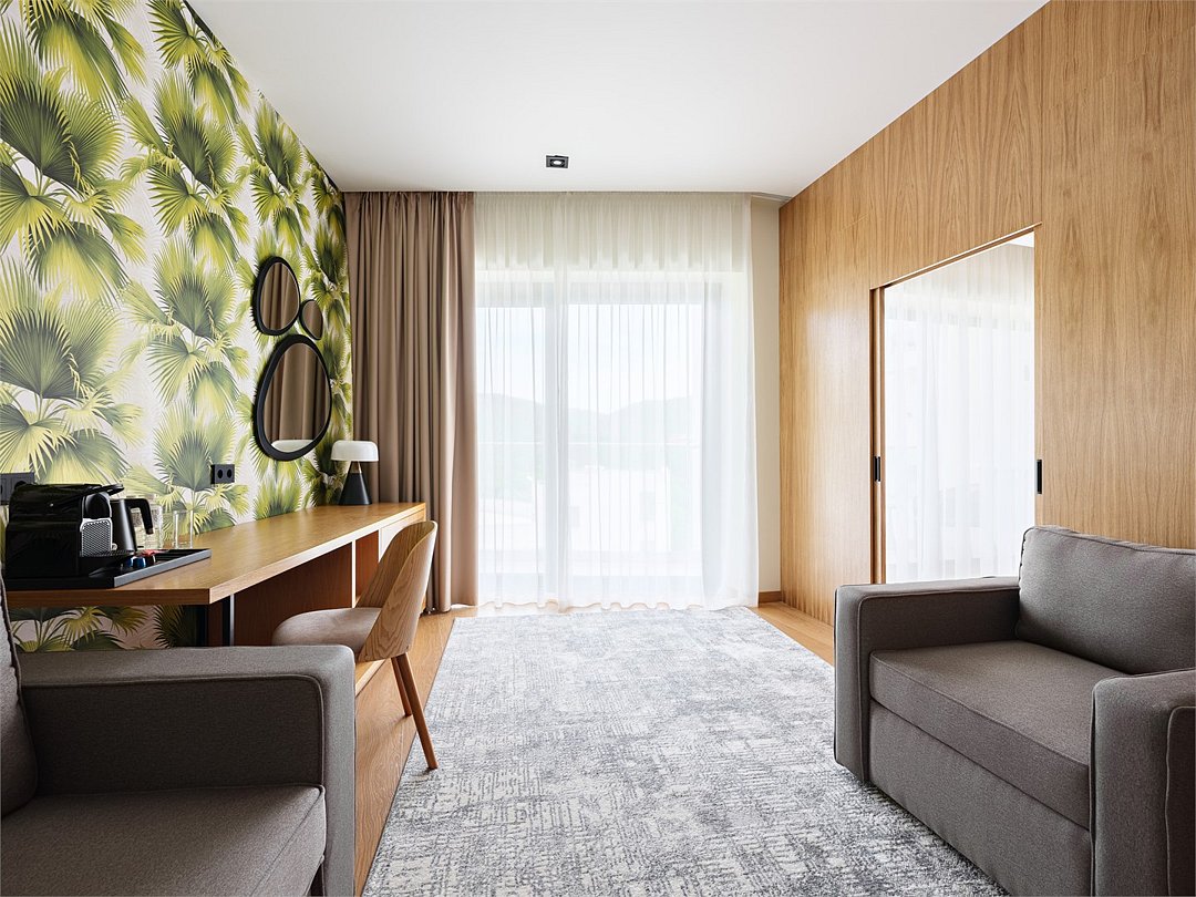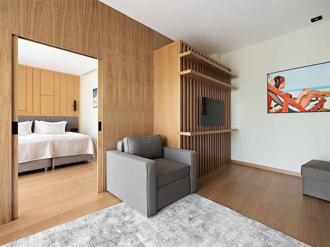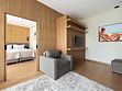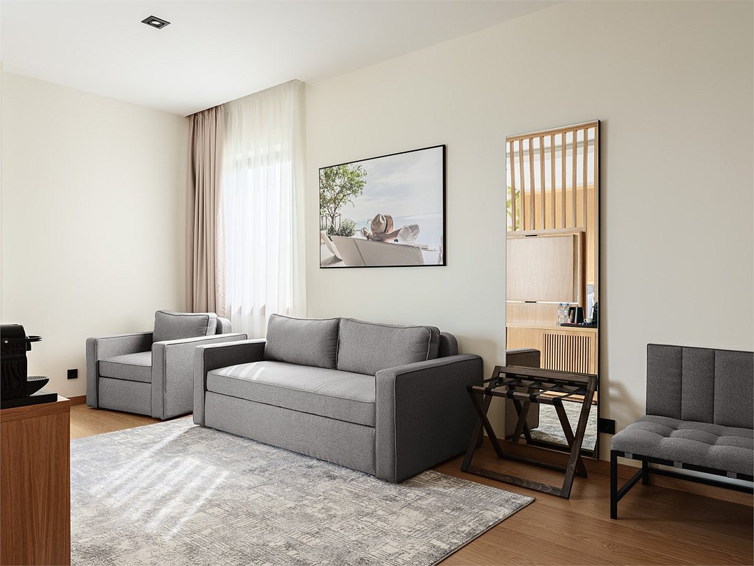 Просторный номер из двух зон идеально подойдет для большой семьи. В номере имеется все необходимо для комфортного проживания - двуспальная кровать, двуспальный диван и кресло-кровать.Услуги и удобства
