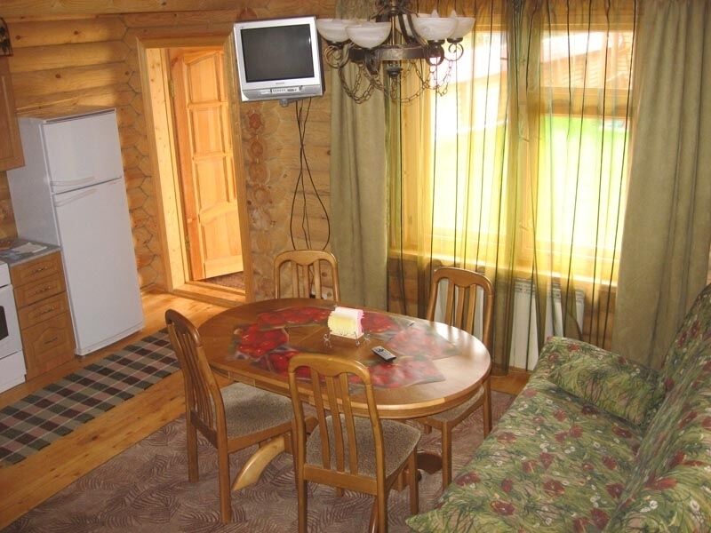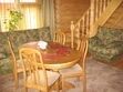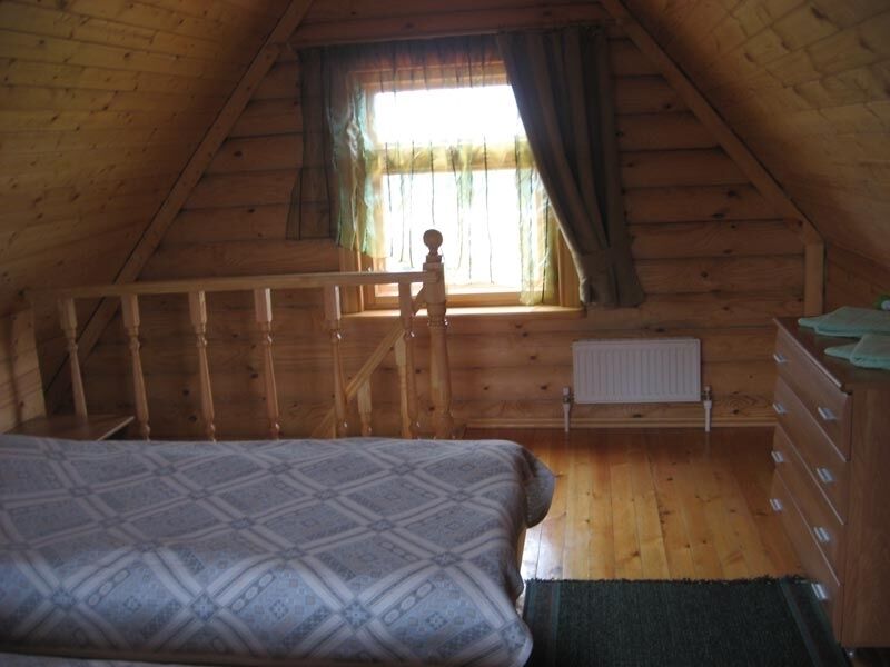 Располагает просторной гостиной с телевизором, раскладным диваном и креслом на первом этаже. Кухня, оснащенная кухонным гарнитуром, электрической плитой, холодильником, раковиной (гор. и хол. вода), посудой, кухонным столом и стульями, совмещена с гостиной. На этом же этаже имеется санузел (душевая кабина и туалет). На 2м этаже находится спальня с 2мя полуторными кроватями. Отдохнуть можно и на уютной веранде, оборудованной пластассовым столиком и креслами. Все дома с верандами, оборудованными пластмассовыми столами и креслами.