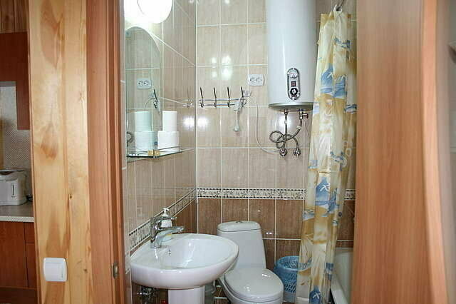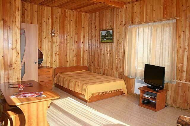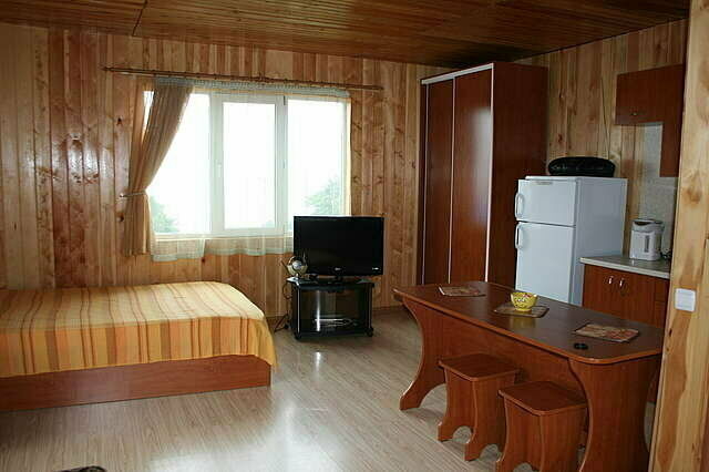 В каждом номере: санузел, встроенная кухонная зона, обеденная зона, двуспальная кровать, прихожая, телевизор.