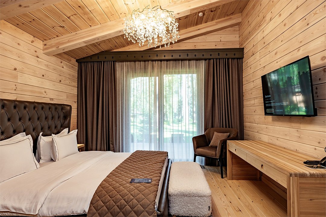 Wi-Fi, кондиционер, система климат-контроля, светильник, настольные лампы, фен, утюг, душевая кабина, санузел, теплый пол, халаты, банные полотенца, тапочки, косметические средства, балкон, кровать «King size», гладильная доска, шкаф для одежды, вешалки, зеркало, обслуживание номеров, информационная карта, меню, сейф, чайник, раковина, ковровое покрытие, отопление, душ, меню подушек, стаканы, стул, тумба, туалетные средства, туалет, внутренний телефон, телевизор с плоским экраном, вид на горы, рабочий стол, чайная станция, набор для приготовления чая и кофе, вешалки-плечики, бутилированная вода, мини-бар (платно), мыло, затемняющая штора, дождевой и ручной душВ гостиничном номере