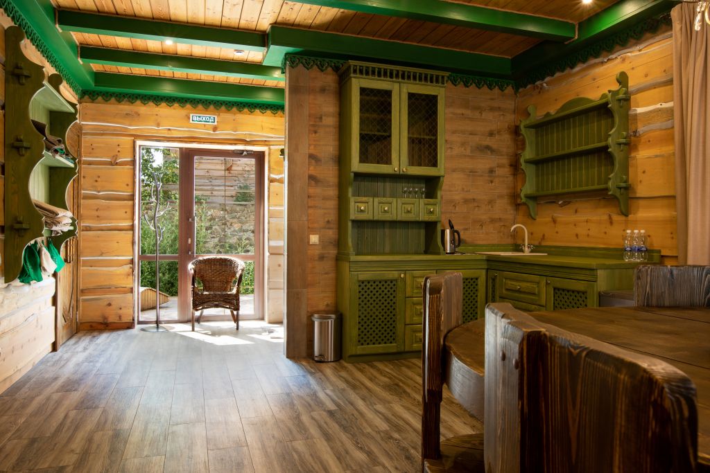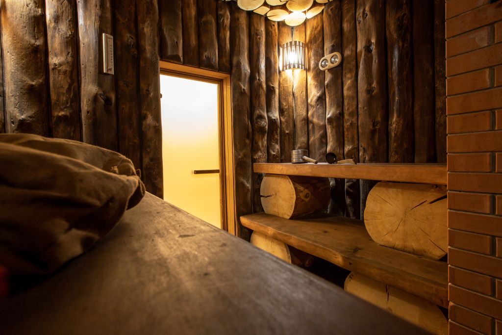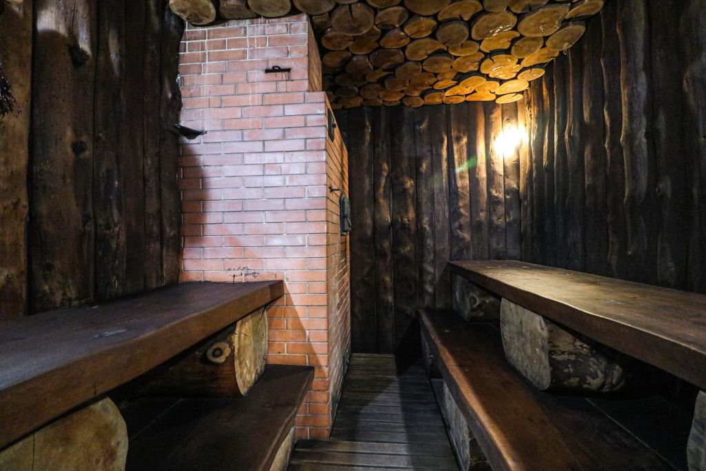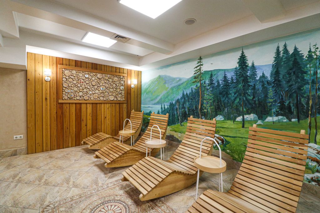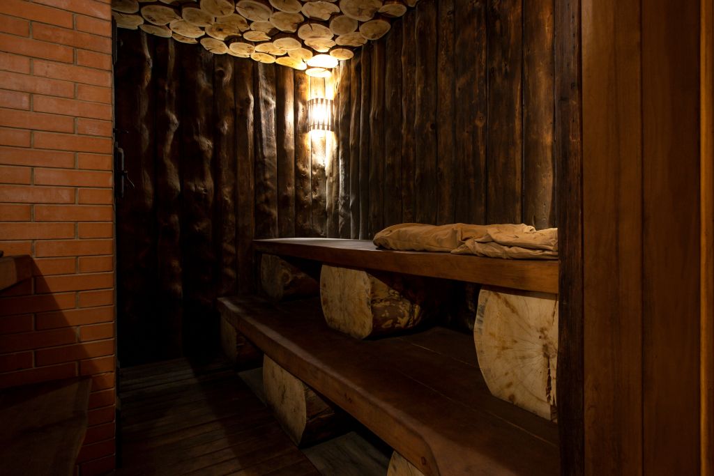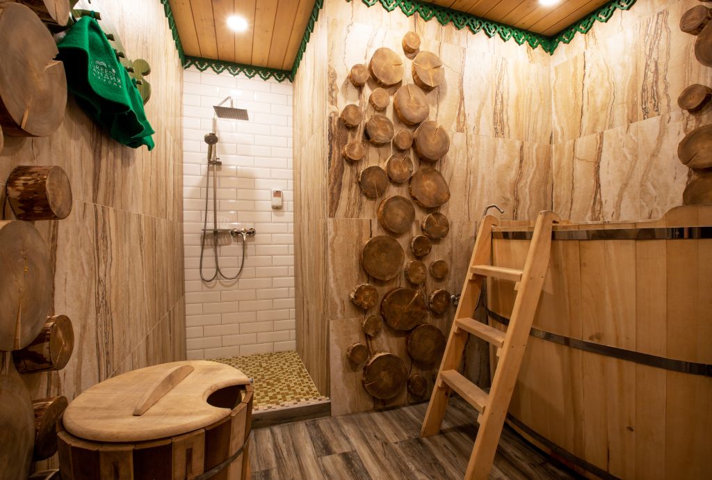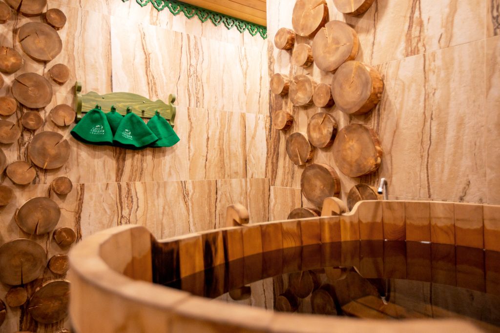 Благодаря открытой каменке пар получается сухим и горячим. Подойдет тем, кто любит по-настоящему прогреться в парилке и расслабиться. Здесь все продумано, чтобы отдых был максимально атмосферным — ушаты с холодной водой, шезлонги, чай с алтайскими луговыми травами.