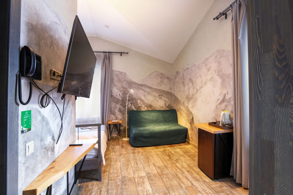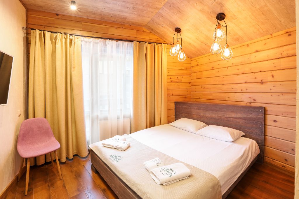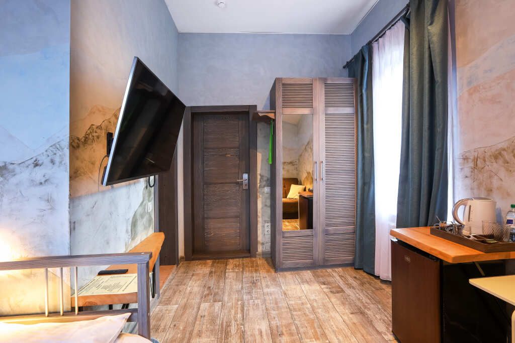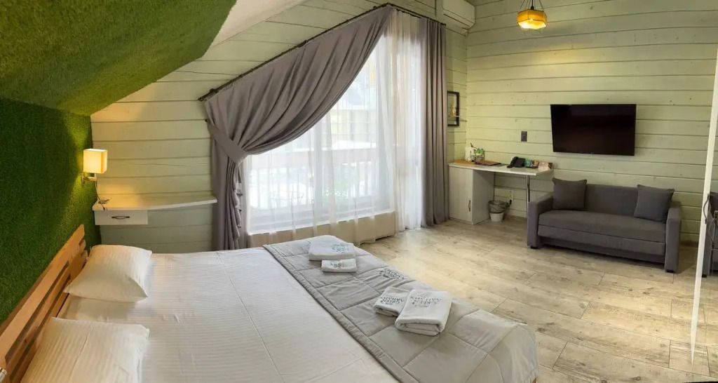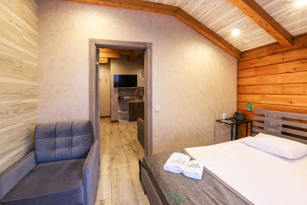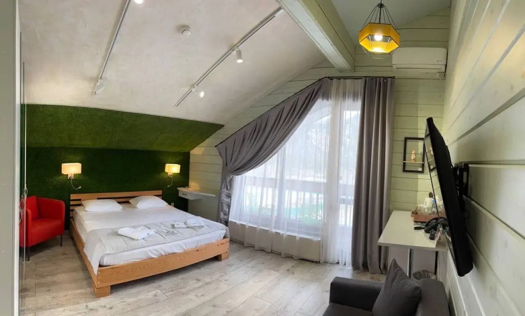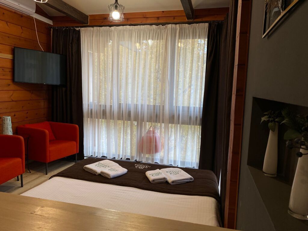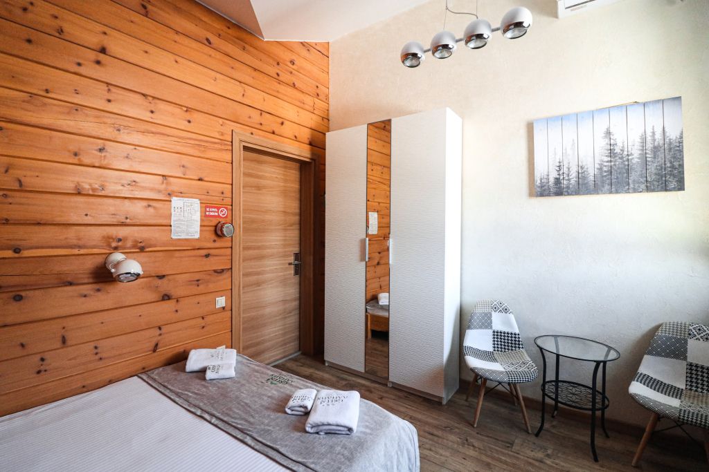 Номер на втором этаже без балкона. Двуспальная кровать, кресло-диван, стеллаж для вещей, телевизор, холодильник, чайник. Санузел с душевой.
