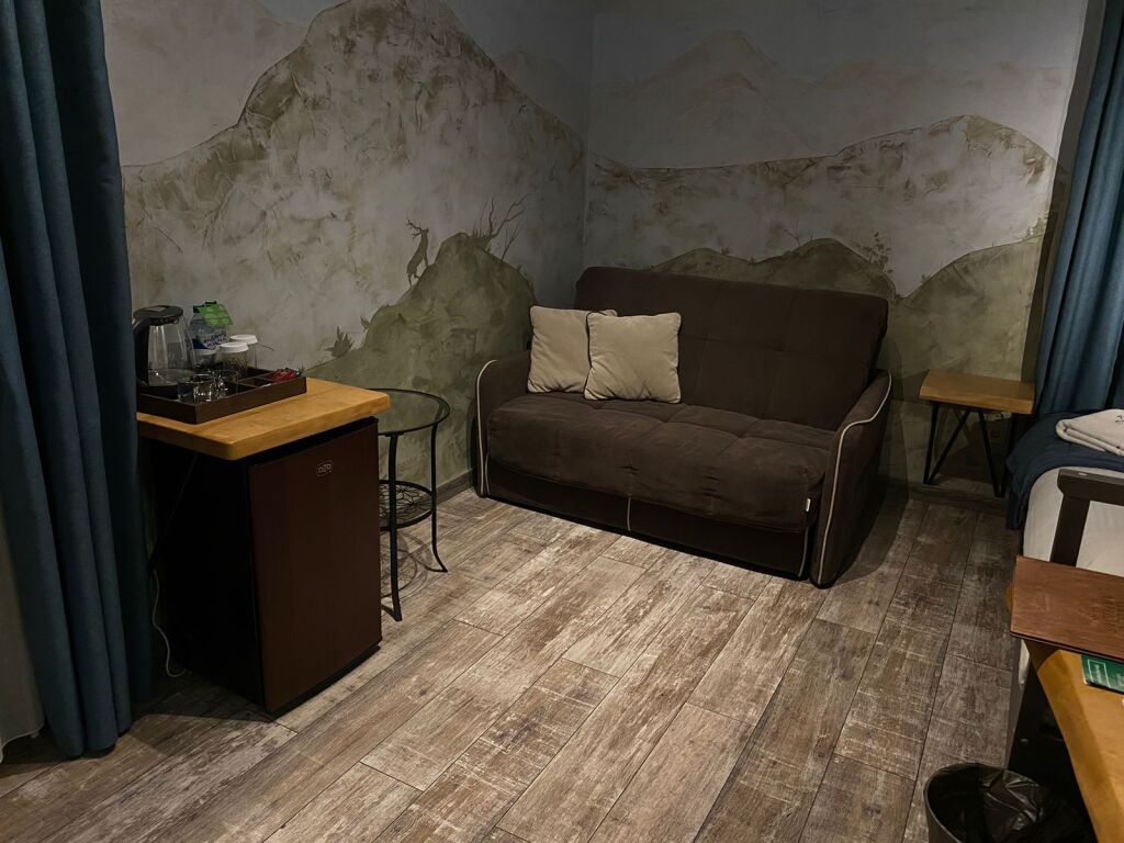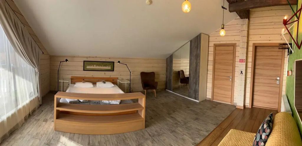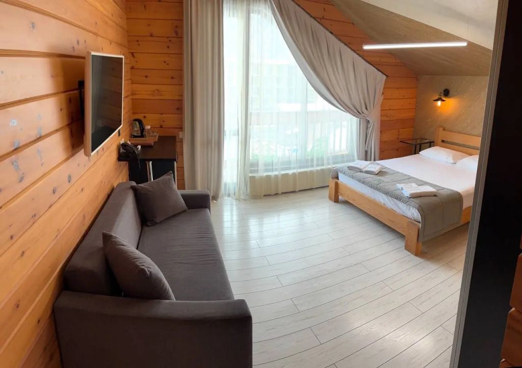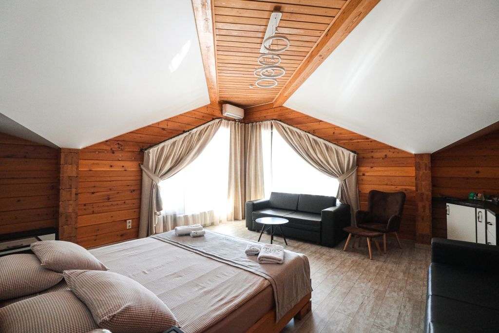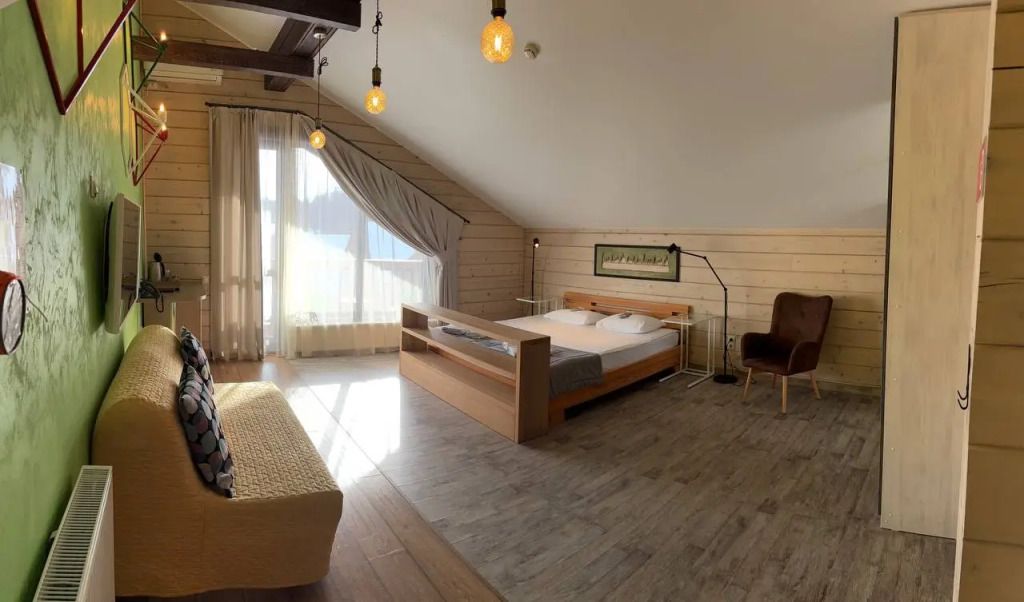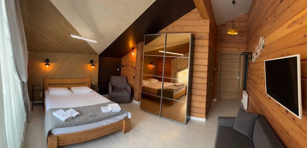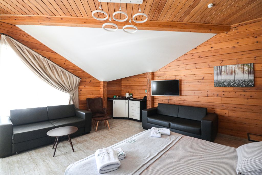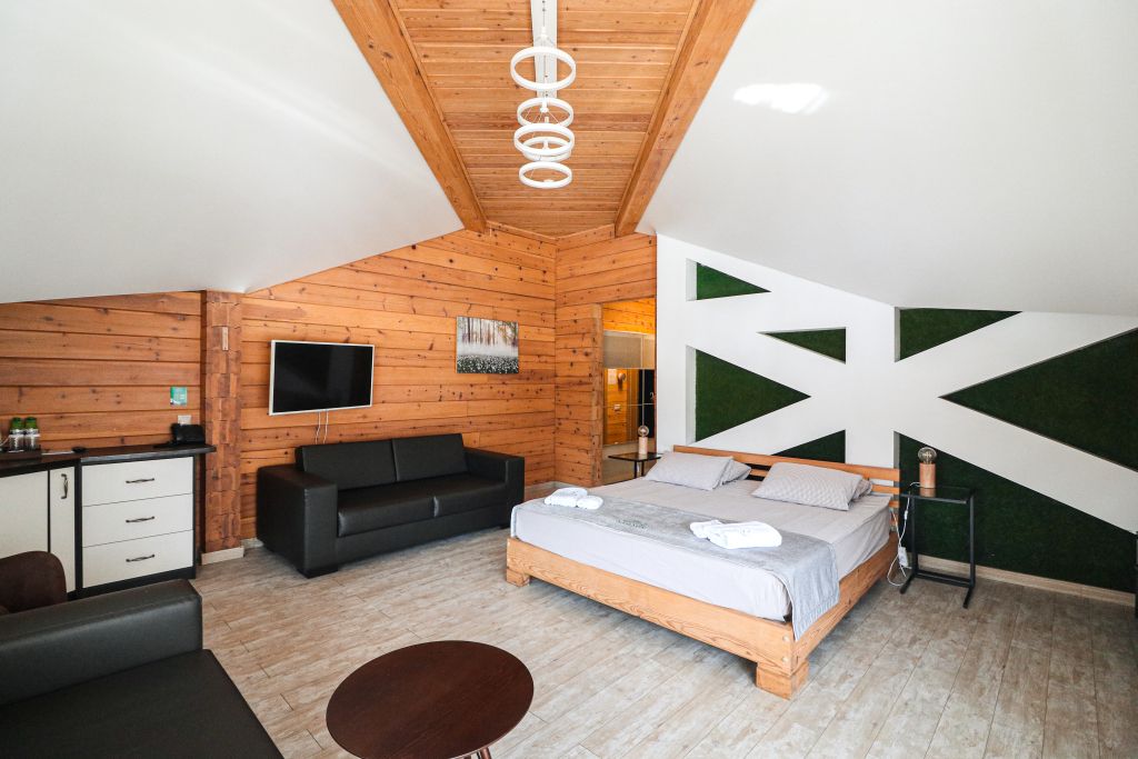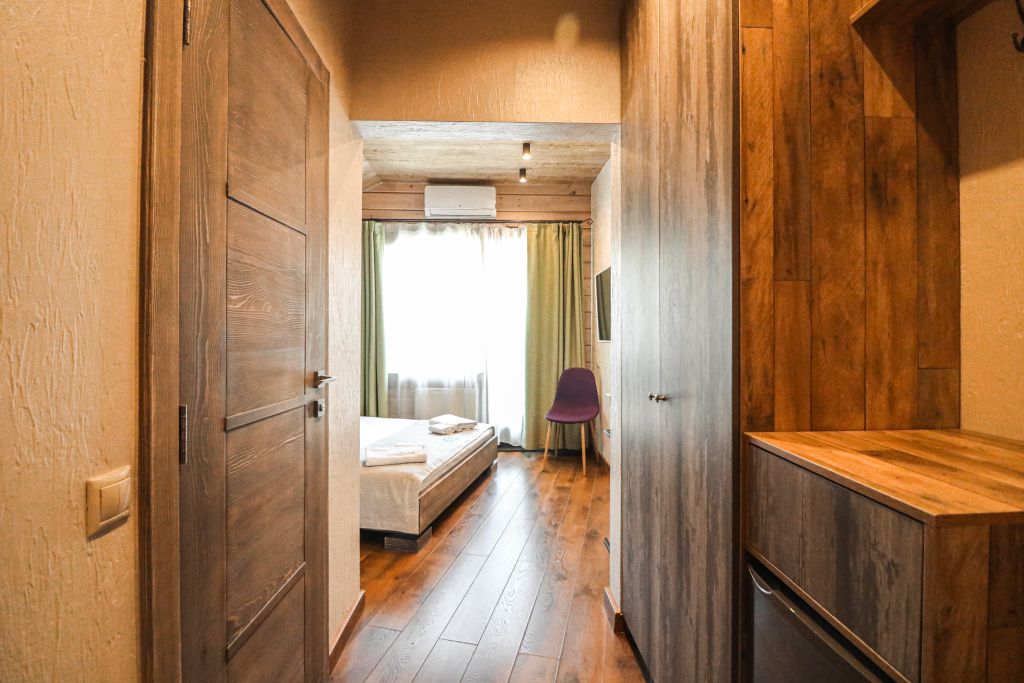 Номер на втором этаже без балкона. Двуспальная кровать, кресло-диван, стеллаж для вещей, телевизор, холодильник, чайник. Санузел с душевой.