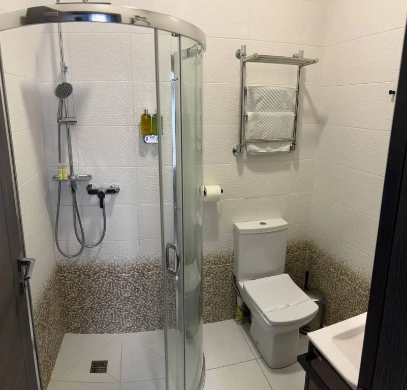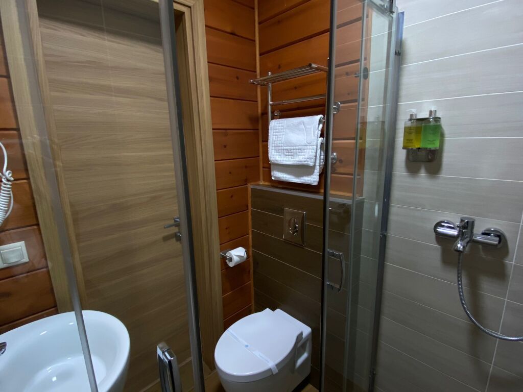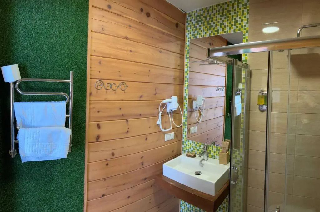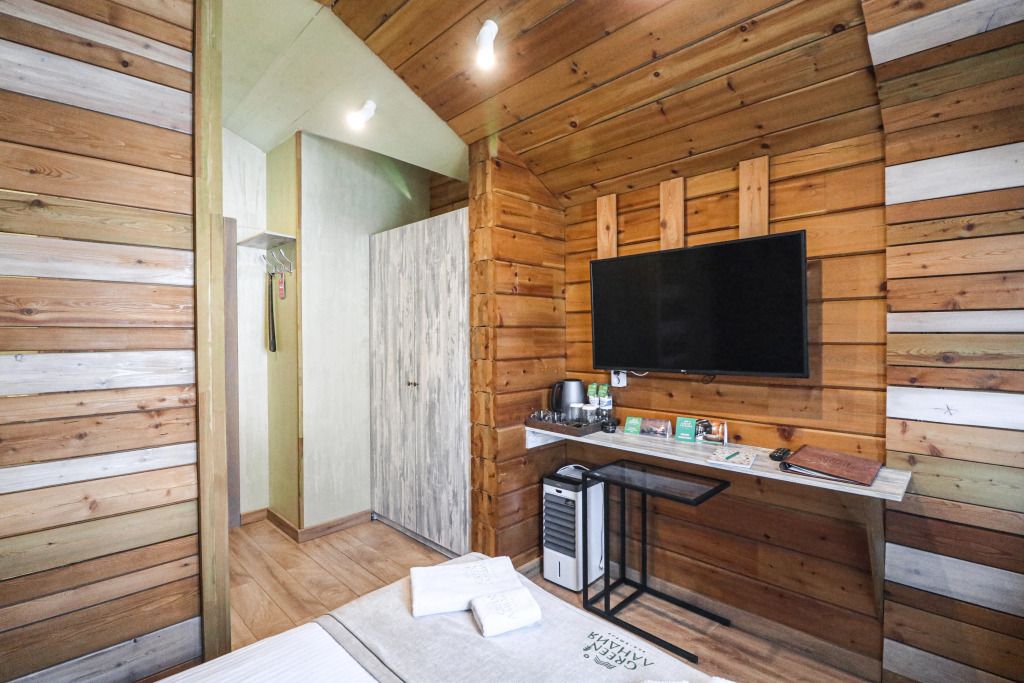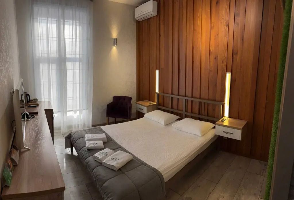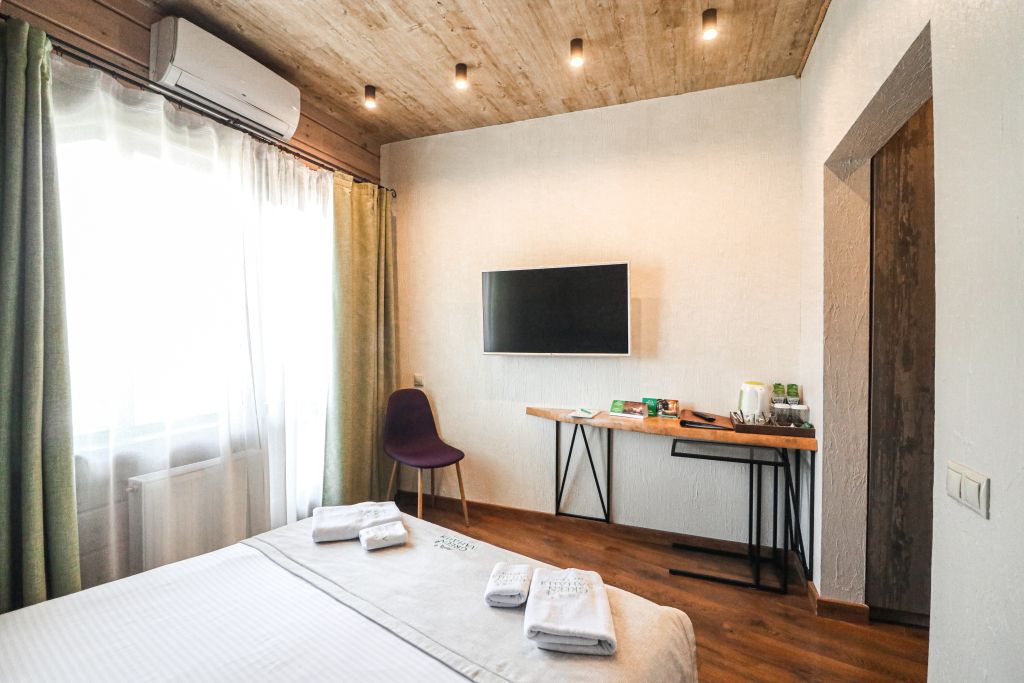 Номер на первом этаже без балкона. Двуспальная кровать, телевизор, кондиционер, холодильник, чайник. Санузел с душевой