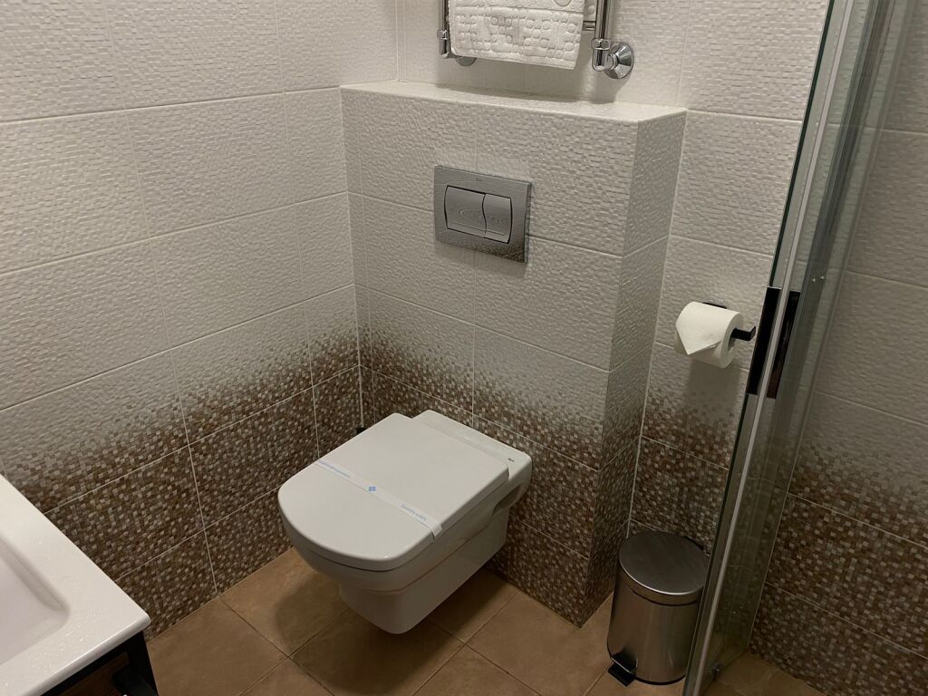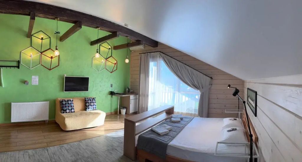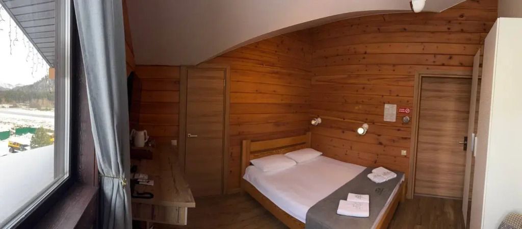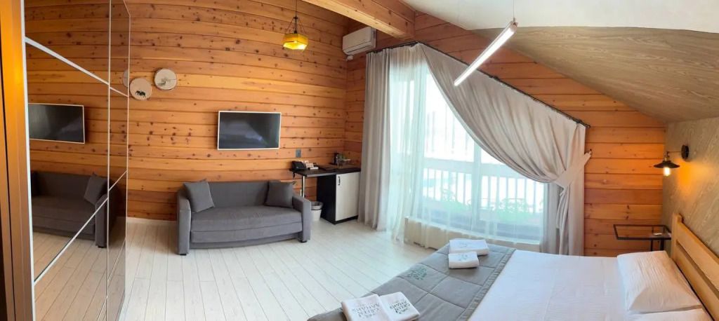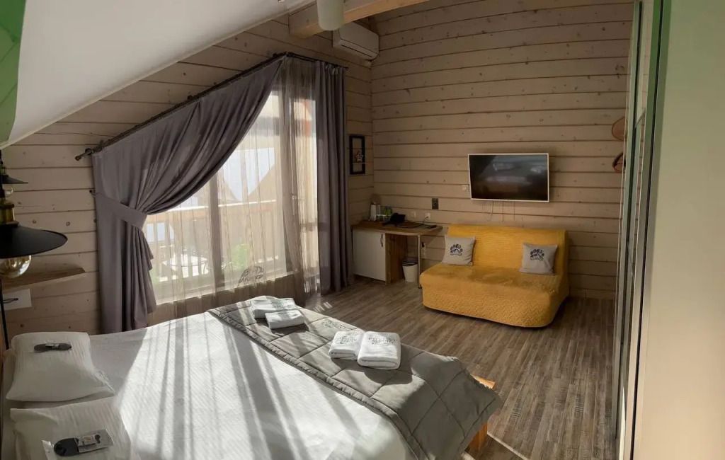Номер на втором этаже с балконом. Двуспальная кровать, телевизор, холодильник, чайник. Санузел с душевой.