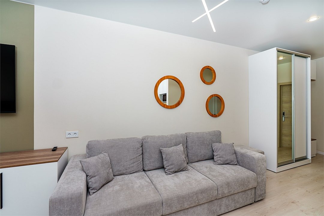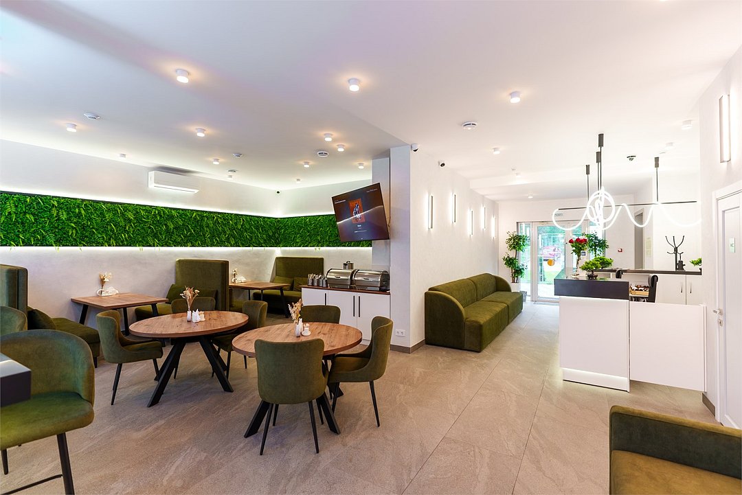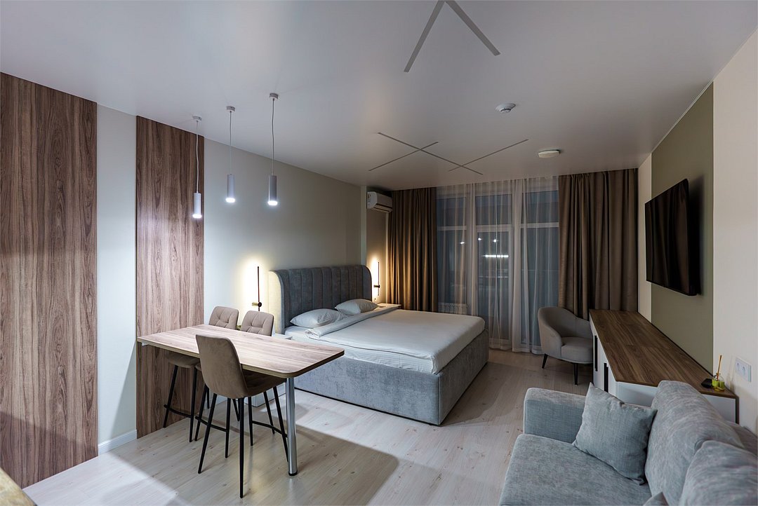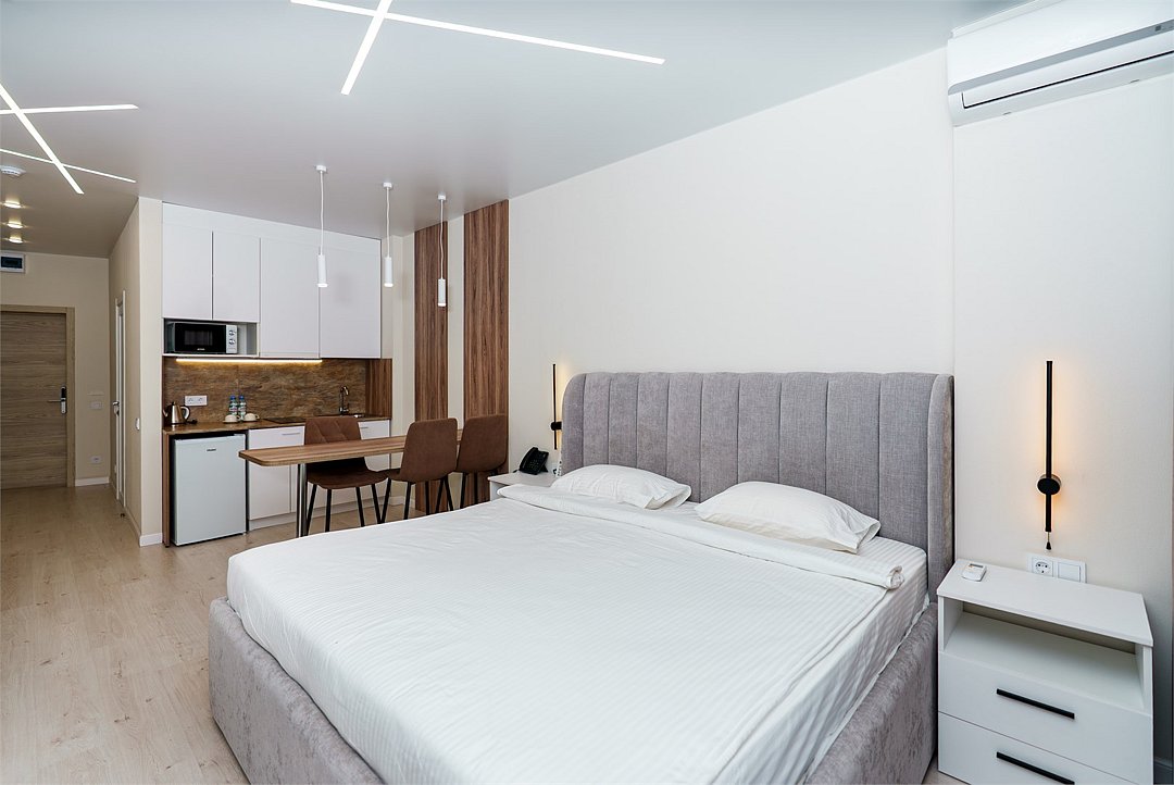 Элегантно оформленный номер, площадью 45м², с потрясающим видом на реку. Каждый номер разделен на спальную зону с одной большой кроватью и зону отдыха. В номере есть: ванная комната с душевой кабиной, диван-кровать в гостиной, одна двуспальная кровать с ортопедическими матрасом, доступ в интернет. Прочувствовать особую атмосферу дома позволяет оборудованная кухня с обеденной зоной. На территории отеля ведутся строительные работы по благоустройству.Услуги и удобства