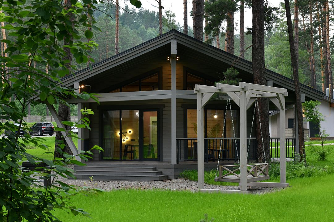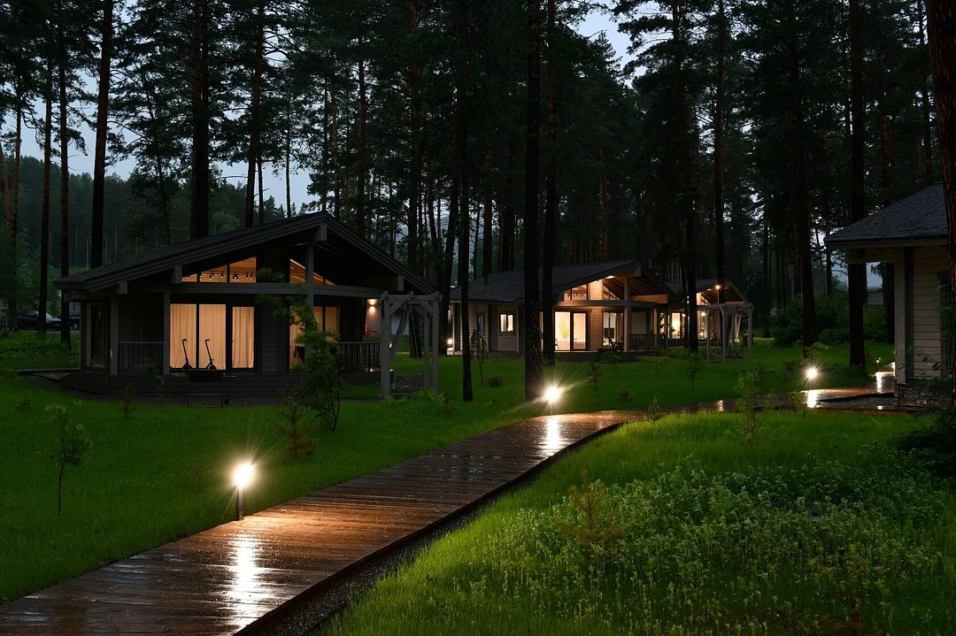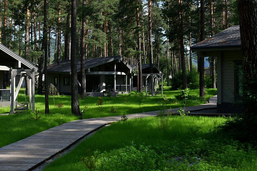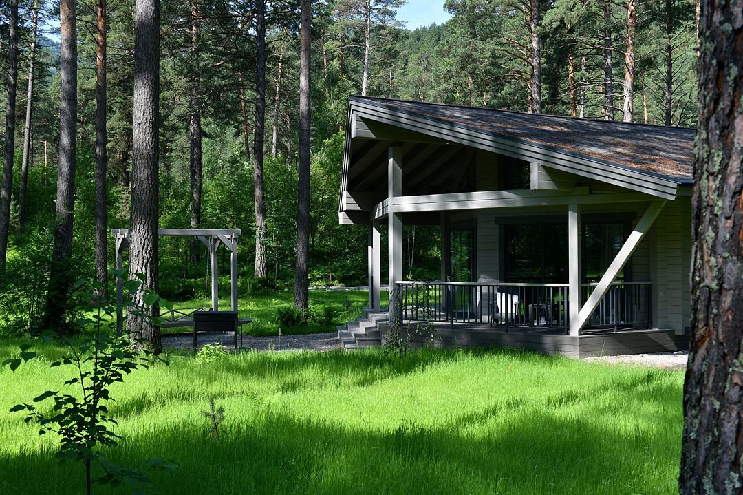 Каждое шале располагается на приватной территории и оборудовано индивидуальными зонами для гриля, окруженными сосновым лесом. Шале построены из алтайского кедра и могут комфортно разместить до четырех человек. Внутри вас ждут все необходимые удобства для самостоятельного проживания: встроенный холодильник, СВЧ-печь, капсульная кофемашина, чайник и полный комплект посуды. Это место идеально подходит тем, кто хочет сбежать от городской суеты и насладиться красотой природы вдали от шумных трасс.