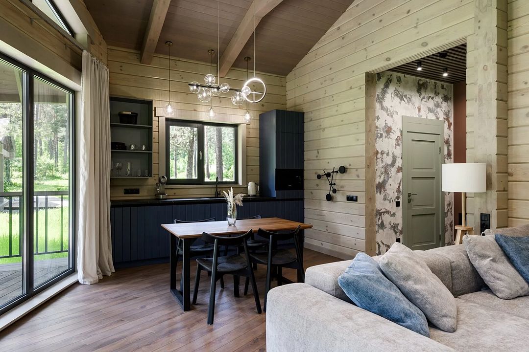 Отдельно стоящее шале из алтайского кедра с видом на горы и сосновый лес.
