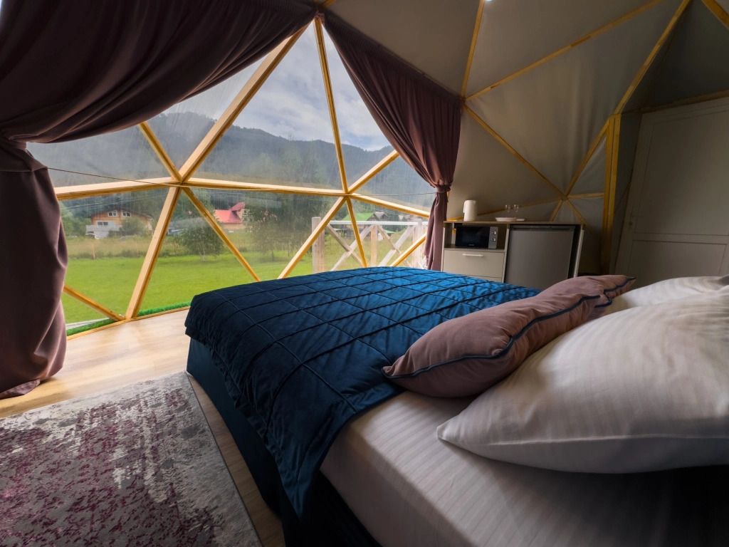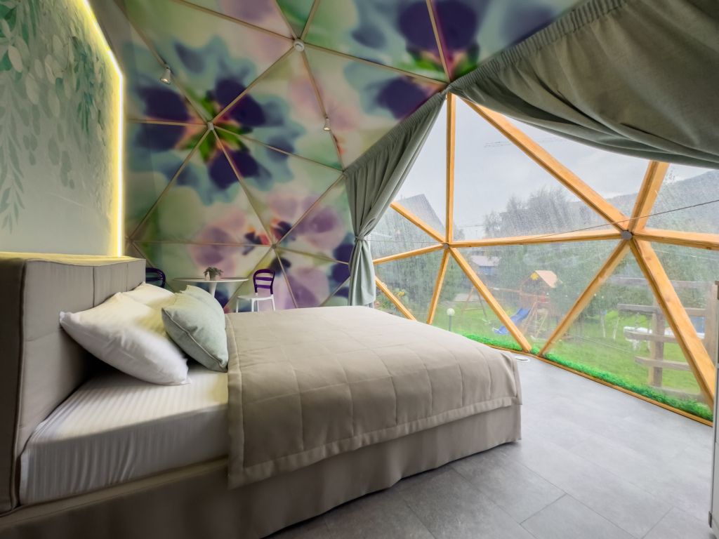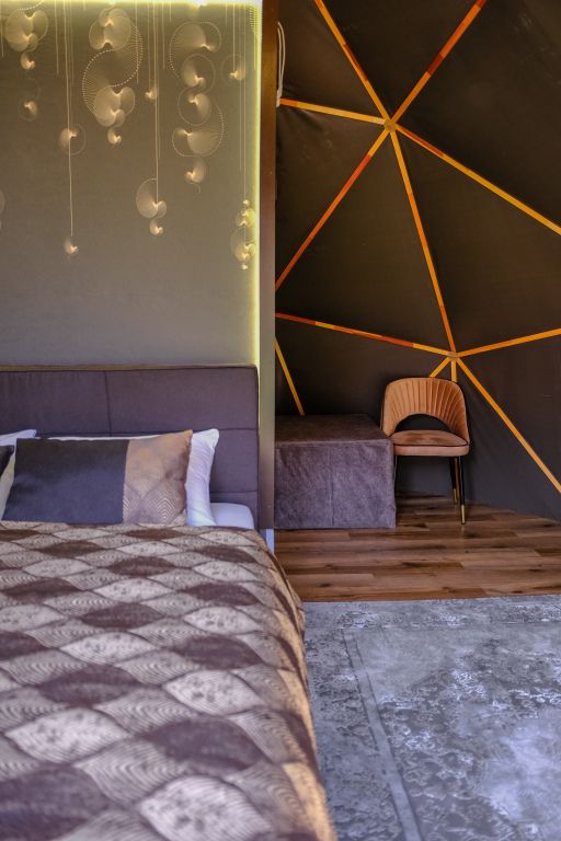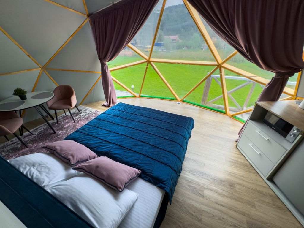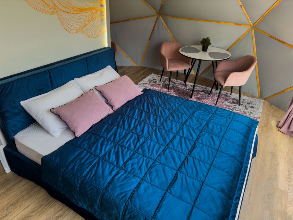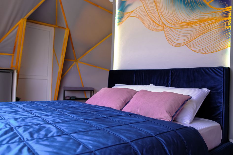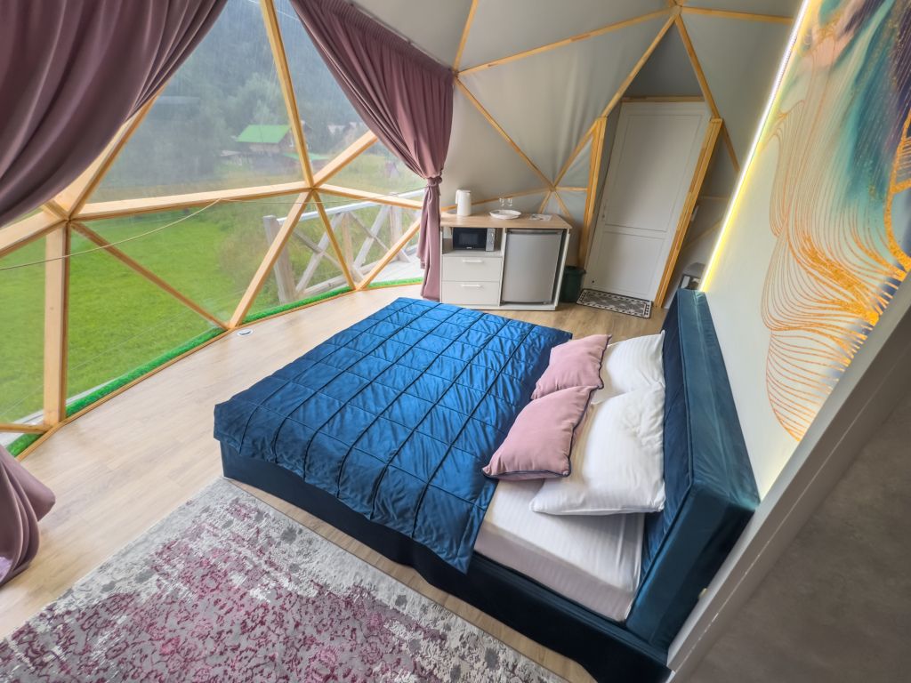 Одна из 4-х уникальных сфер глэмпинга Sfera — Сфера Глэм. Она создаст атмосферу уюта и романтики, с палитрой розовых и лазурных оттенков, мягкими бархатистыми шторами и белоснежным постельным бельем. Насладитесь тишиной и уединением в этом идеальном месте для расслабления вдали от суеты. Специально подобранные элементы интерьера помогут создать незабываемое впечатление и подарят вам незабываемый отдых в окружении природы.