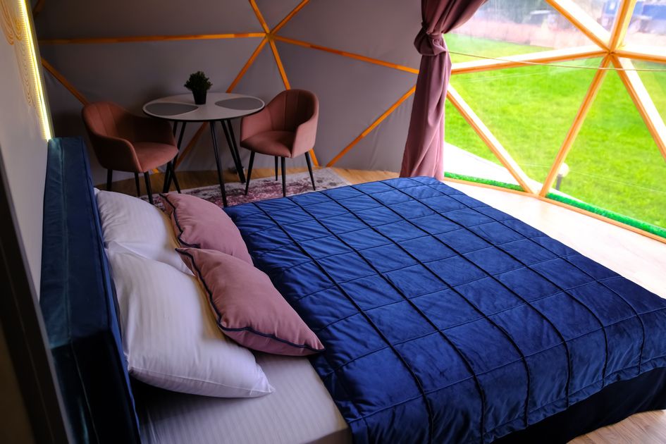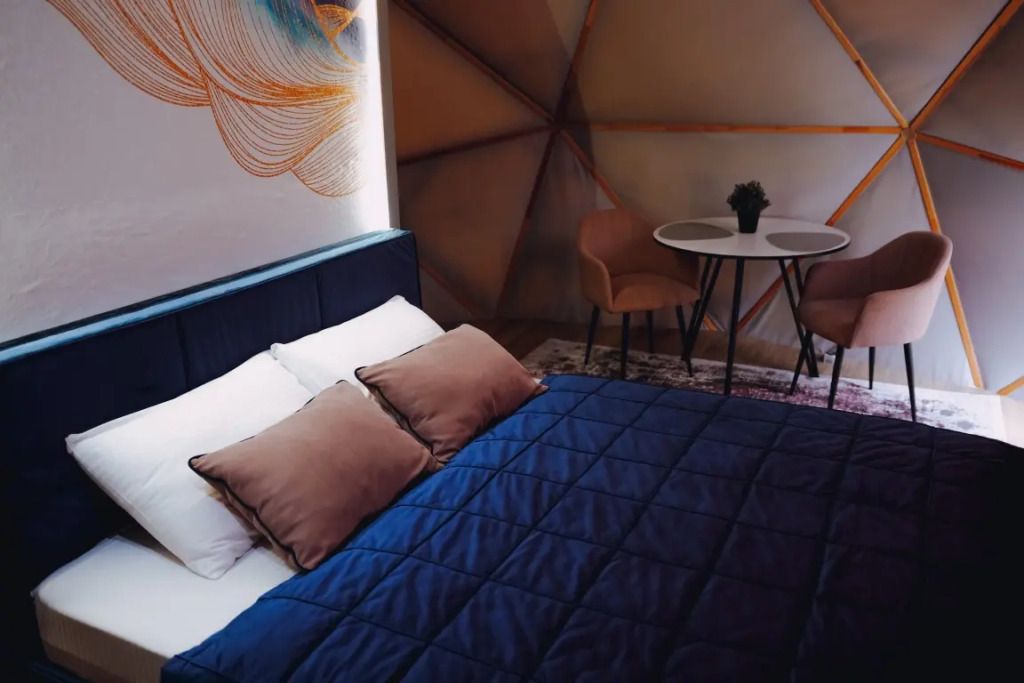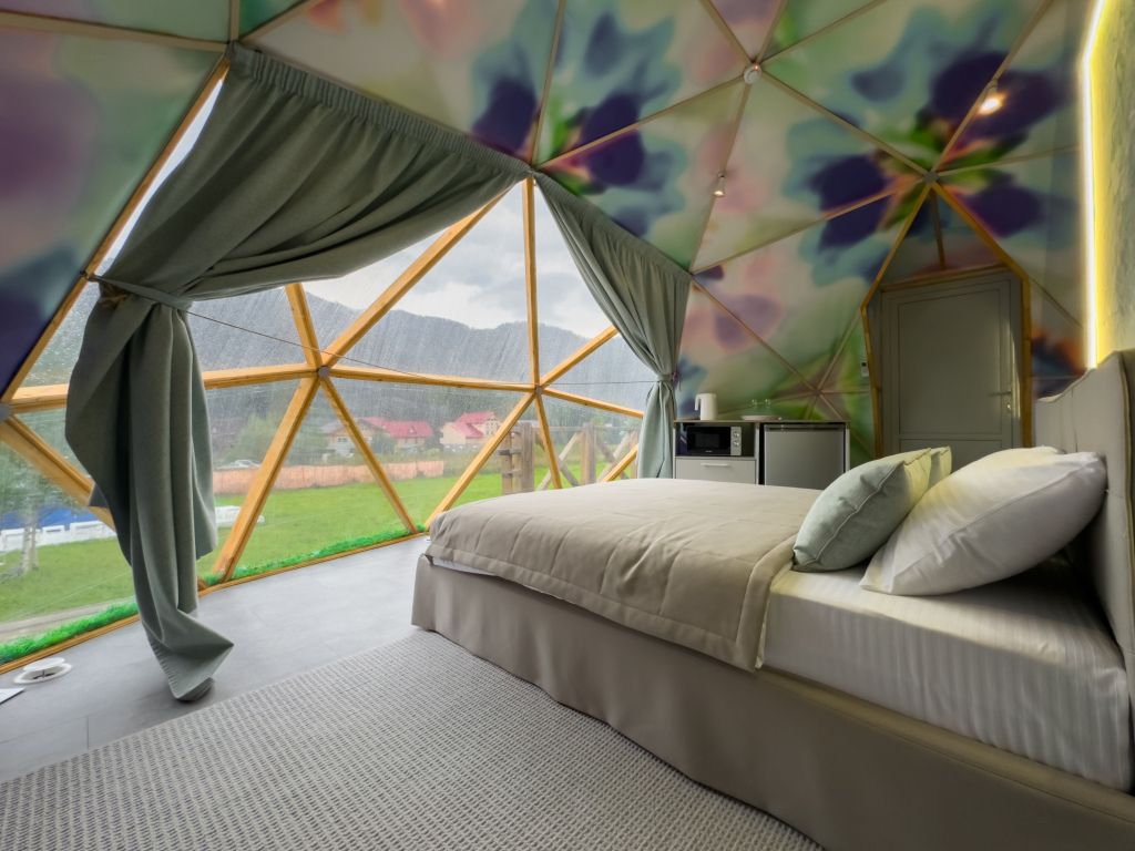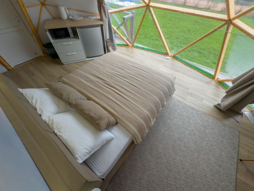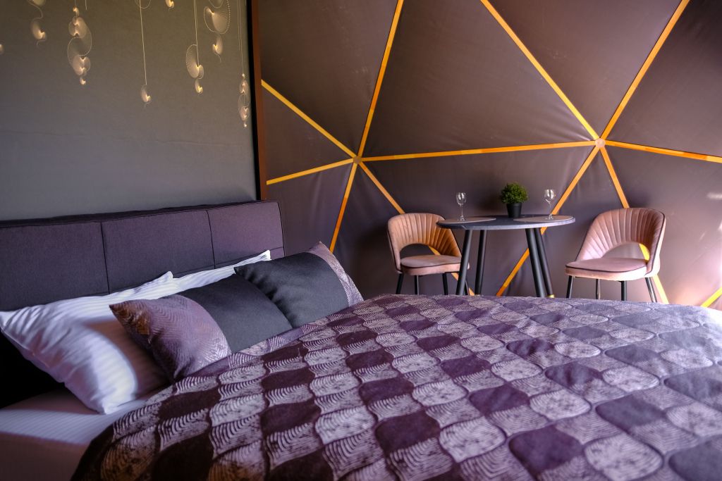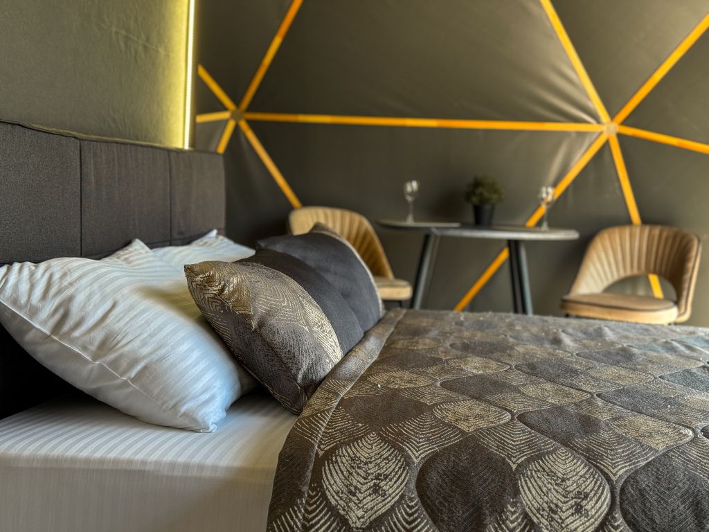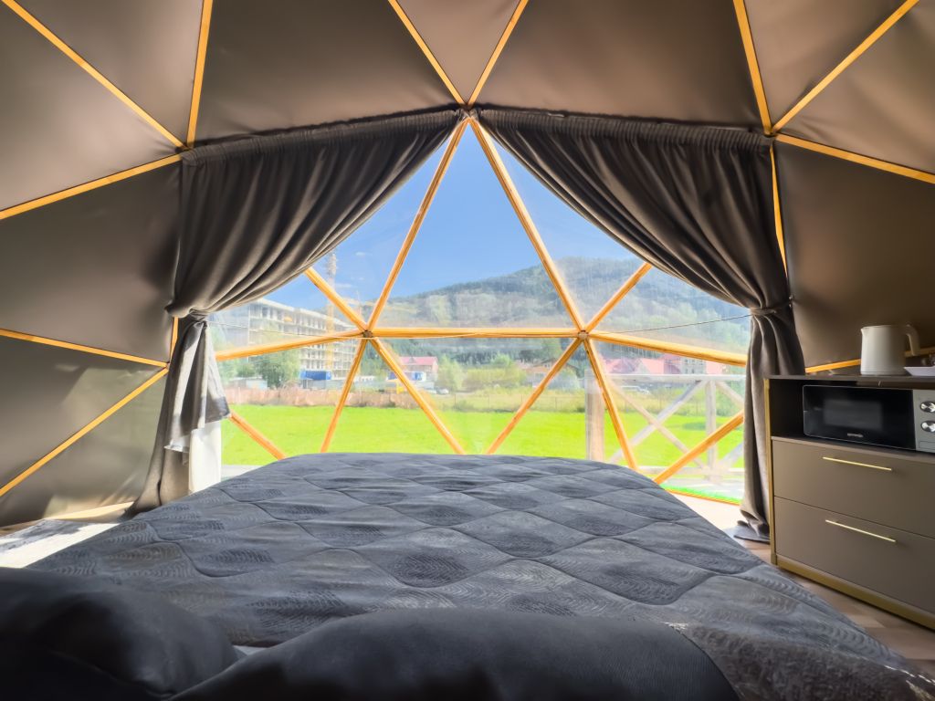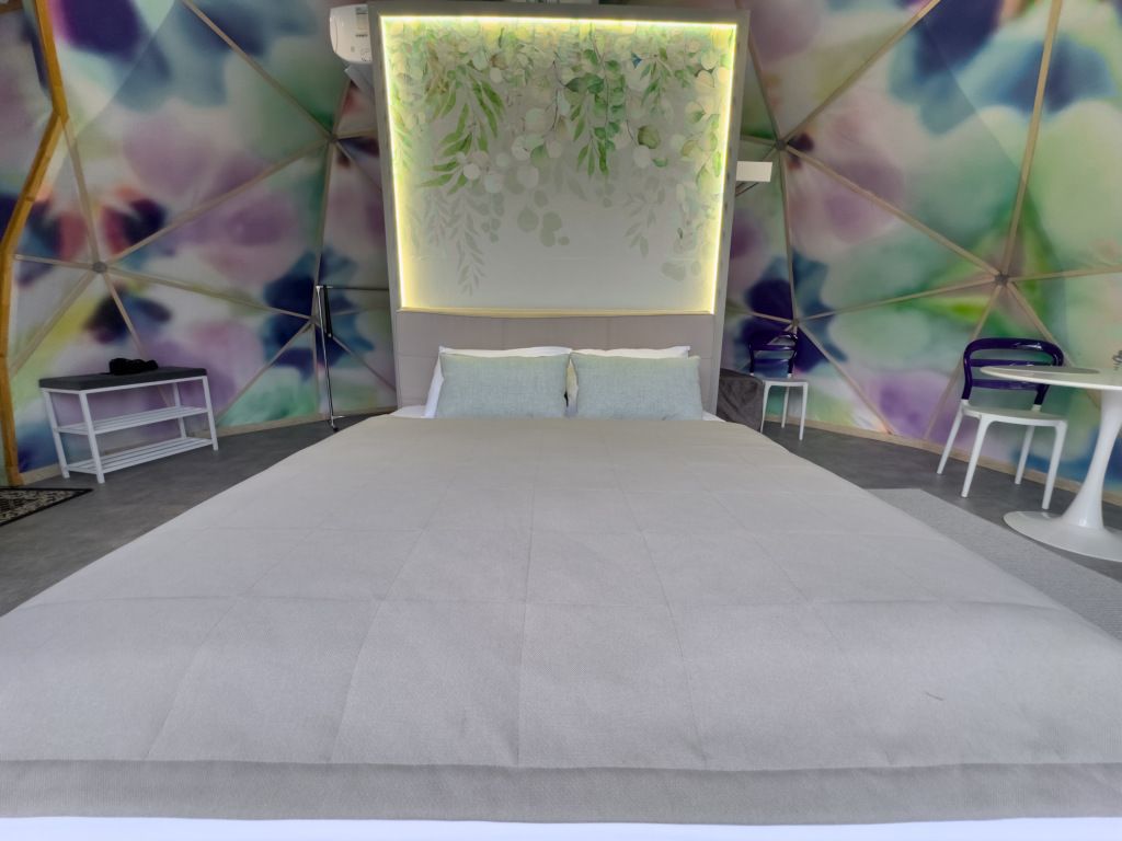 Одна из 4-х уникальных сфер глэмпинга Sfera — Сфера Глэм. Она создаст атмосферу уюта и романтики, с палитрой розовых и лазурных оттенков, мягкими бархатистыми шторами и белоснежным постельным бельем. Насладитесь тишиной и уединением в этом идеальном месте для расслабления вдали от суеты. Специально подобранные элементы интерьера помогут создать незабываемое впечатление и подарят вам незабываемый отдых в окружении природы.