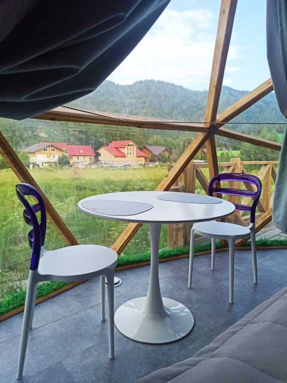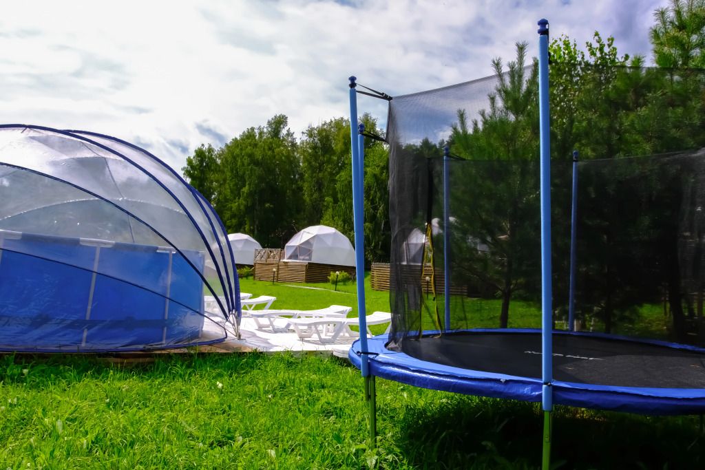 На территории площадью 0, 5 гектара расположено всего 4 сферы. Насладитесь уникальным интерьером и захватывающим видом из панорамного окна. Каждая сфера оборудована открытой террасой с освещением и мангальной зоной. К вашим услугам на территории: каркасный бассейн, батут и детская игровая площадка.
