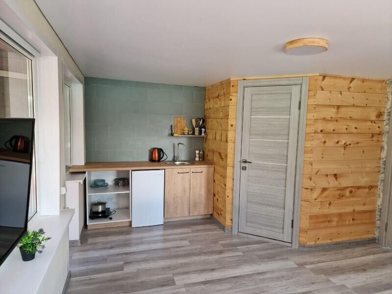 Двухкомнатный номер в коттедже расположен на первом этаже с балконом. Гости первого и второго этажей коттеджа могут воспользоваться летней кухней, примыкающей к коттеджу.