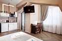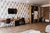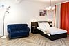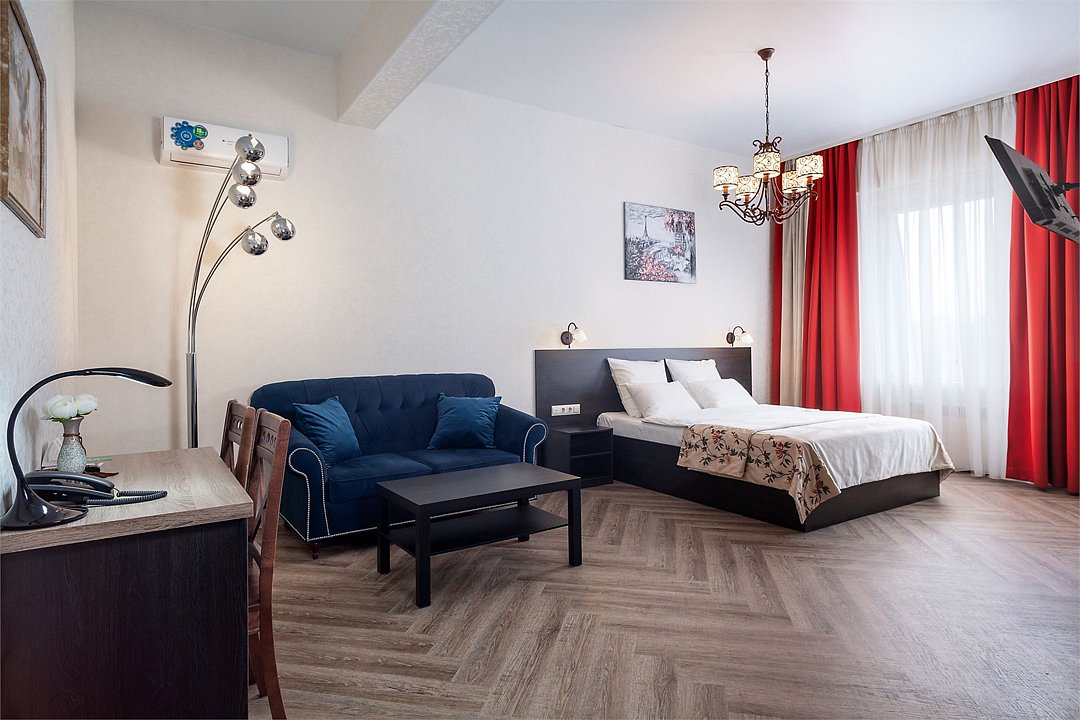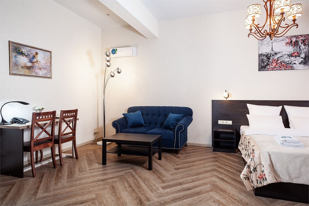 Просторный светлый номер (35 кв. м) с высокими потолками. Выделенная зона спальни и гостиной (диван, журнальный столик). Высокая комфортабельная кровать и белье из шелковистого сатина обеспечат прекрасный сон. Номер-студио “Делюкс“— прекрасный выбор для деловой поездки и комфортного отдыха семьей.Услуги и удобства