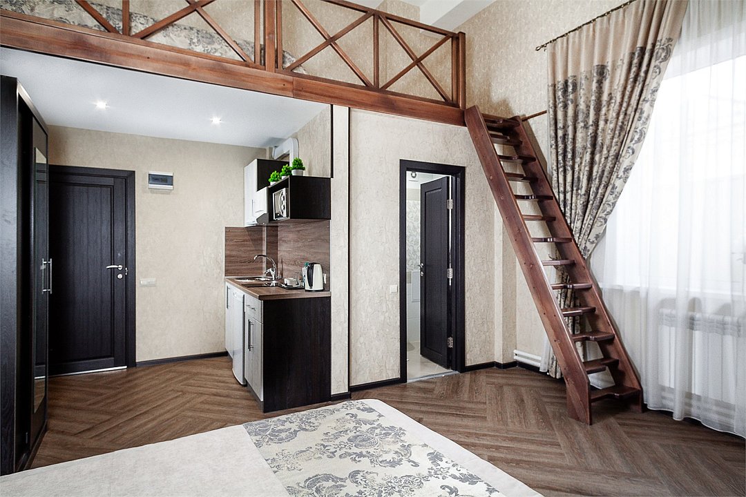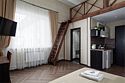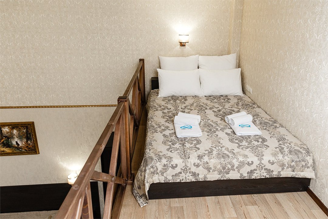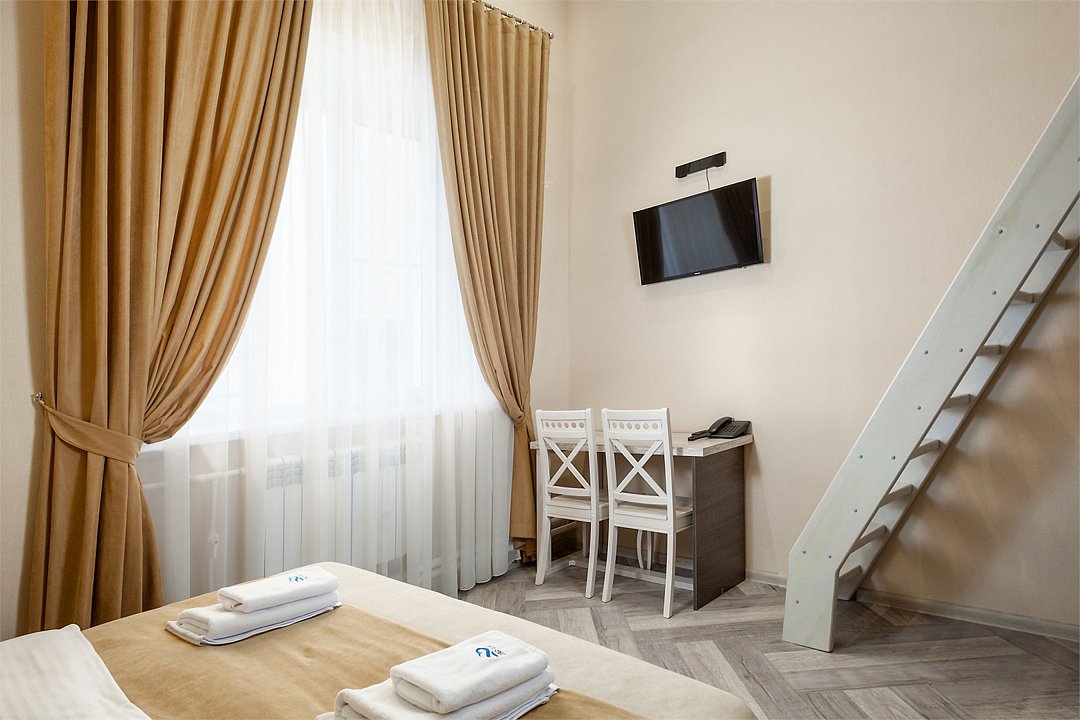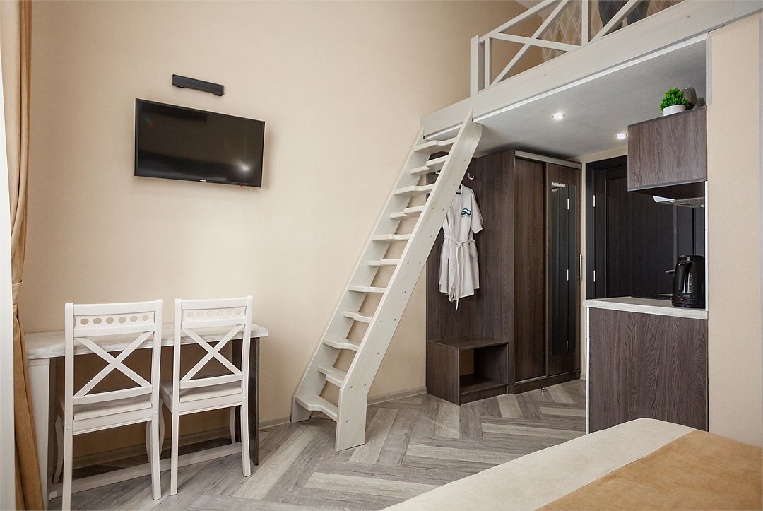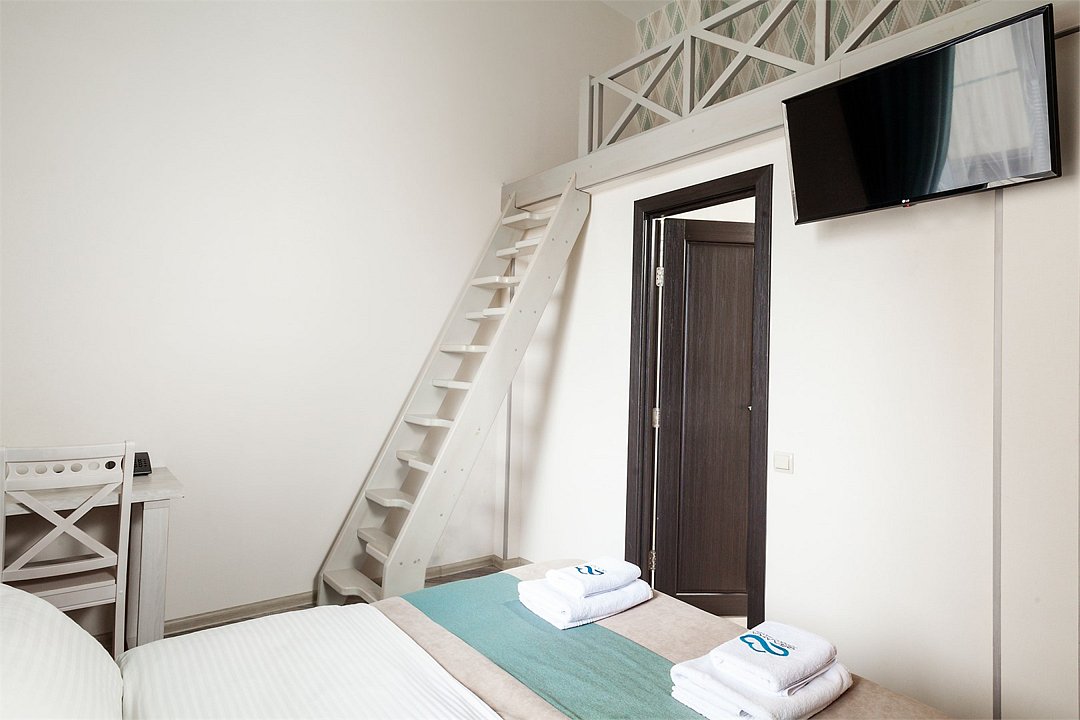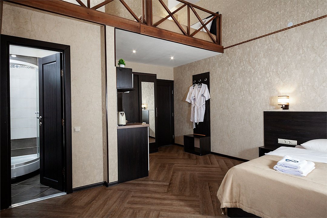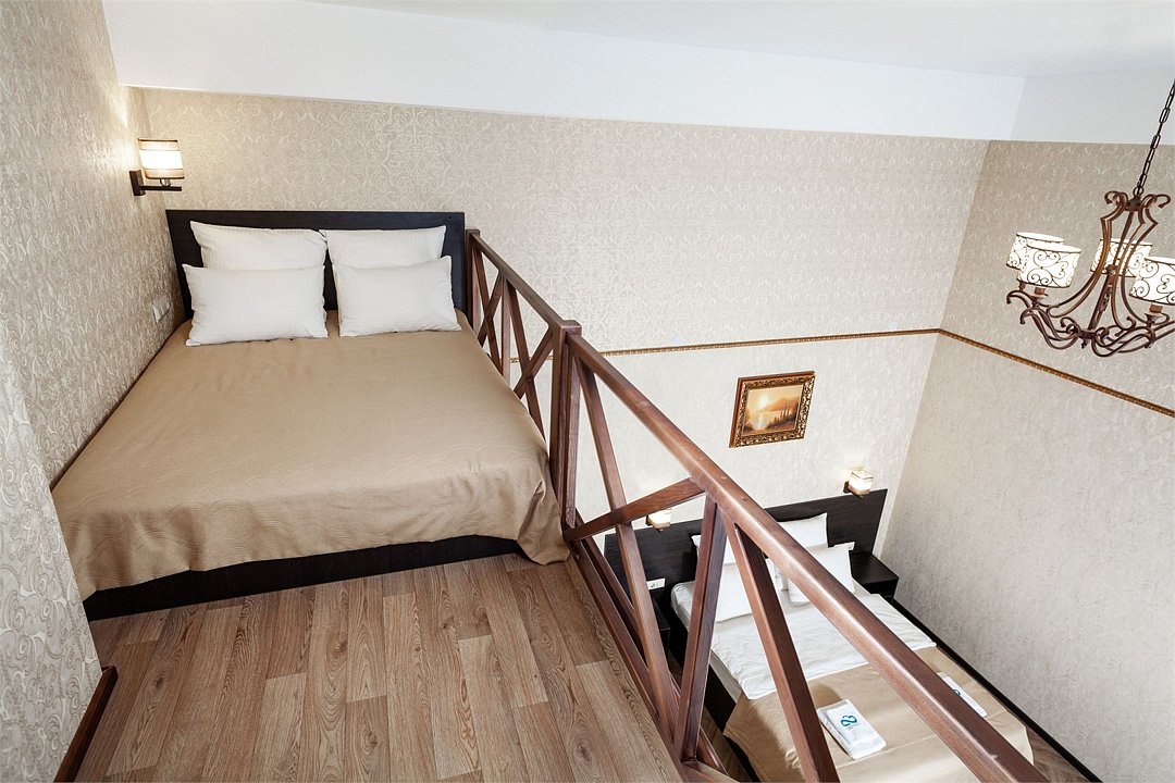 Стильный и современный духуровневый номер (20 кв.м). В номере одна двуспальная и одна односпальная кровать на уровне, телевизор, холодильник, рабочий стол, ванная комната с душевой кабиной и косметическими средствами, фен, тапочки, халат.Услуги и удобства