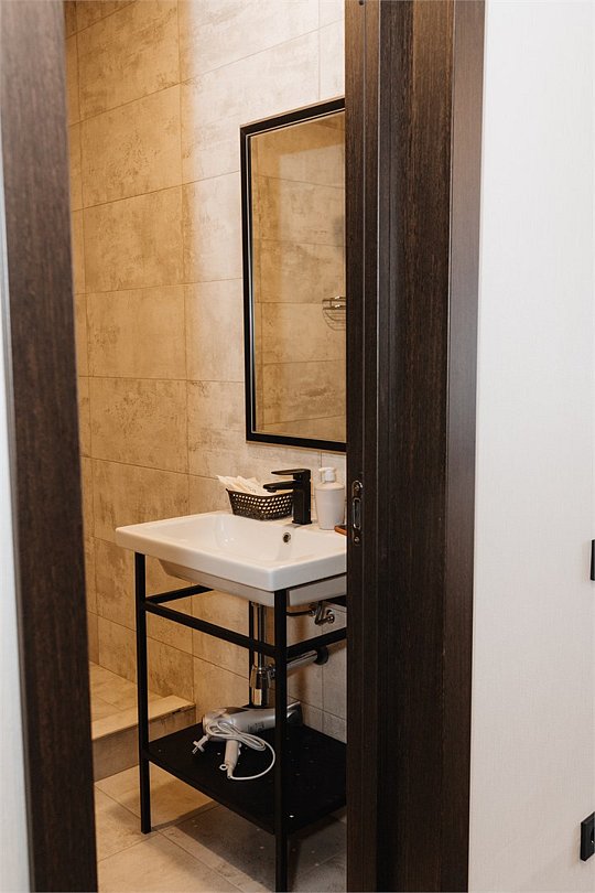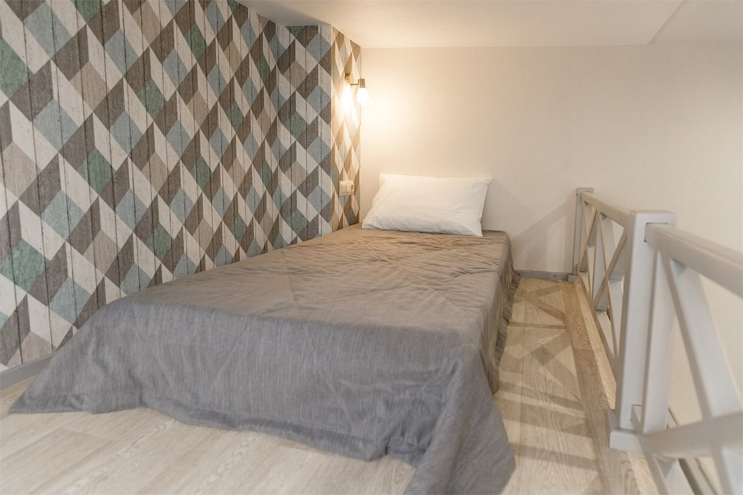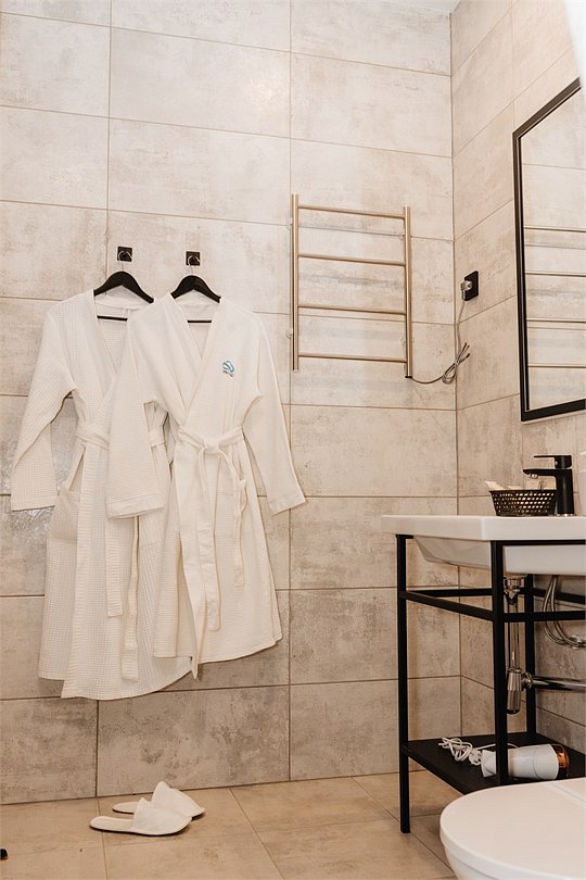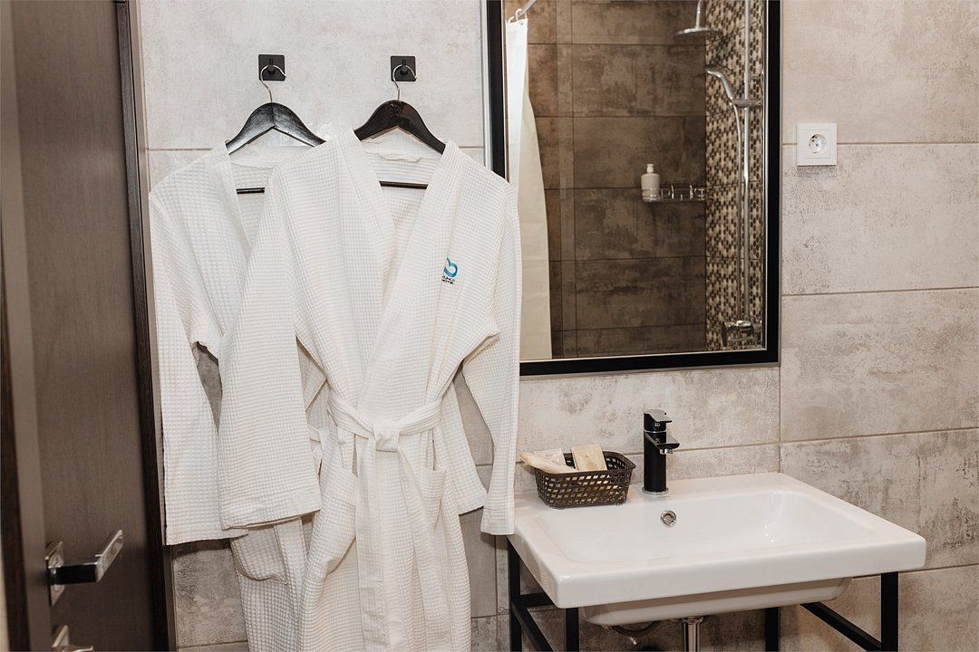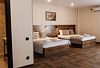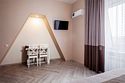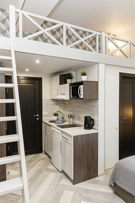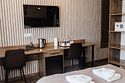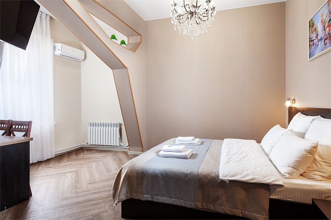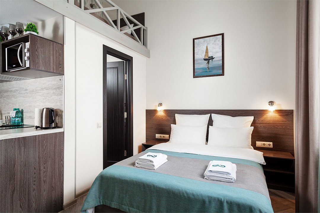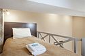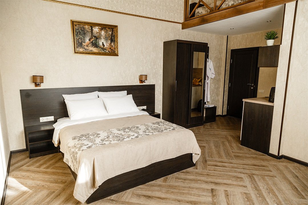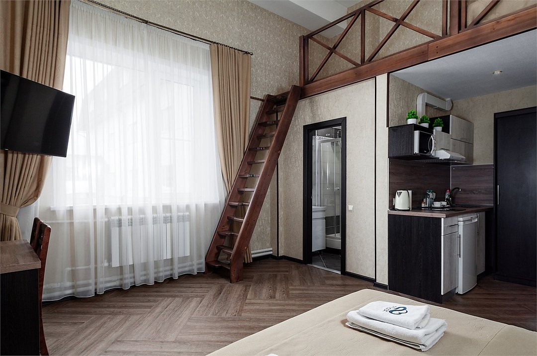 Стильный и современный духуровневый номер (20 кв.м). В номере одна двуспальная и одна односпальная кровать на уровне, телевизор, холодильник, рабочий стол, ванная комната с душевой кабиной и косметическими средствами, фен, тапочки, халат.Услуги и удобства