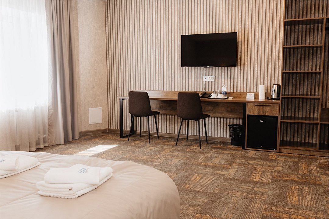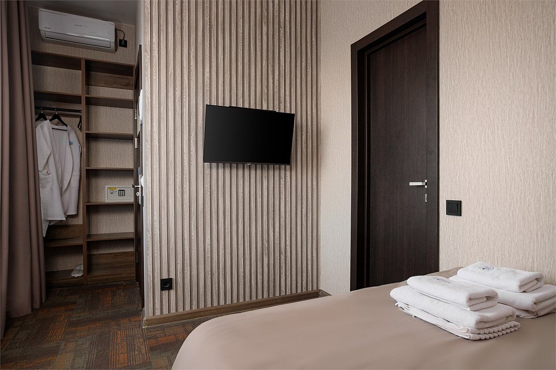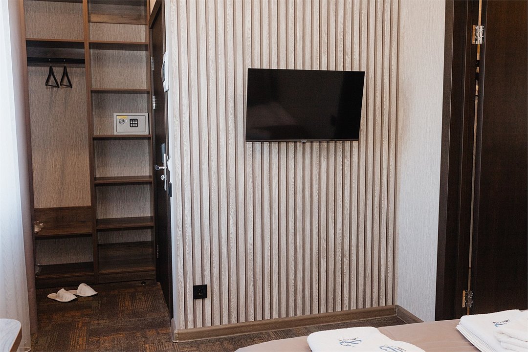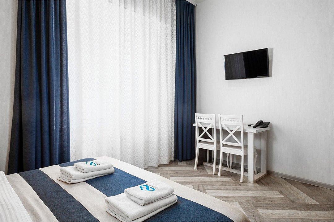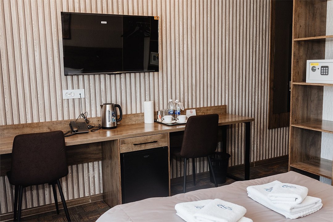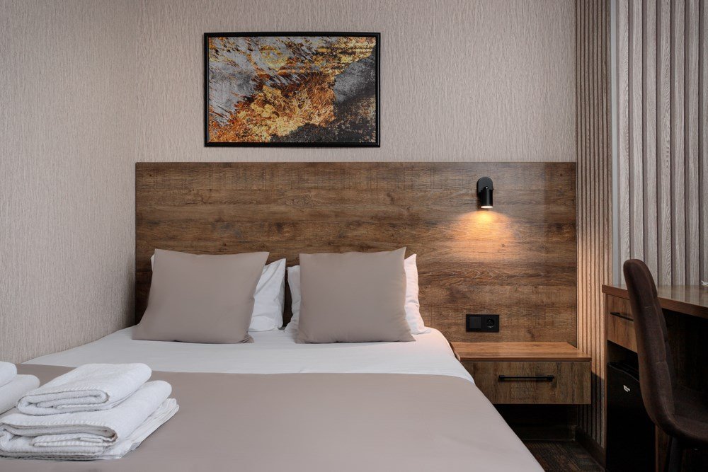 Стандартный номер с двуспальной кроватью, Площадь номера – 15 м². Кровать оснащена ортопедическим матрасом, шторы black-out из светонепроницаемого материала создадут в номере уютный полумрак. Сигнал Wi-Fi достаточно мощный для загрузки программ или просмотра фильмов онлайн на плазменном 32 дюймовом телевизоре. Централизованная система кондиционирования отеля поддерживает комфортную температуру в номерах круглый год.Услуги и удобства