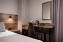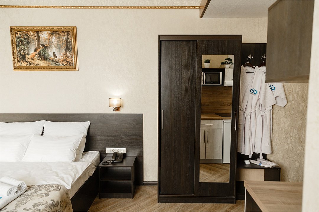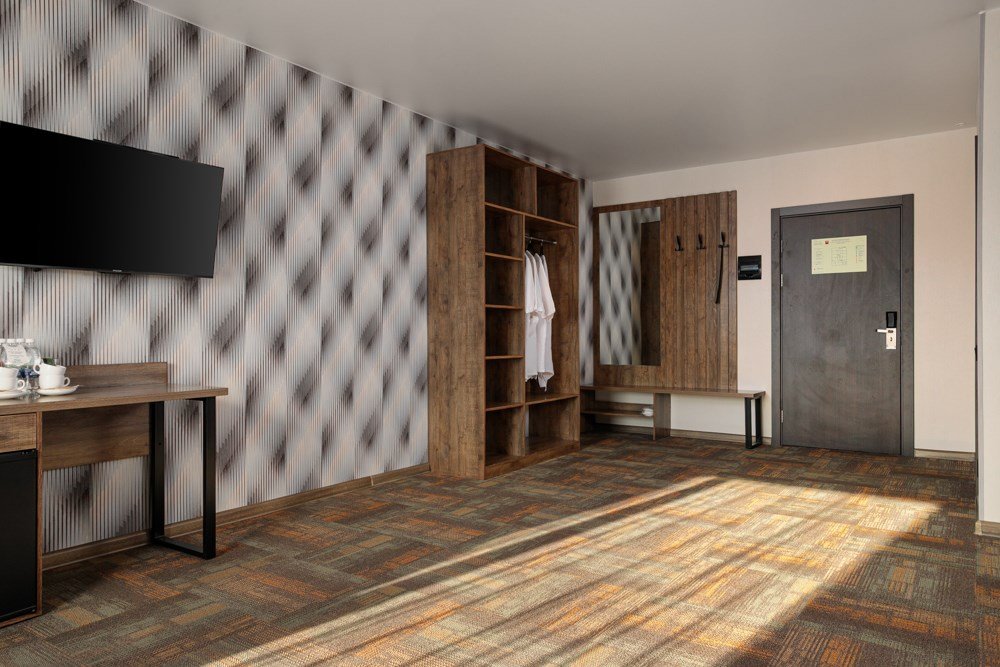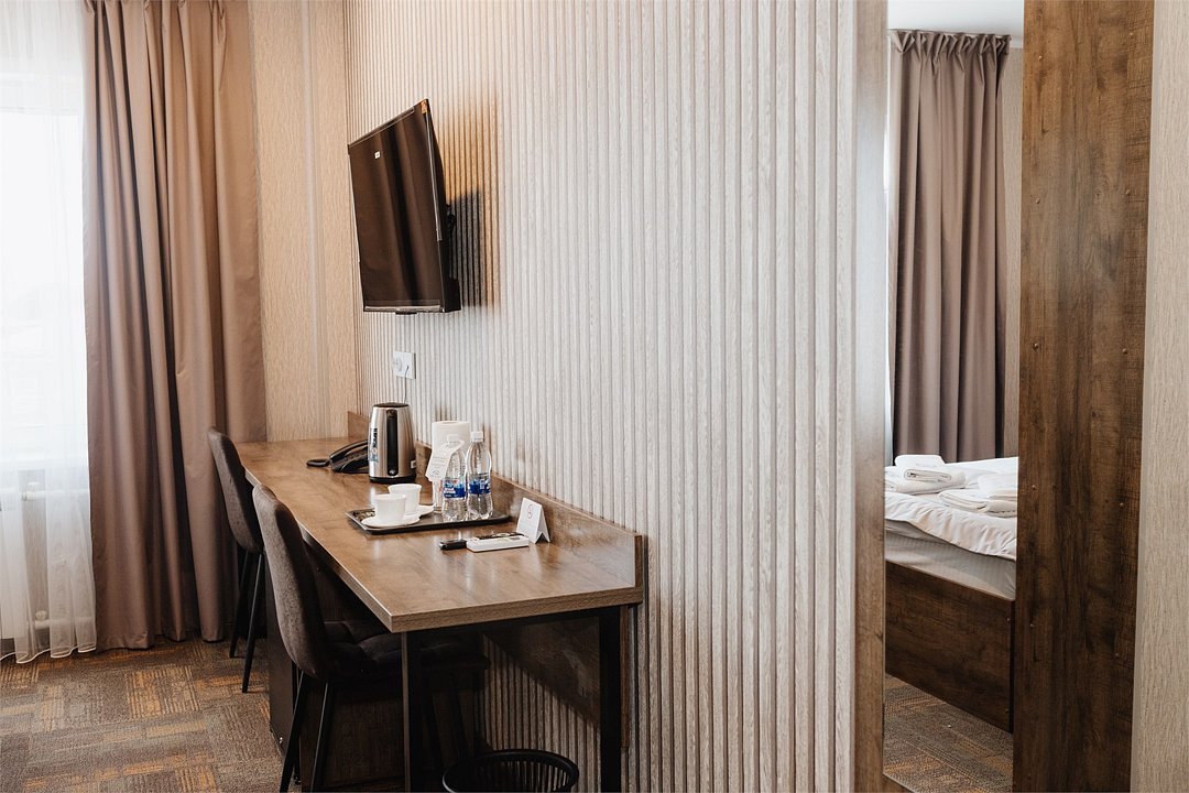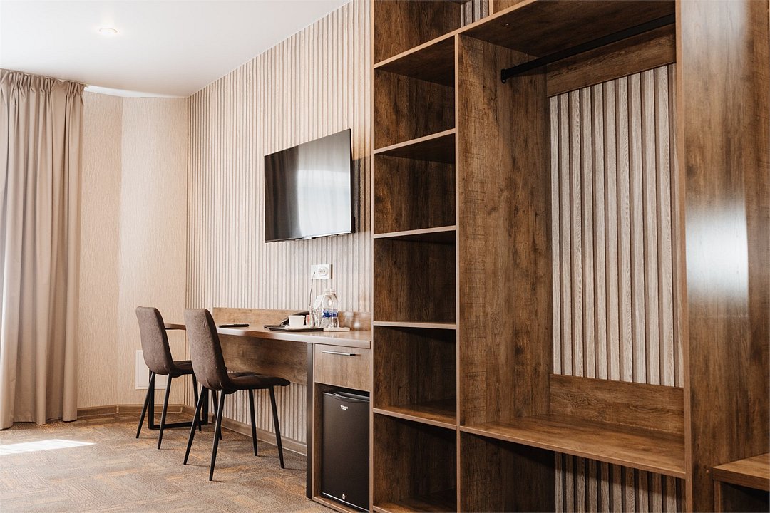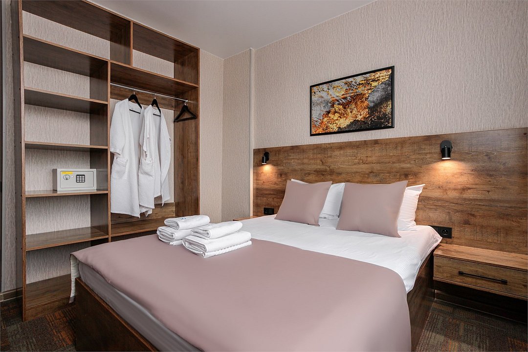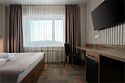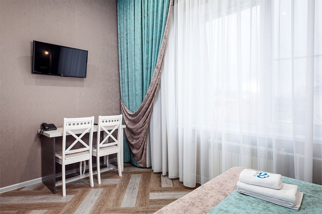 Стандартный номер с двуспальной кроватью, Площадь номера – 15 м². Кровать оснащена ортопедическим матрасом, шторы black-out из светонепроницаемого материала создадут в номере уютный полумрак. Сигнал Wi-Fi достаточно мощный для загрузки программ или просмотра фильмов онлайн на плазменном 32 дюймовом телевизоре. Централизованная система кондиционирования отеля поддерживает комфортную температуру в номерах круглый год.Услуги и удобства
