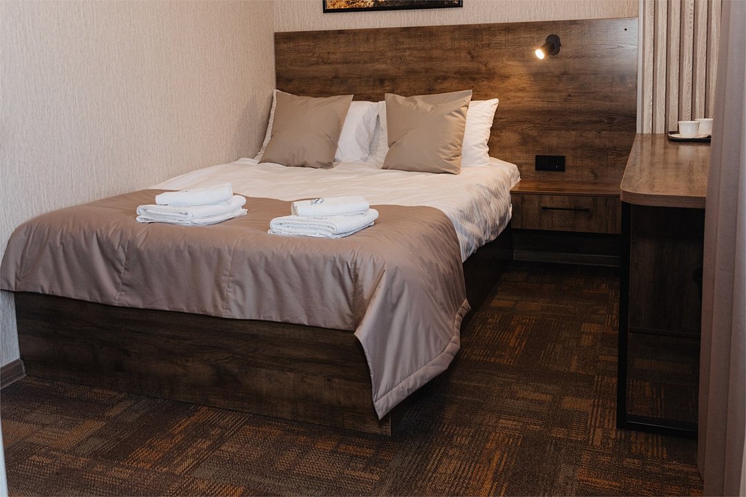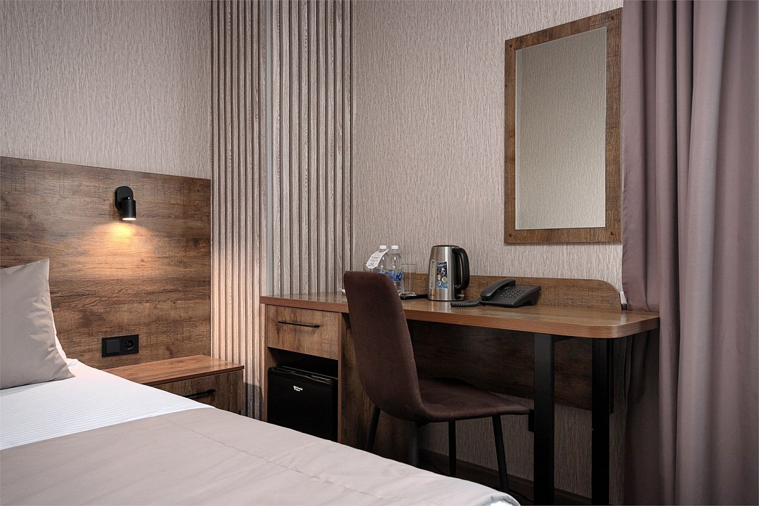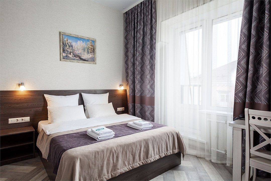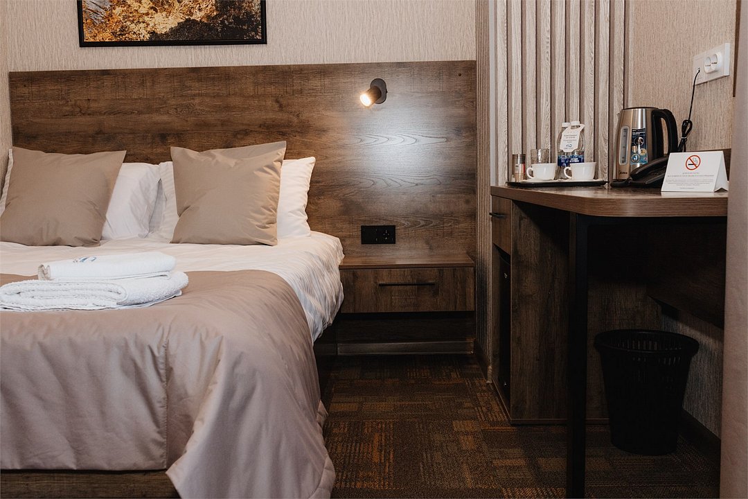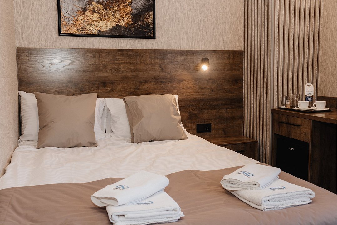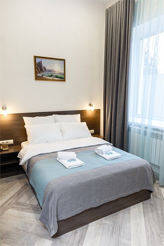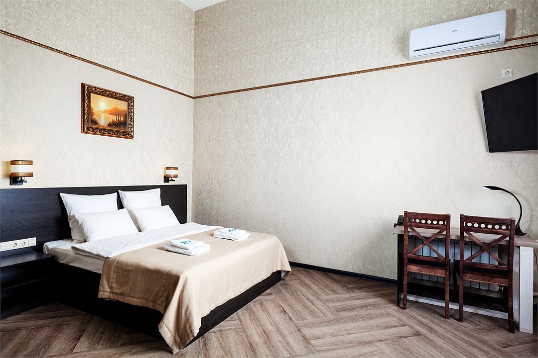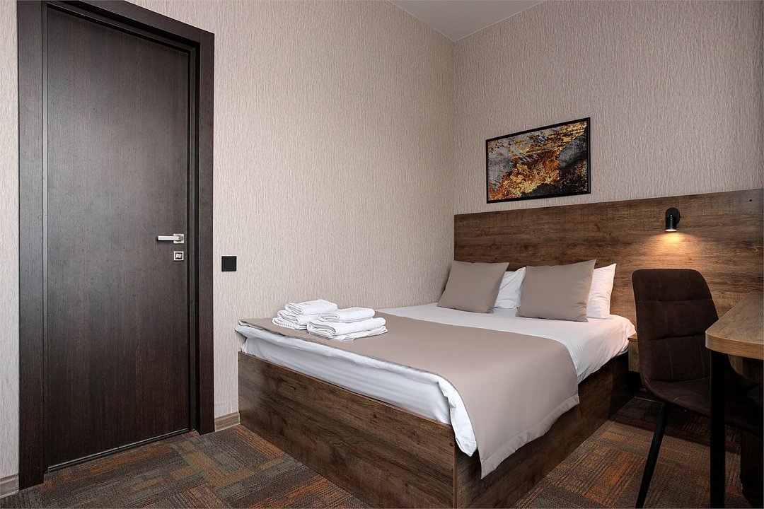Стандартный номер с двуспальной кроватью. Кровать оснащена ортопедическим матрасом, шторы black-out из светонепроницаемого материала создадут в номере уютный полумрак. Сигнал Wi-Fi достаточно мощный для загрузки программ или просмотра фильмов онлайн на плазменном 42 дюймовом телевизоре. Централизованная система кондиционирования отеля поддерживает комфортную температуру в номерах круглый год.Услуги и удобства