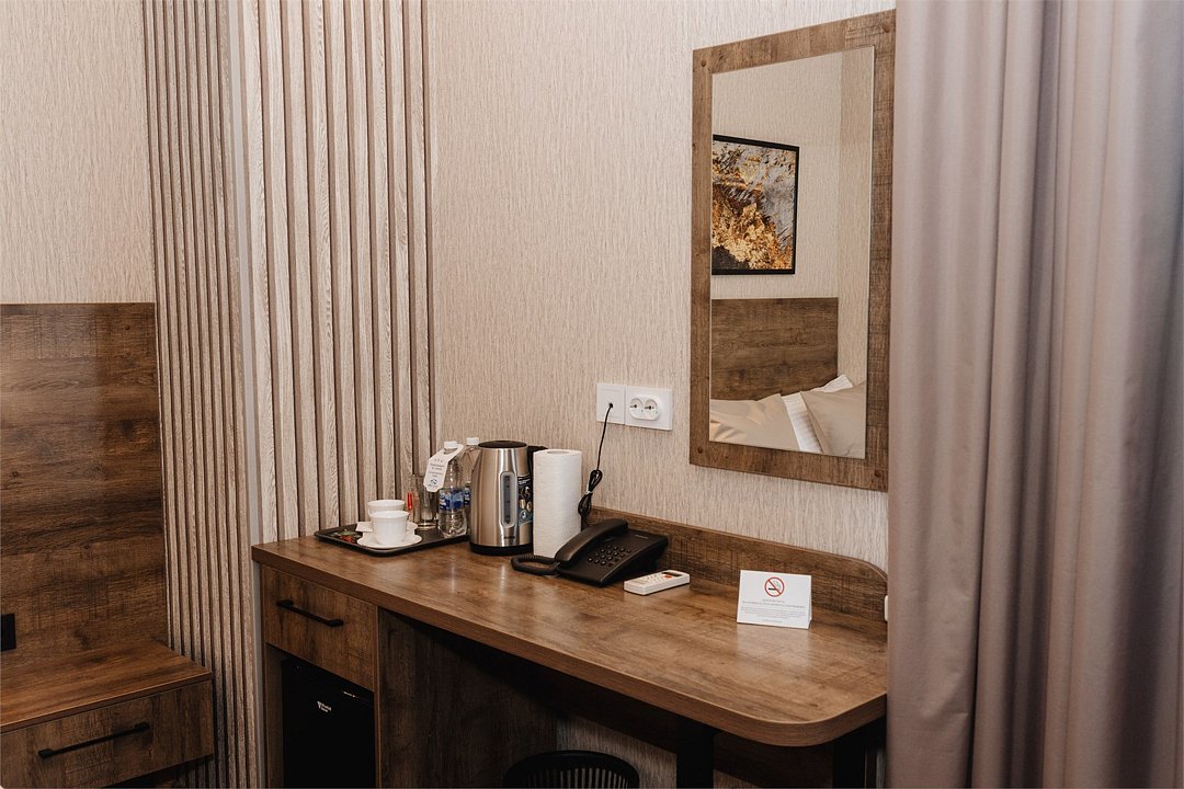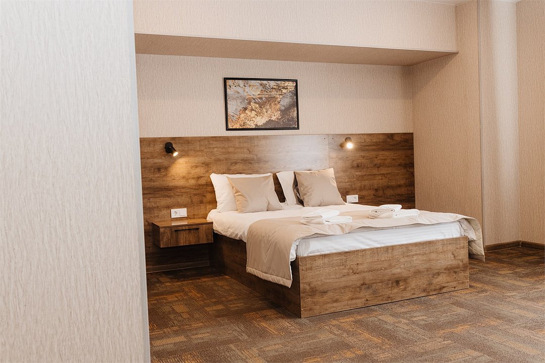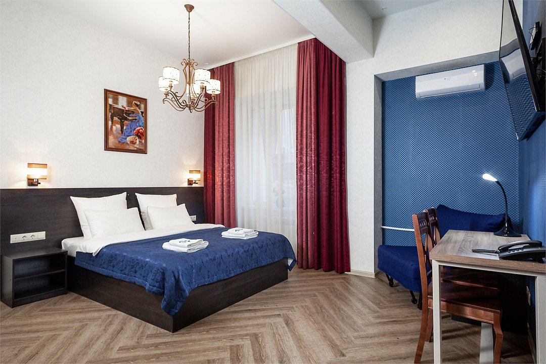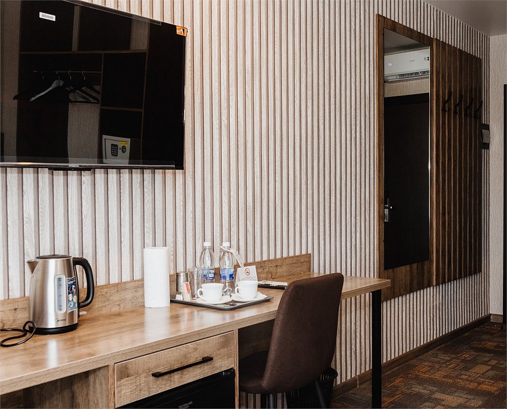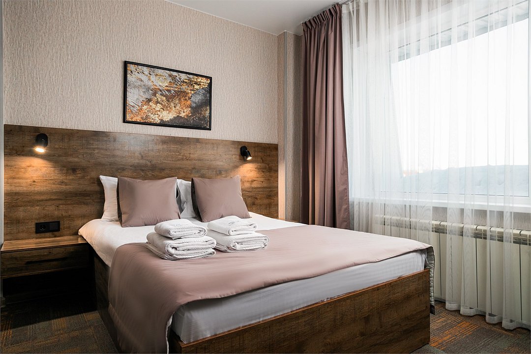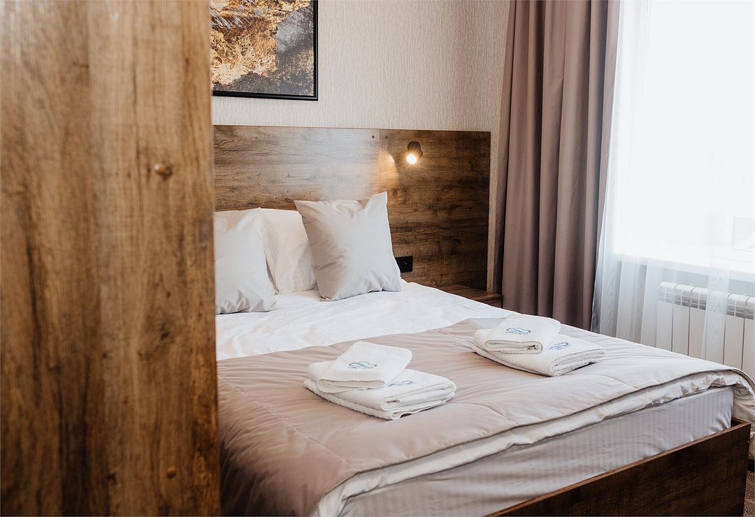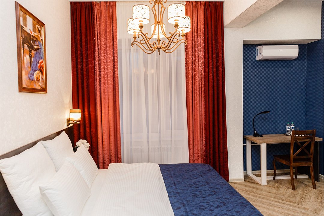 Стандартный номер с двуспальной кроватью. Кровать оснащена ортопедическим матрасом, шторы black-out из светонепроницаемого материала создадут в номере уютный полумрак. Сигнал Wi-Fi достаточно мощный для загрузки программ или просмотра фильмов онлайн на плазменном 42 дюймовом телевизоре. Централизованная система кондиционирования отеля поддерживает комфортную температуру в номерах круглый год.Услуги и удобства