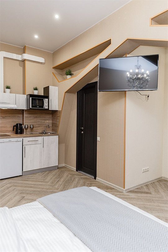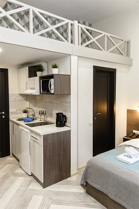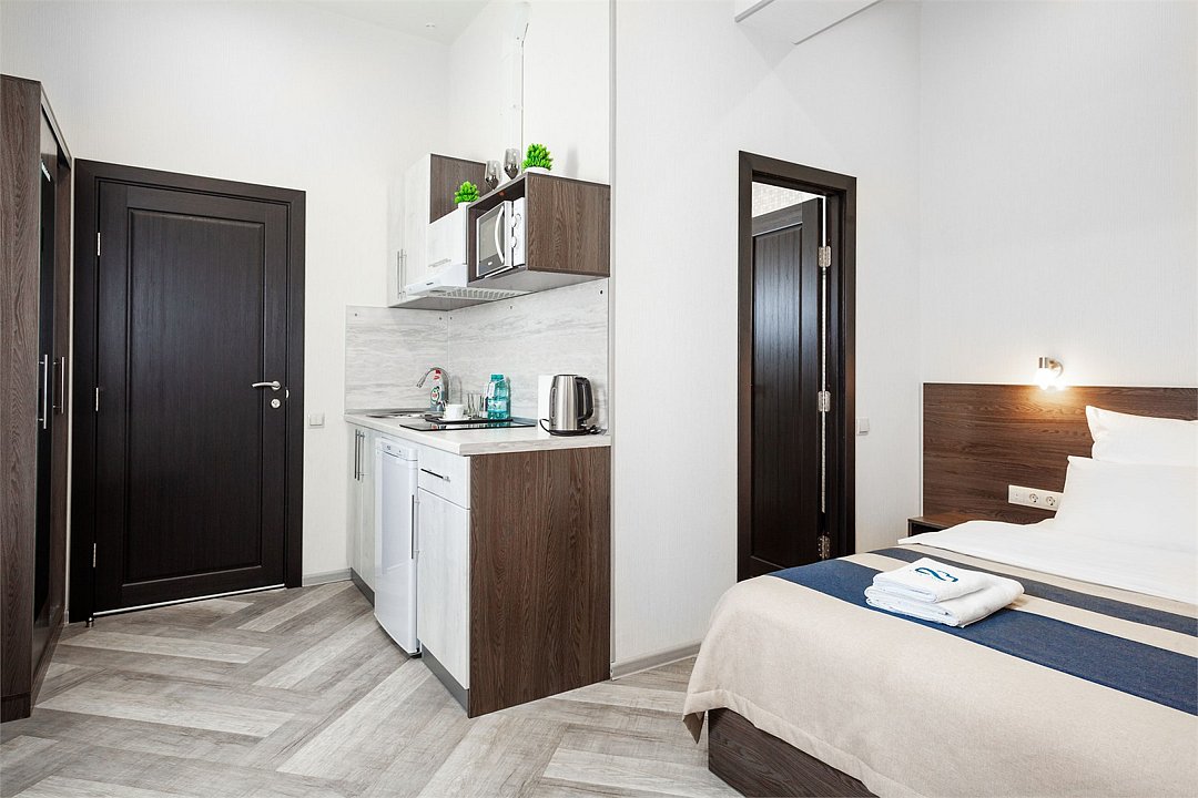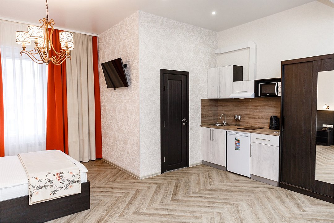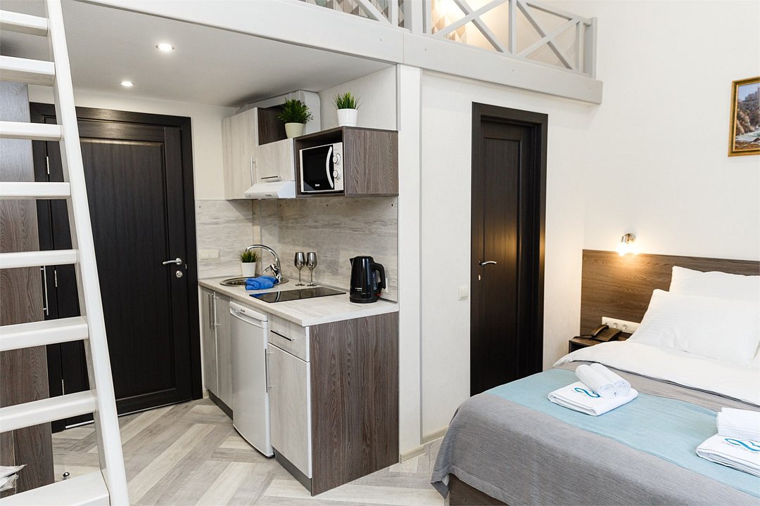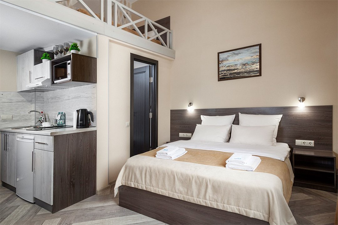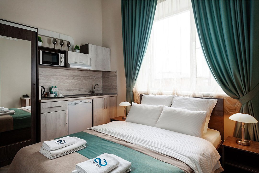 Просторный номер (35 кв.м.) с мини-кухней, рабочей зоной и двуспальной кроватью. Белье из шелковистого сатина обеспечит прекрасный сон. В ванной комнате халат, тапочки, фен, косметика для душа. Кондиционер, холодильник, телевизор, чайник, посуда.Услуги и удобства
