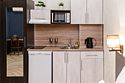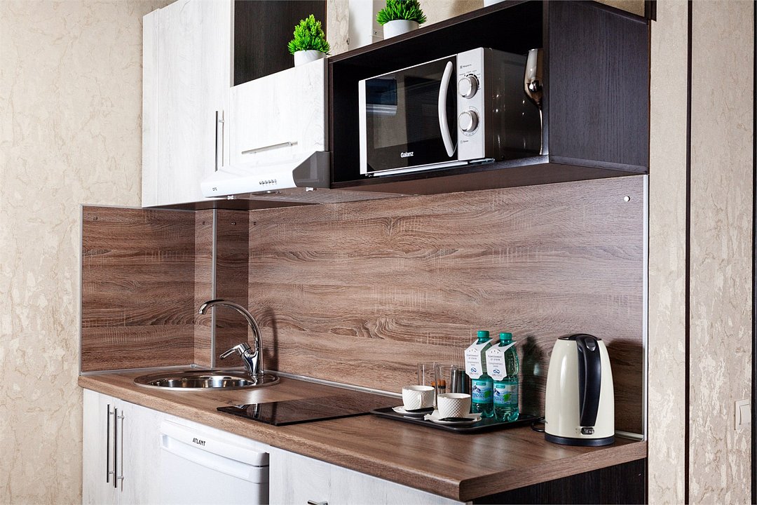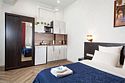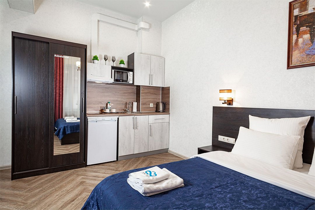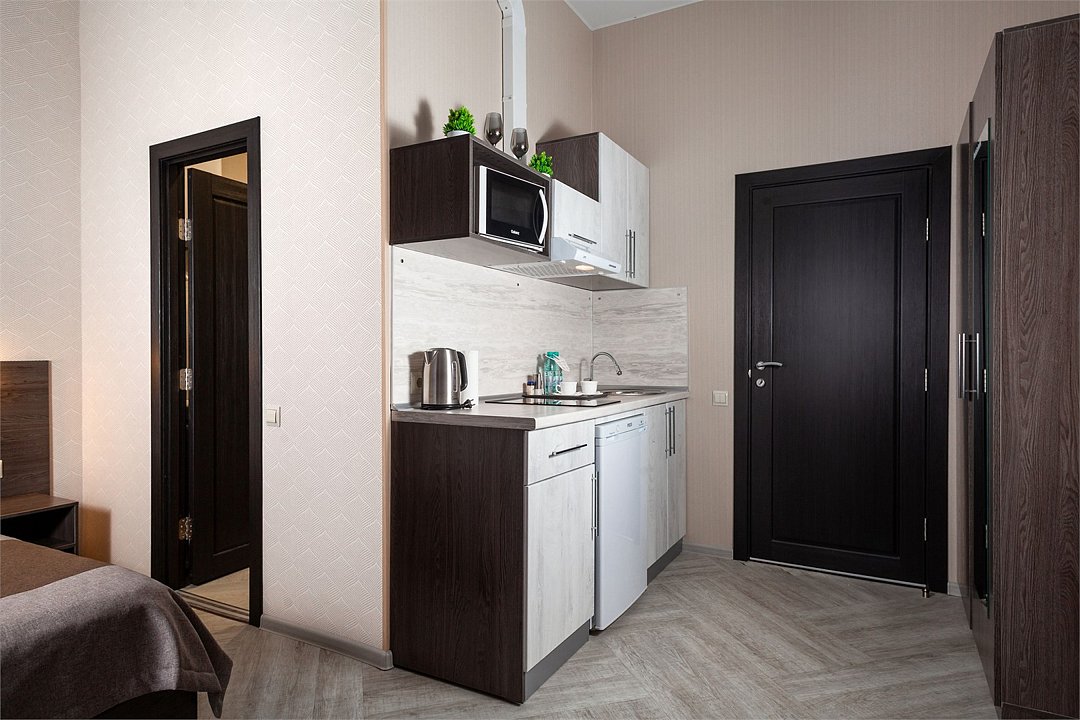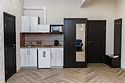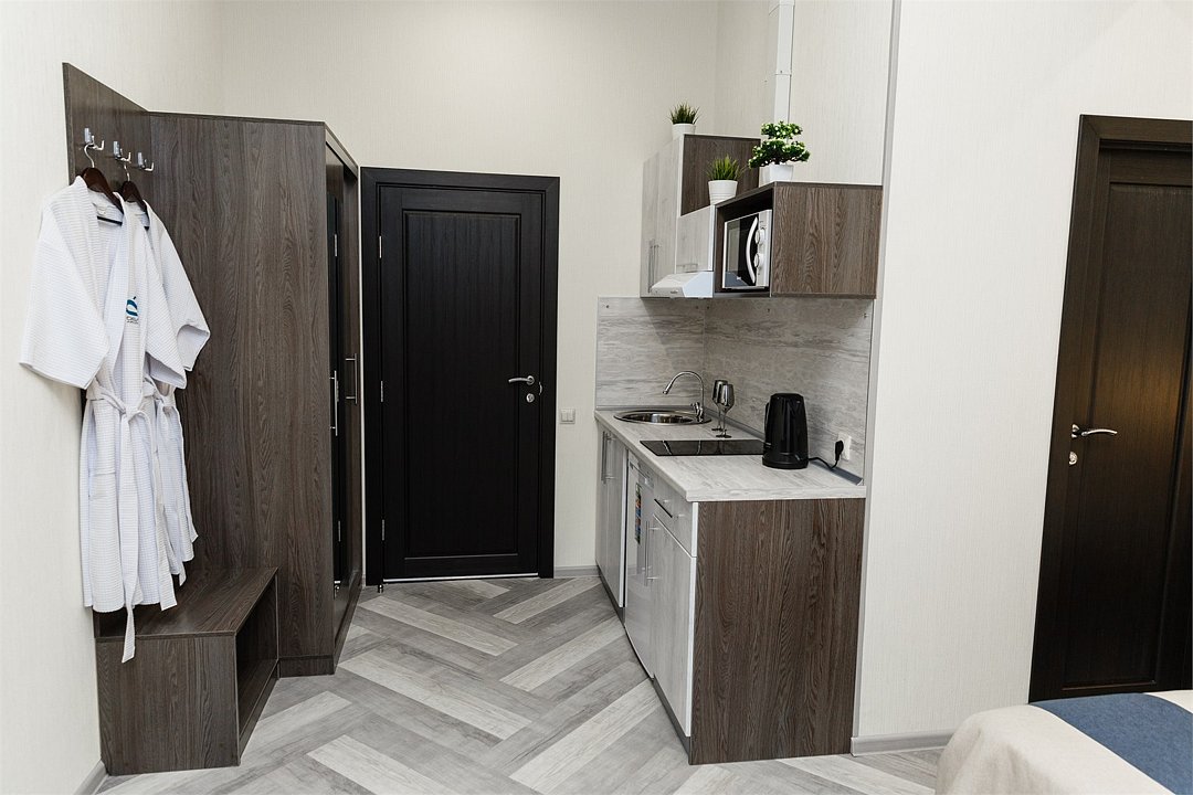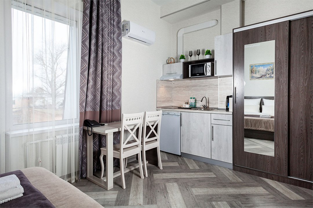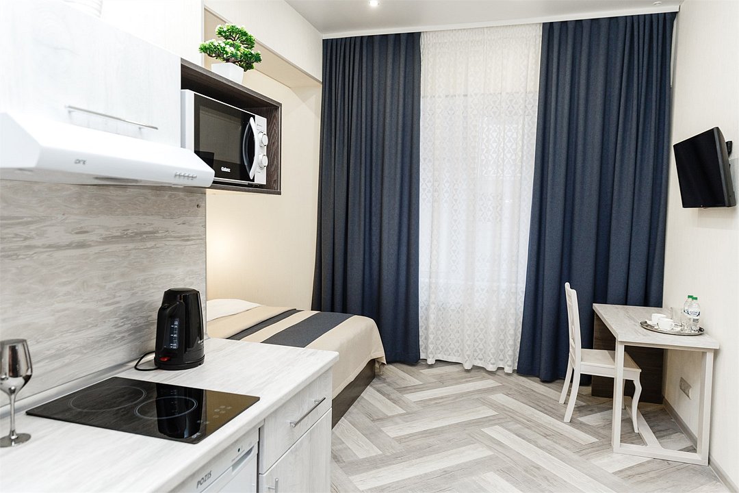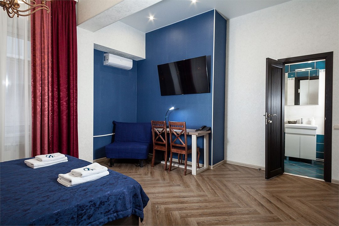 Просторный номер (35 кв.м.) с мини-кухней, рабочей зоной и двуспальной кроватью. Белье из шелковистого сатина обеспечит прекрасный сон. В ванной комнате халат, тапочки, фен, косметика для душа. Кондиционер, холодильник, телевизор, чайник, посуда.Услуги и удобства