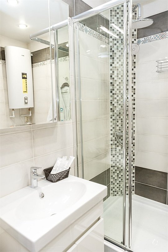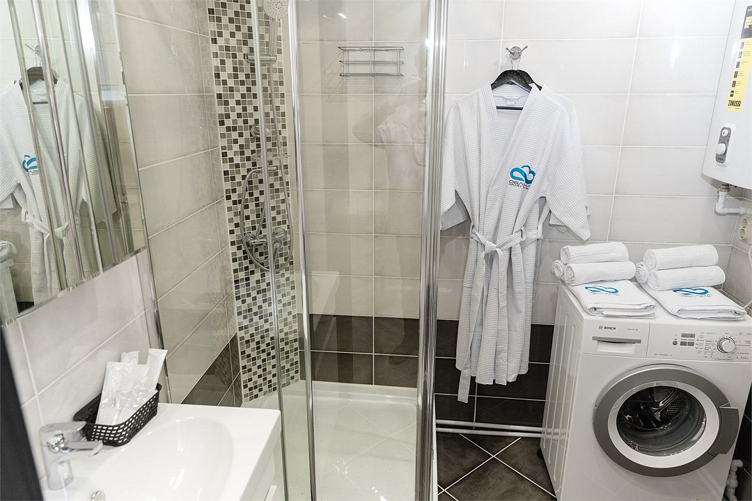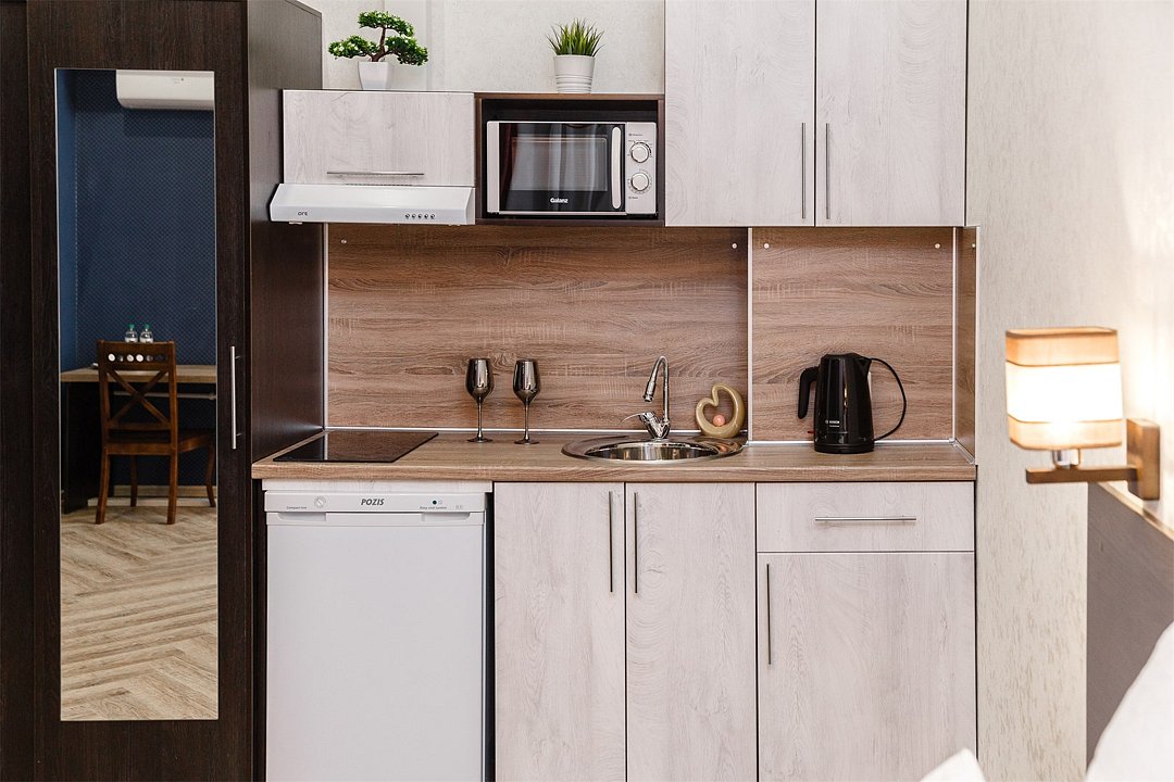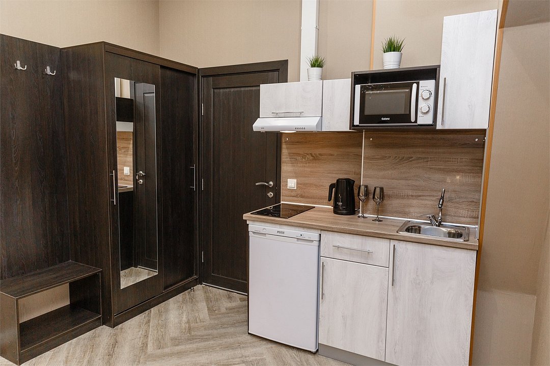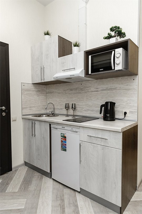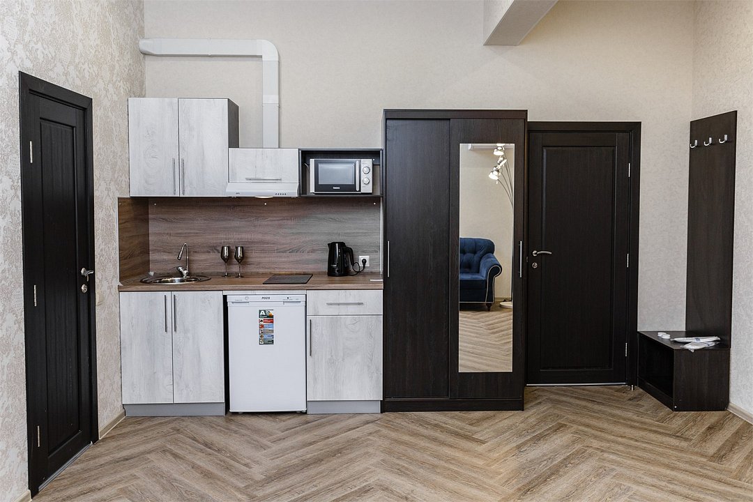 Wi-Fi, холодильник, кондиционер, фен, микроволновая печь, душевая кабина, халаты, банные полотенца, тапочки, гигиенические средства, косметические средства, двуспальная кровать, гладильная доска, тумбы, стулья, шкаф для одежды, вешалки, письменный стол, зеркало, звуконепроницаемые стены и окна, набор посуды, обслуживание номеров, чайник, унитаз, раковина, питьевая вода, отопление, вид во двор, ламинат, высокие потолки, кухонная посуда, стаканы, кухонная утварь, столовые приборы, стул, стол, туалетные средства, сушилка для белья, цифровое тв, внутренний телефон, телевизор с плоским экраном, мини-кухня, шкаф-купе, номер для некурящих, холодильный шкаф, можно с питомцамиВ номере