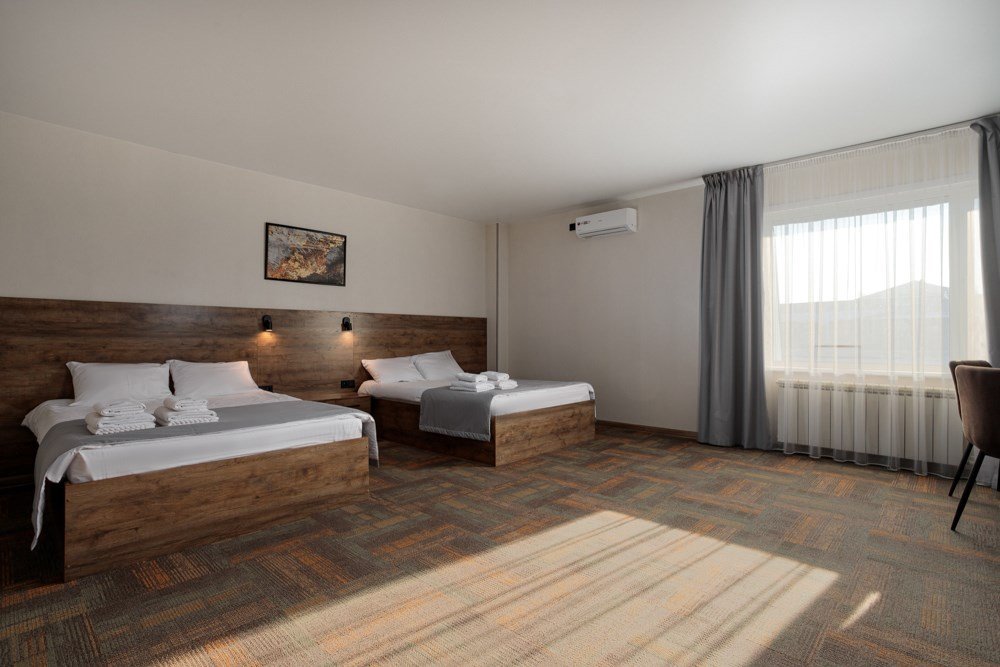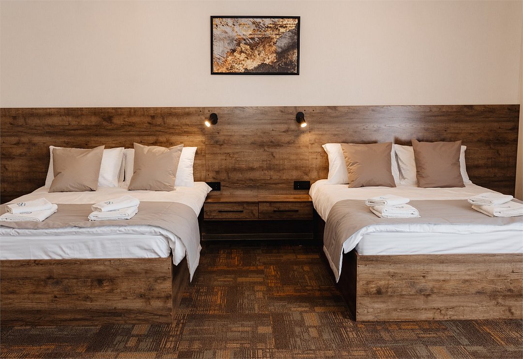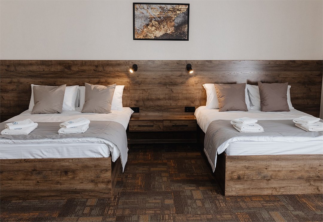 Стандартный номер с двумя двуспальными кроватями. Кровати оснащены ортопедическими матрасами, шторы black-out из светонепроницаемого материала создадут в номере уютный полумрак. Сигнал Wi-Fi достаточно мощный для загрузки программ или просмотра фильмов онлайн на плазменном 42 дюймовом телевизоре. Централизованная система кондиционирования отеля поддерживает комфортную температуру в номерах круглый год.Услуги и удобства
