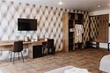 Уютный современный номер (25 кв.м). В номере одна двуспальная кровать, кондиционер, телевизор, холодильник, рабочий стол, ванная комната с душевой кабиной и косметическими средствами, фен, тапочки, халат. Удобная кровать и белье из шелковистого сатина обеспечат прекрасный сон.Услуги и удобства