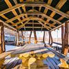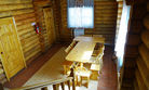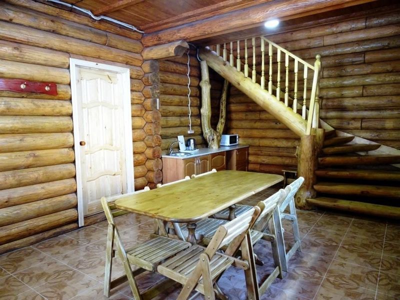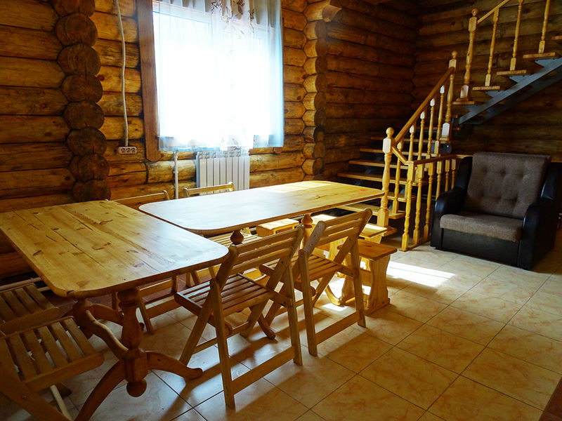 Внутри универсальный гриль для приготовления мяса, птицы и рыбы, скамейки и столик. В домике проведены электричество и свет.