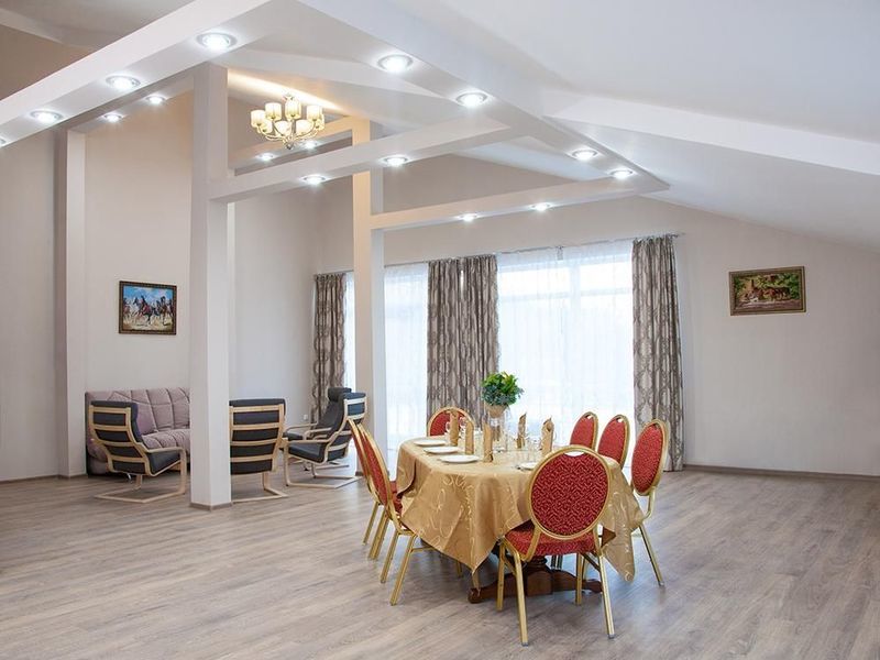 Просторный и уютный зал, рассчитанный на 50 человек. Имеет выход на большую балконную террасу. Отличная площадка для проведения корпоративов, свадеб, юбилеев. А по выходным здесь кормят вкусными завтраками.