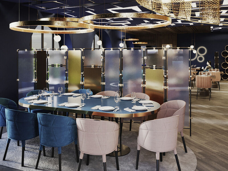 Интерьер ресторана VOSTOK навеян тематикой и образами космодрома Восточный, расположенного в Амурской области. В ресторане подают блюда славянской и восточной кухни.