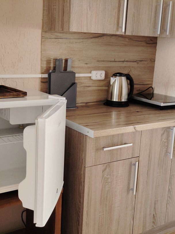 Номер оснащён:двуспальная и односпальная кровать, шкаф, телевизор, кондиционер. Мини-кухня: стол тумба, мини-холодильник, одноконфорочная индукционная плита, чайник, посуда (столовые приборы, кружки, тарелки, кастрюля, сковорода).
