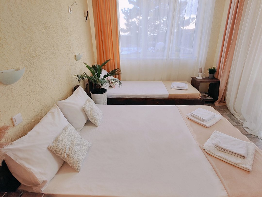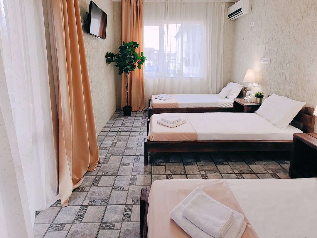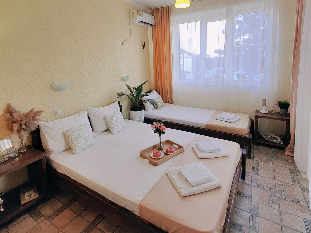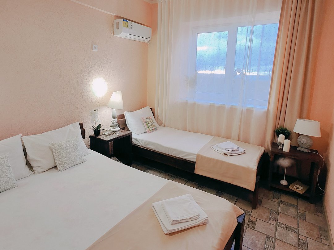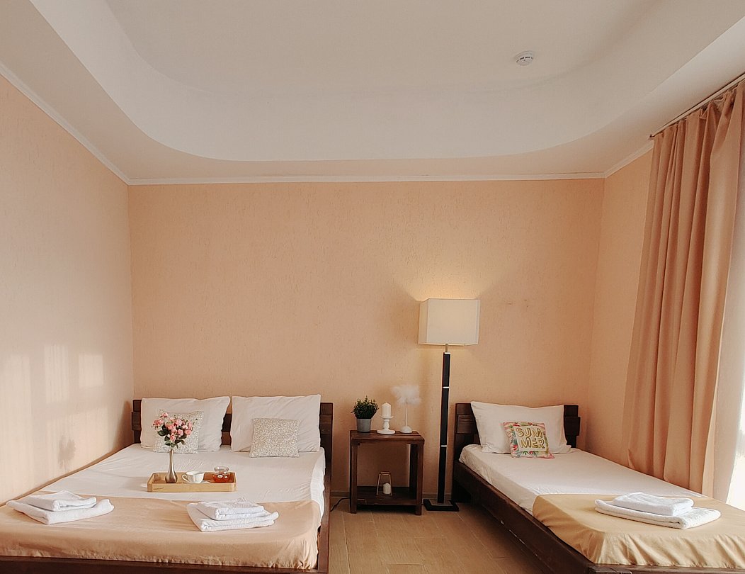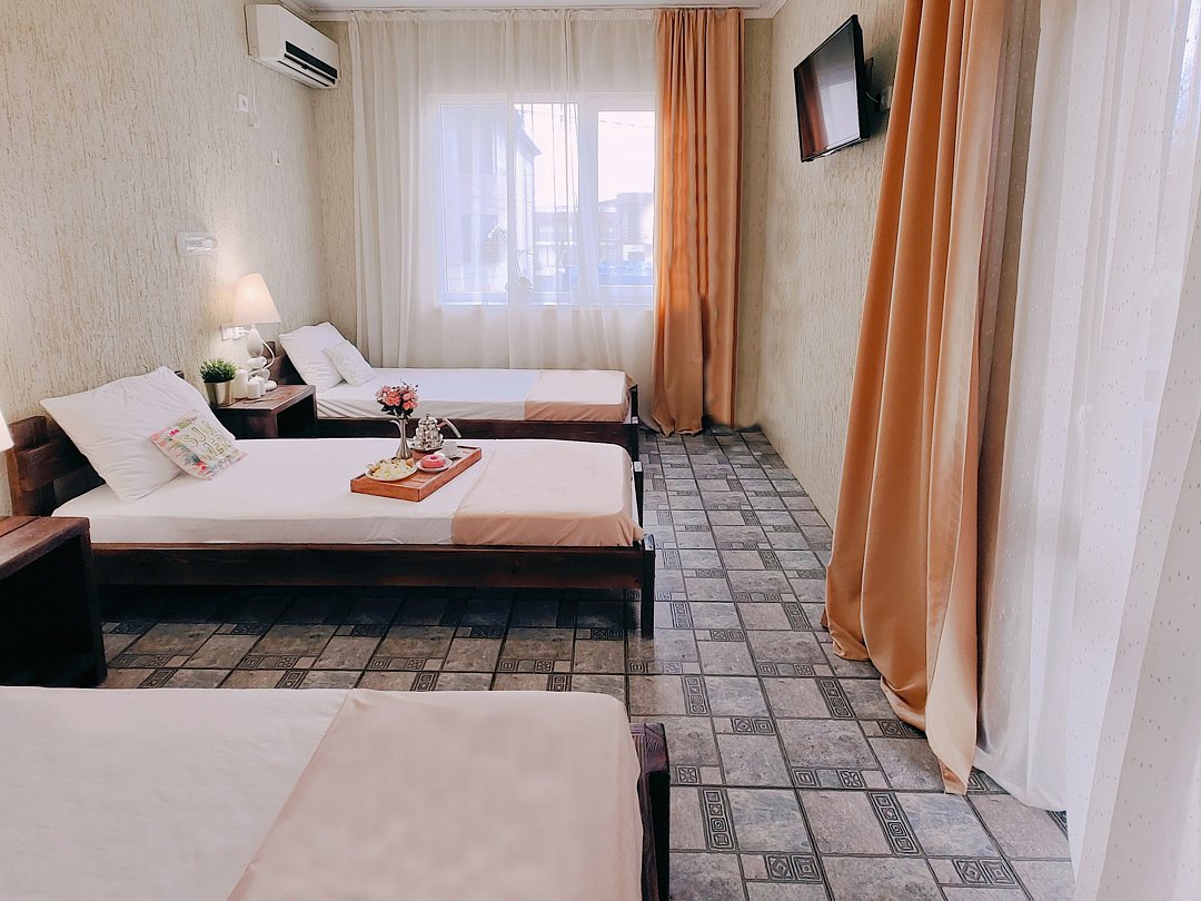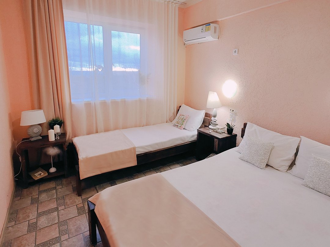 Номер оснащен: двуспальная кровать и односпальная кровать ,шкаф, телевизор, кондиционер, мини-холодильник, чайник.