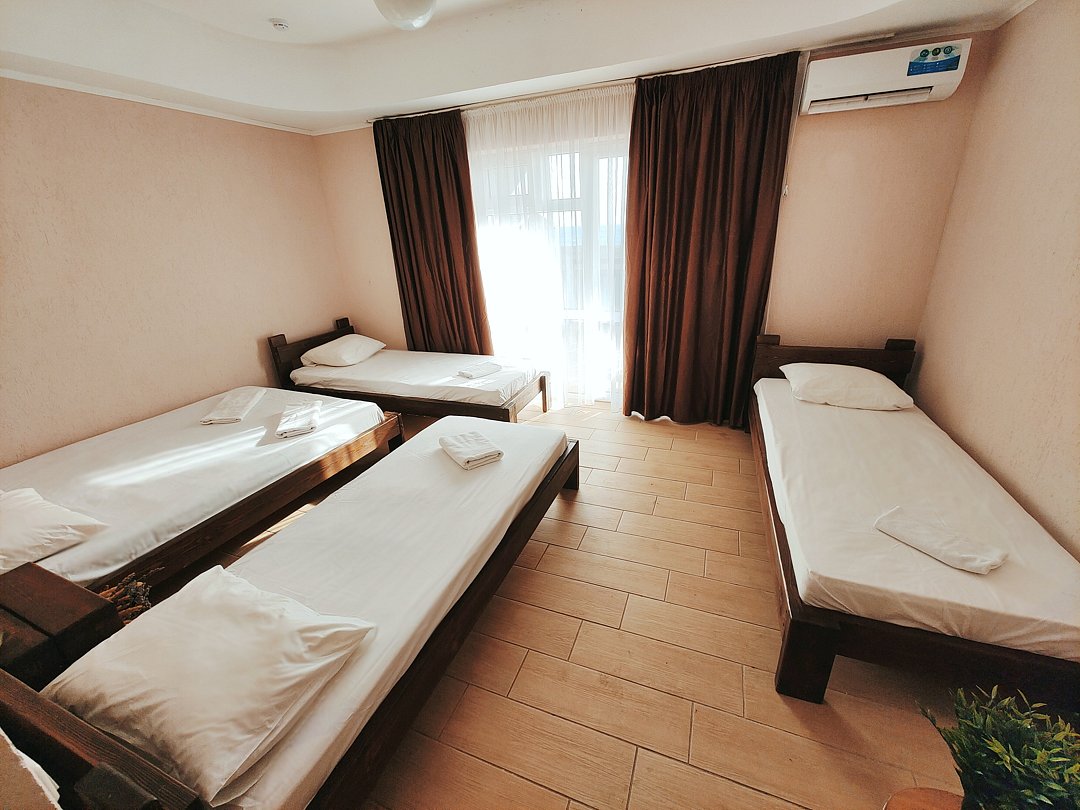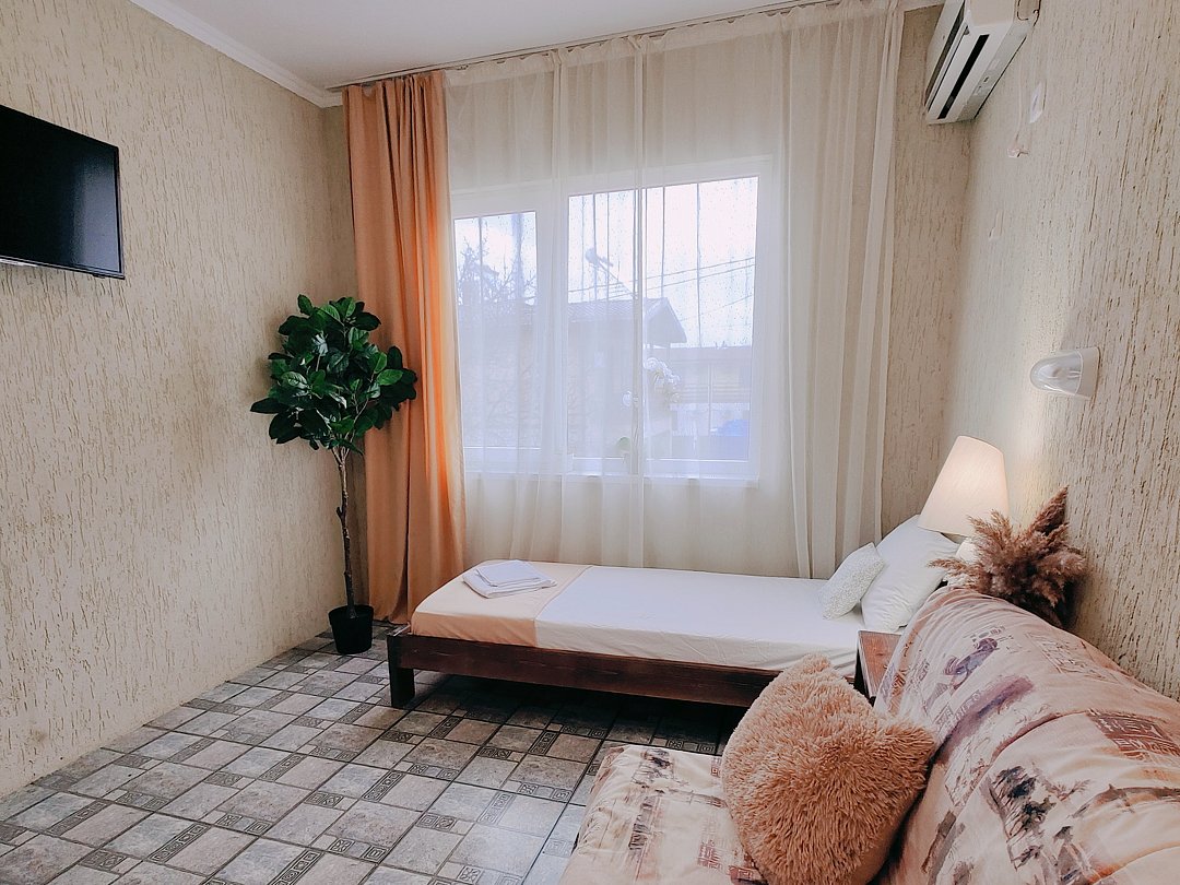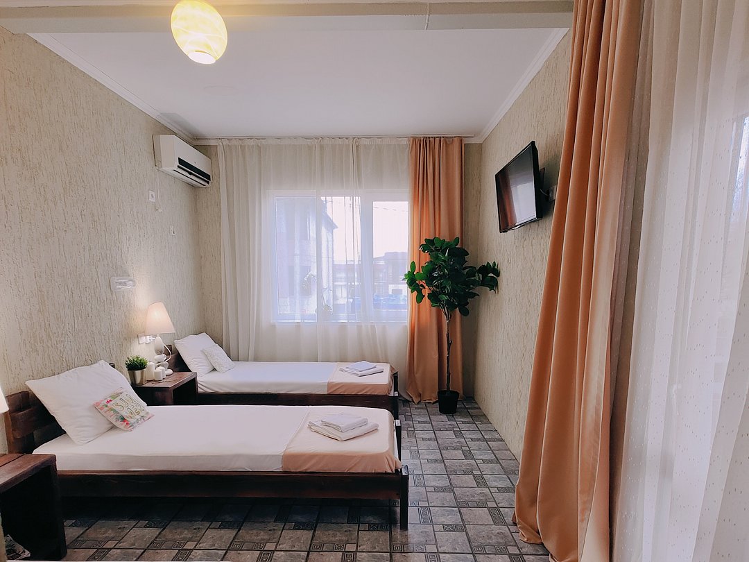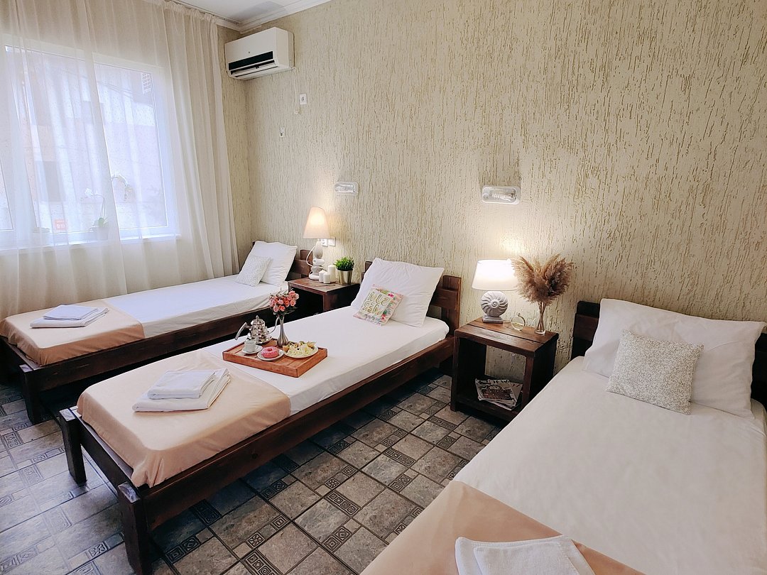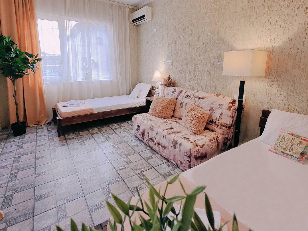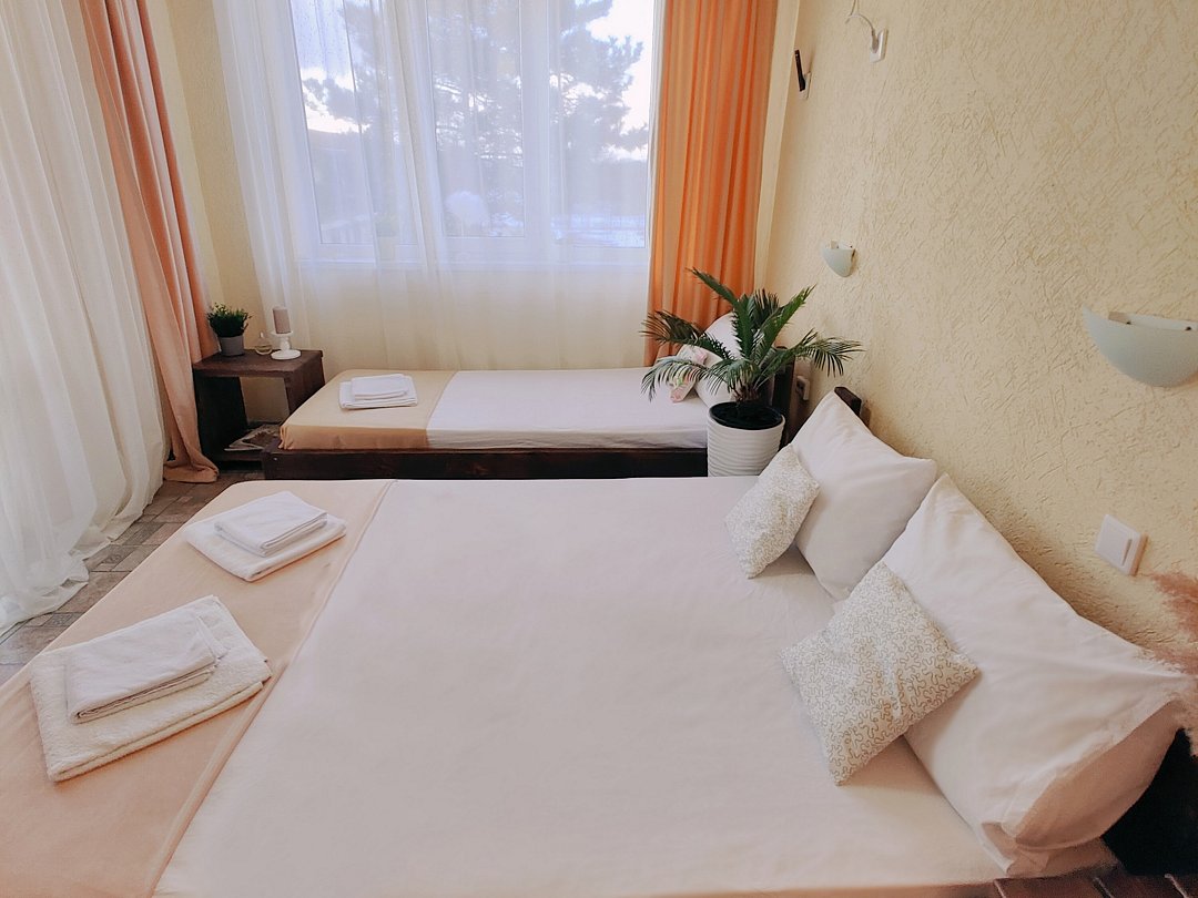 Номер оснащен: двуспальная кровать и односпальная кровать ,шкаф, телевизор, кондиционер, мини-холодильник, чайник.