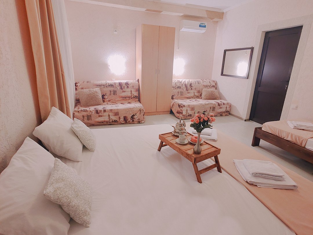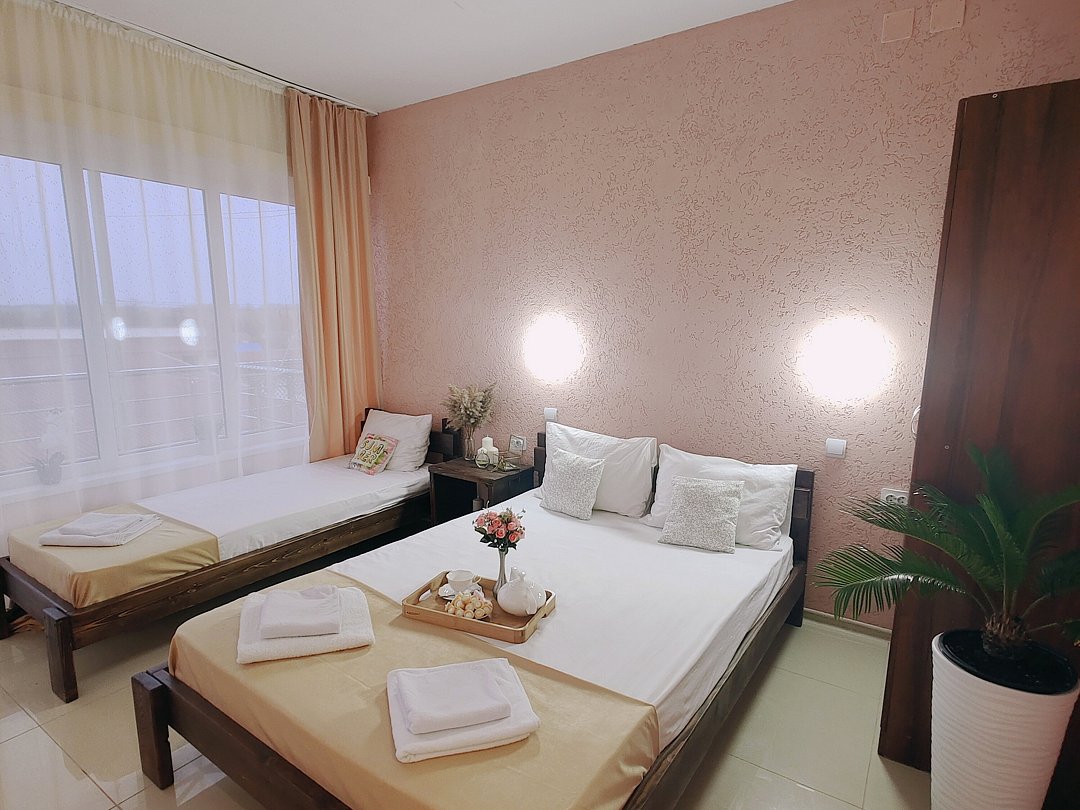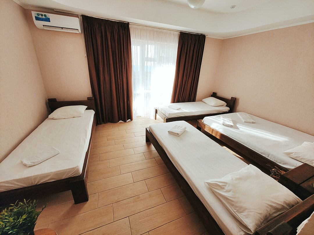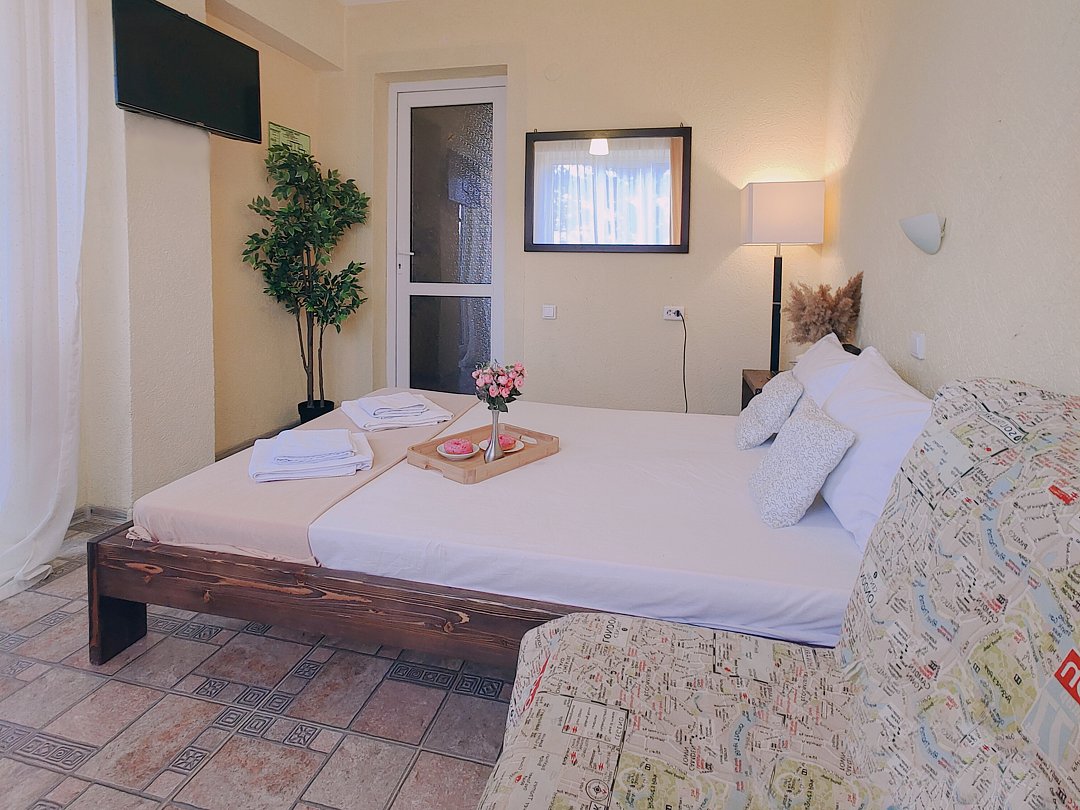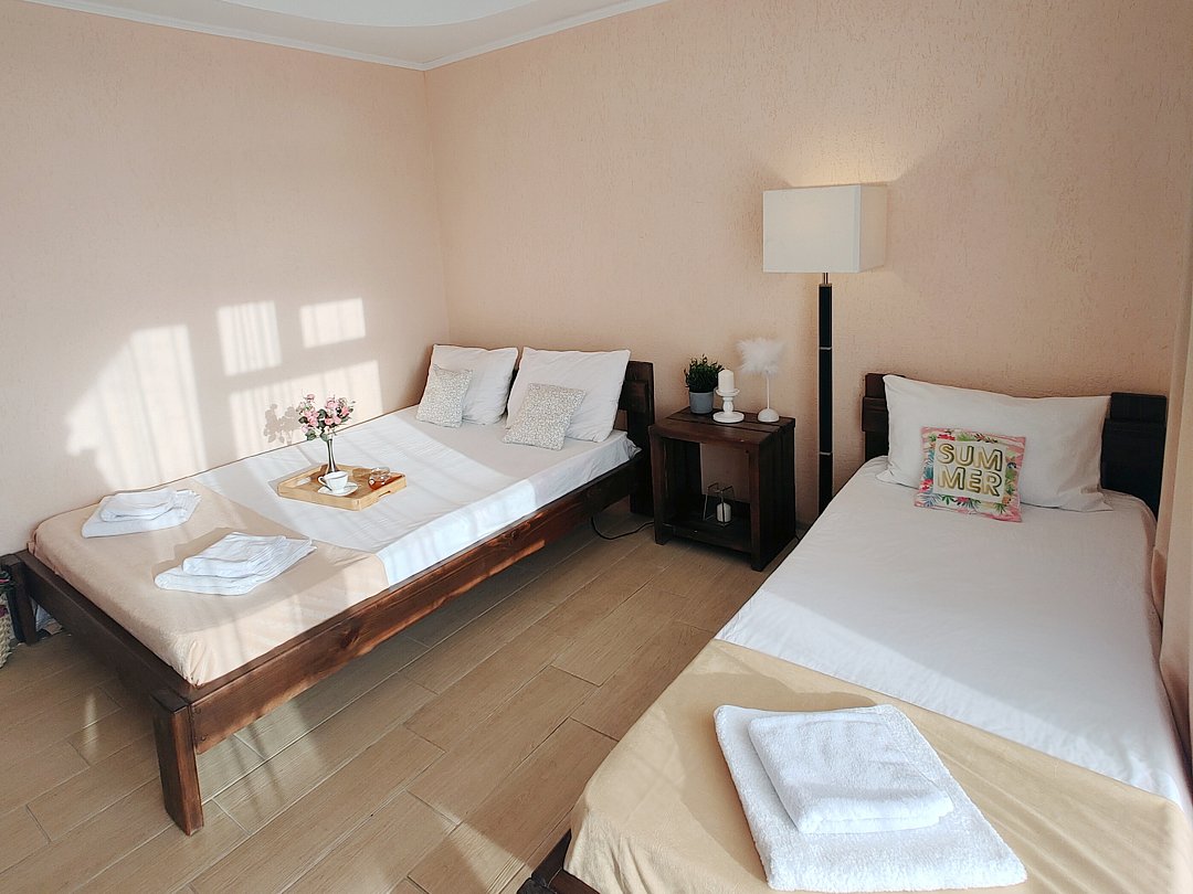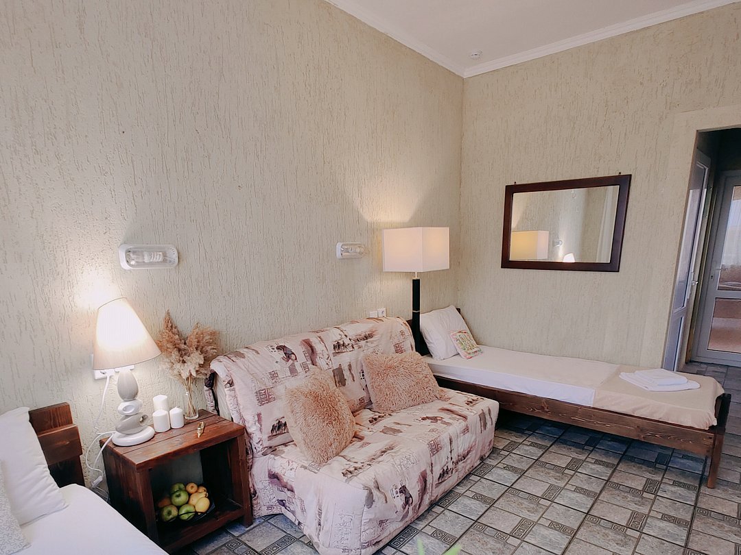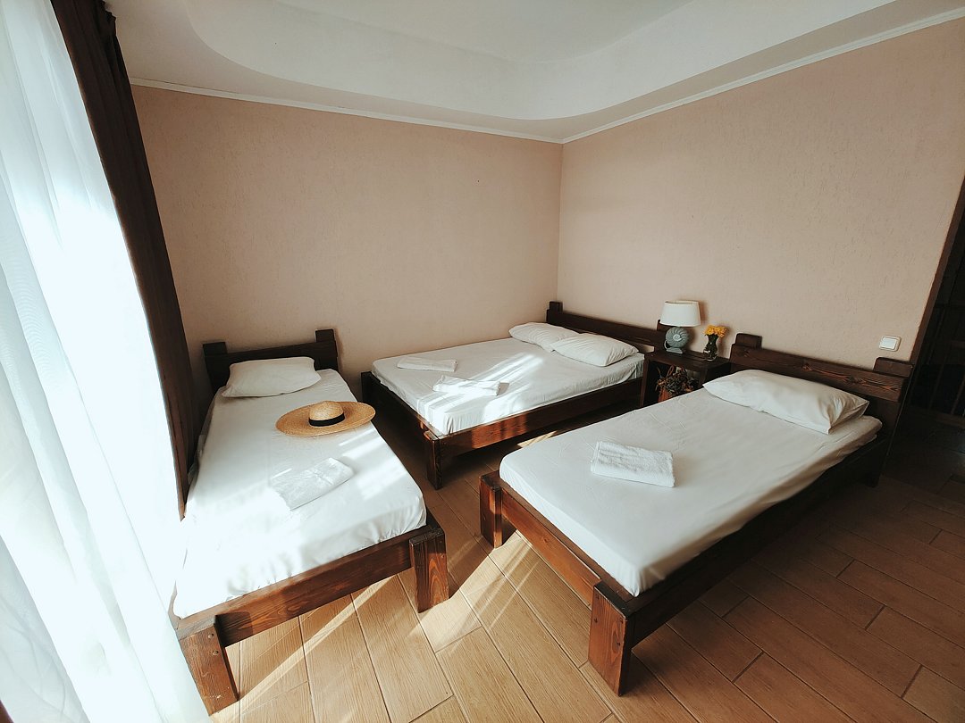Номер оснащен: двуспальная кровать и односпальная кровать ,шкаф, телевизор, кондиционер, мини-холодильник, чайник.