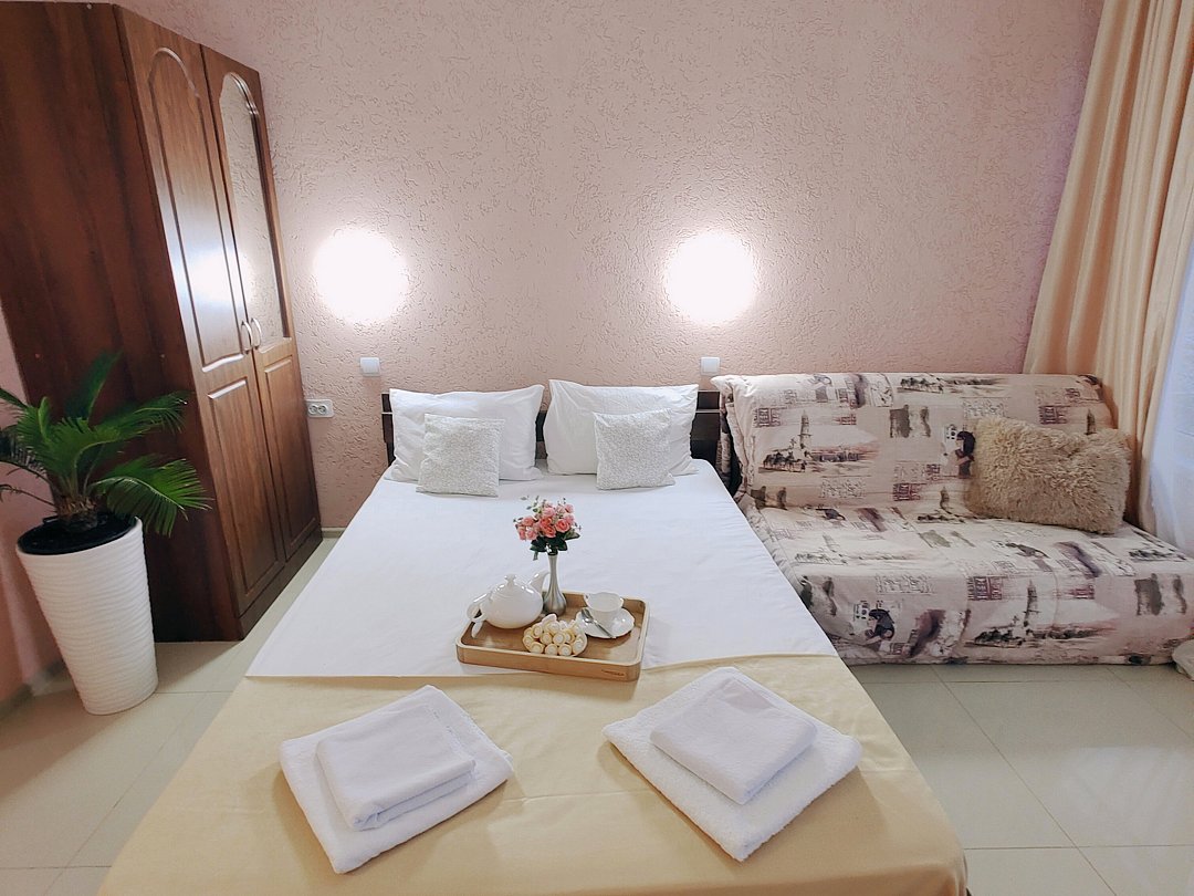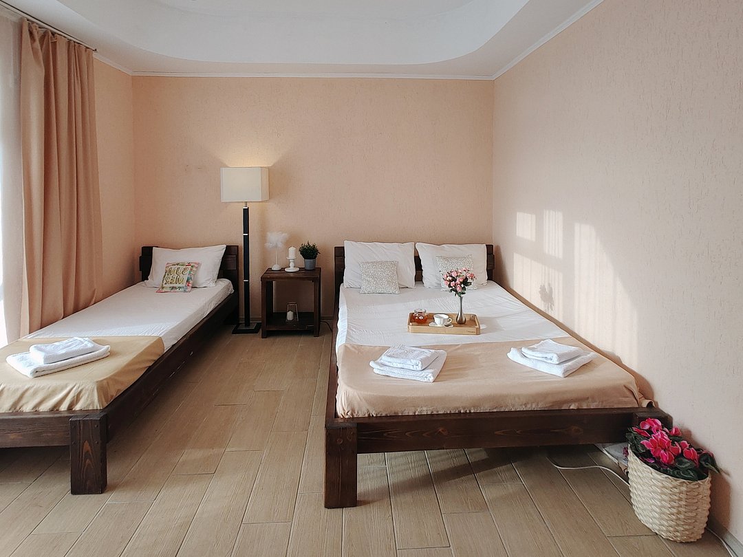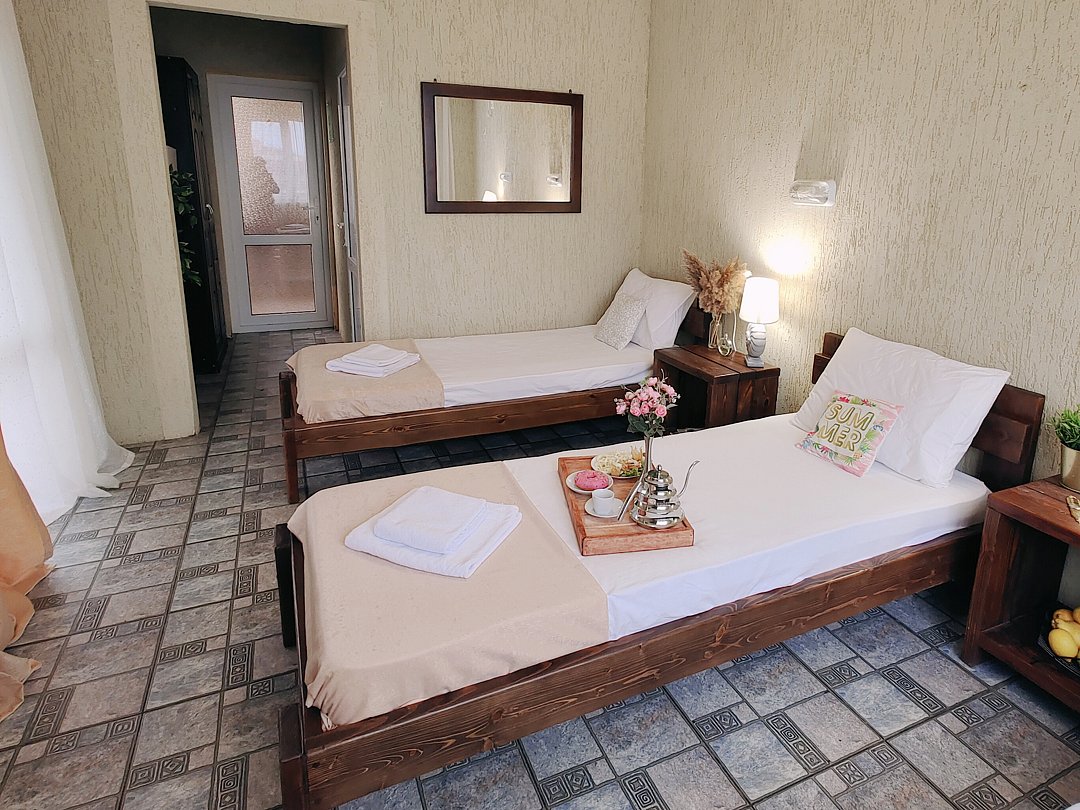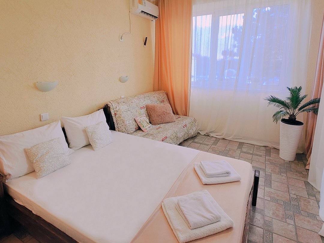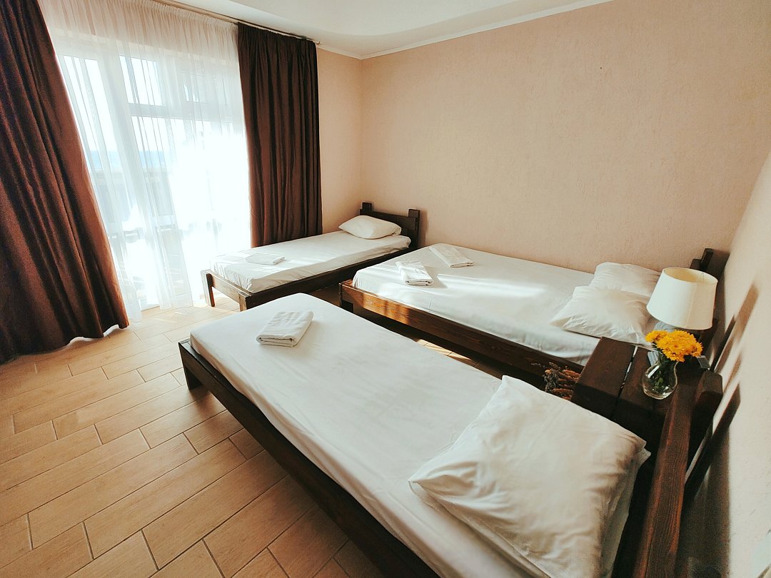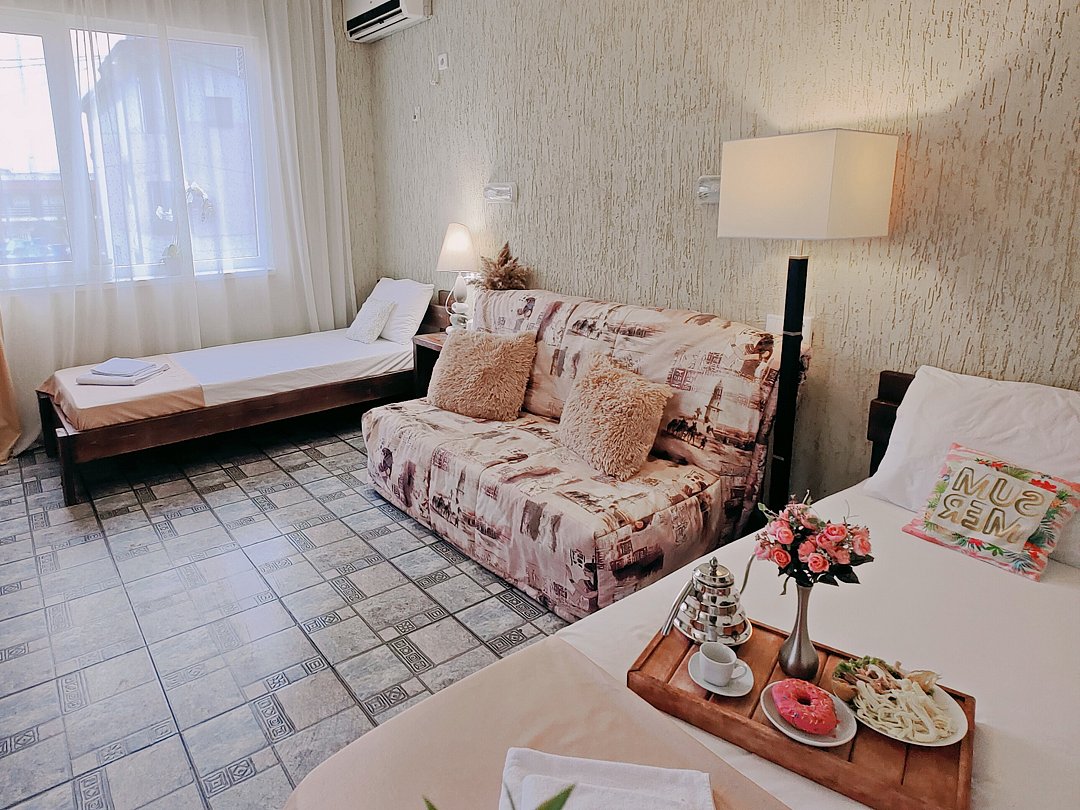 Номер оснащен: двуспальная кровать и односпальная кровать ,шкаф, телевизор, кондиционер, мини-холодильник, чайник.